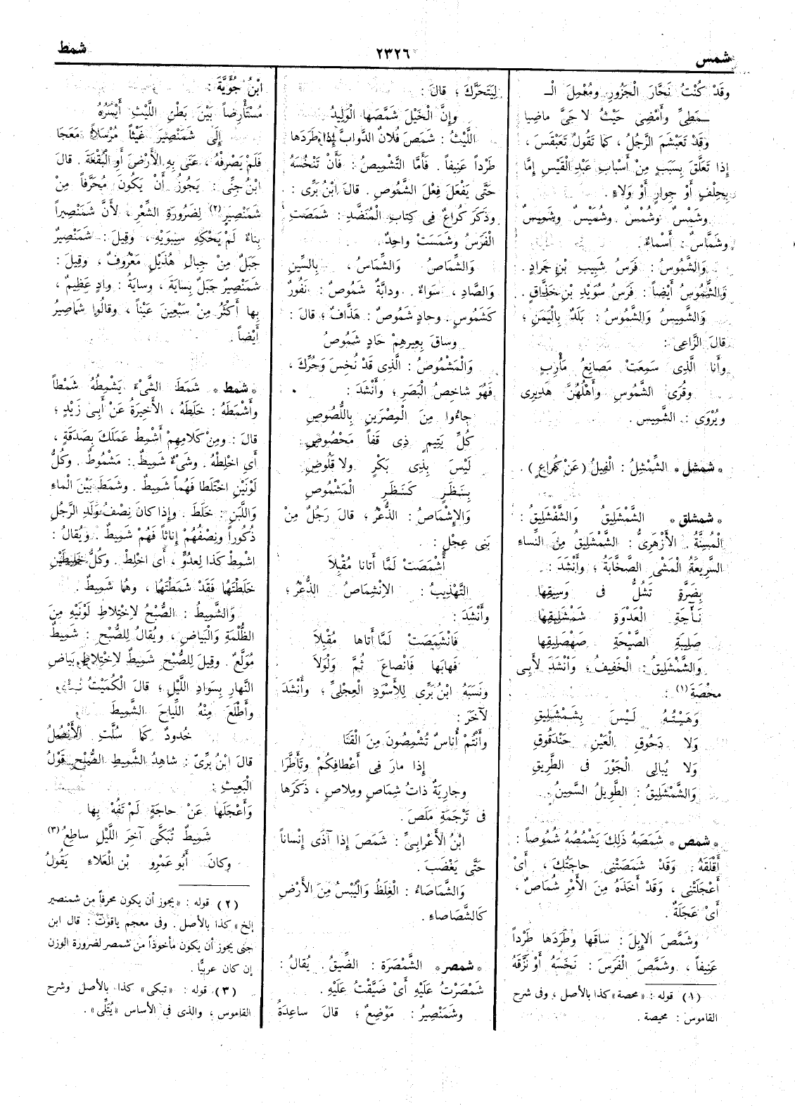 ( شمشل ) الشِّمشِل الفِيلُ عن كراع ( شمشلق ) الشَّمْشَلِيقُ والشَّفْشَلِيقُ المُسِنّةُ الأَزهري الشَّمْشَلِيقُ من النساء السريعةُ المشي الصَّخَّابةُ وأَنشد بضَرّةٍ تَشُلُّ في وَسِيِقها نَأْآجةِ العَدْوَةِ شَمْشَلِيقِها صَلِيبةِ الصَّيْحة صَهْصَلِيقِها والشَّمْشَلِيقُ الخفيف وأنشد لأبي محصة ( ) ( قوله « محصة » كذا بالأصل وفي شرح القاموس محيصة )