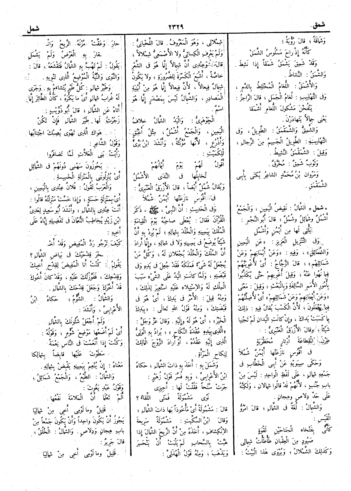 وشَماقةً قال رؤبة كأَنَّه إذ راحَ مَسْلُوسُ الشَّمَقْ وقد شَمِقَ يَشْمَقُ شَمَقاً إذا نَشِط والشَّمَقُ النشاط والأَشْمَق اللُّغام المختلط بالدم وفي التهذيب لُغام الجمل قال الراجز يَنْفُخْن مَشْكولَ اللُّغامِ أَشْمَقا يعني جمالاً يَتَهادَرْنَ والشِّمِقُّ والشَّمَقْمَقُ الطويلُ وفي التهذيب الطويلُ الجسيم من الرجال وقيل الشَّمَقْمَقُ النشيط وثوب شَمِقٌ مخرّق ومَرْوان بن محمد الشاعر يكنى بأَبى الشَّمَقْمَق( شمل ) الشِّمالُ نقيضُ اليَمِين والجمع أَشْمُلٌ وشَمائِل وشُمُلٌ قال أَبو النجم يَأْتي لها مِن أَيْمُنٍ وأَشْمُل وفي التنزيل العزيز عن اليَمين والشمائل وفيه وعن أَيمانهم وعن شَمائلهم قال الزجاج أَي لأُغْوِيَنَّهم فيما نُهُوا عنه وقيل أُغْوِيهم حتى يُكَذِّبوا بأُمور الأُمم السالفة وبالبَعْث وقيل عنى وعن أَيمانهم وعن شمائلهم أَي لأُضِلَّنَّهُم فيما يعملون لأَن الكَسْب يقال فيه ذلك بما كَسَبَتْ يَداك وإِن كانت اليَدان لم تَجْنِيا شيئاً وقال الأَزْرَق العَنْبري طِرْنَ انْقِطاعَةَ أَوتارٍ مُحَظْرَبَةٍ في أَقْوُسٍ نازَعَتْها أَيْمُنٌ شُمُلا وحكى سيبويه عن أَبي الخطاب في جمعه شِمال على لفظ الواحد ليس من باب جُنُب لأَنهم قد قالوا شِمالان ولكِنَّه على حَدِّ دِلاصٍ وهِجانٍ والشِّيمالُ لغة في الشِّمال قال امرؤ القيس كأَني بفَتْخاء الجَناحَيْن لَقْوَةٍ صَيُودٍ من العِقْبان طَأْطَأْتُ شِيمالي وكذلك الشِّمْلال ويروى هذا البيت شِمْلالي وهو المعروف قال اللحياني ولم يعرف الكسائي ولا الأَصمعي شِمْلال قال وعندي أَن شِيمالاً إِنما هو في الشِّعْر خاصَّةً أَشْبَع الكسرة للضرورة ولا يكون شِيمالٌ فِيعالاً لأَن فِيعالاً إِنما هو من أَبنية المصادر والشِّيمالُ ليس بمصدر إِنما هو اسم الجوهري واليَدُ الشِّمال خلاف اليَمِين والجمع أَشْمُلٌ مثل أَعْنُق وأَذْرُع لأَنها مؤنثة وأَنشد ابن بري للكميت أَقُولُ لهم يَوْمَ أَيْمانُهُم تُخايِلُها في النَّدى الأَشْمُلُ ويقال شُمُلٌ أَيضاً قال الأَزرق العَنْبَري في أَقْوُسٍ نازعَتْها أَيْمُنٌ شُمُلا وفي الحديث أَن النبي صلى الله عليه وسلم ذكر القرآن فقال يُعْطى صاحِبُه يومَ القيامة المُلْكَ بيمينه والخُلْدَ بشماله لم يُرِدْ به أَن شيئاً يُوضَع في يمينه ولا في شِماله وإِنما أَراد أَن المُلْك والخُلْد يُجْعَلان له وكلُّ من يُجْعَل له شيء فمَلَكَه فقد جُعِل في يَدِه وفي قَبْضته ولما كانت اليَدُ على الشيء سَبَبَ المِلْك له والاستيلاء عليه اسْتُعِير لذلك ومنه قيل الأَمْرُ في يَدِك أَي هو في قبضتك ومنه قول الله تعالى بِيَدِه الخَيْرُ أَي هو له وإِلَيْه وقال عز وجل الذي بِيَدِه عُقْدَةُ النِّكاح يراد به الوَليُّ الذي إِليه عَقْدُه أَو أَراد الزَّوْجَ المالك لنكاح المرأَة وشَمَلَ به أَخَذَ به ذاتَ الشِّمال حكاه ابن الأَعرابي وبه فسر قول زهير جَرَتْ سُنُحاً فَقُلْتُ لها أَجِيزِي نَوًى مَشْمُولةً فمَتى اللِّقاءُ ؟ قال مَشْمُولةً أَي مأْخُوذاً بها ذاتَ الشِّمال وقال ابن السكيت مَشْمُولة سريعة الانكشاف أَخَذَه من أَن الريحَ الشَّمال إِذا هَبَّت بالسحاب لم يَلْبَثْ أَن يَنْحَسِر ويَذْهب ومنه قول الهُذَلي حارَ وعَقَّتْ مُزْنَهُ الرِّيحُ وانْ قارَ بِهِ العَرْضُ ولم يشْمَلِ يقول لم تَهُبَّ به الشَّمالُ فَتَقْشَعَه قال والنَّوى والنِّيَّة الموضع الذي تَنْويه وطَيْرُ شِمالٍ كلُّ طير يُتَشاءَم به وجَرى له غُرابُ شِمالٍ أَي ما يَكْرَه كأَنَّ الطائر إِنما أَتاه عن الشِّمال قال أَبو ذؤيب زَجَرْتَ لها طَيْرَ الشِّمال فإِن تَكُنْ هَواك الذي تَهْوى يُصِبْك اجْتِنابُها وقول الشاعر رَأَيْتُ بَني العَلاّتِ لما تَضَافَرُوا يَحُوزُونَ سَهْمي دونهم في الشَّمائل أَي يُنْزِلُونَني بالمنزلة الخَسِيسة والعَرَب تقول فلان عِنْدي باليَمِين أَي بمنزلة حَسَنة وإِذا خَسَّتْ مَنْزِلَتُه قالوا أَنت عندي بالشِّمال وأَنشد أَبو