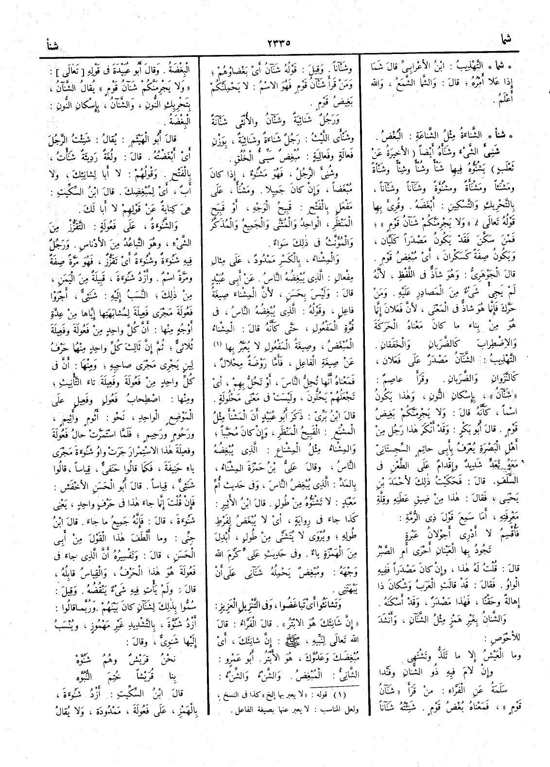 سلمة عن الفرّاءِ من قرأَ شَنَآنُ قوم فمعناهُ بُغْضُ [ ص 102 ] قومٍ شَنِئْتُه شَنَآناً وشَنْآناً وقيل قوله شَنآنُ أَي بَغْضاؤُهم ومَن قَرأَ شَنْآنُ قَوْم فهو الاسم لا يَحْمِلَنَّكم بَغِيضُ قَوْم ورجل شَنائِيةٌ وشَنْآنُ والأُنثى شَنْآنَةٌ وشَنْأَى الليث رجل شَناءة وشَنائِيةٌ بوزن فَعالةٍ وفَعالِية مُبْغِضٌ سَيِّىءُ الخُلقُ وشُنِئَ الرجلُ فهو مَشْنُوءٌ إِذا كان مُبْغَضاً وإِن كان جميلاً ومَشْنَأٌ على مَفْعَل بالفتح قبيح الوجه أَو قبيح المَنْظَر الواحد والمثنى والجميع والمذكر والمؤنث في ذلك سواءٌ والمِشْناءُ بالكسر ممدود على مِثالِ مِفْعالٍ الذي يُبْغِضُه الناسُ عن أَبي عُبيد قال وليس بِحَسن لأَن المِشْناءَ صيغة فاعل وقوله الذي يُبْغِضُه الناسُ في قوَّة المفعول حتى كأَنه قال المِشْناءُ المُبْغَضُ وصيغة المفعول لا يُعَبَّر بها ( 1 )