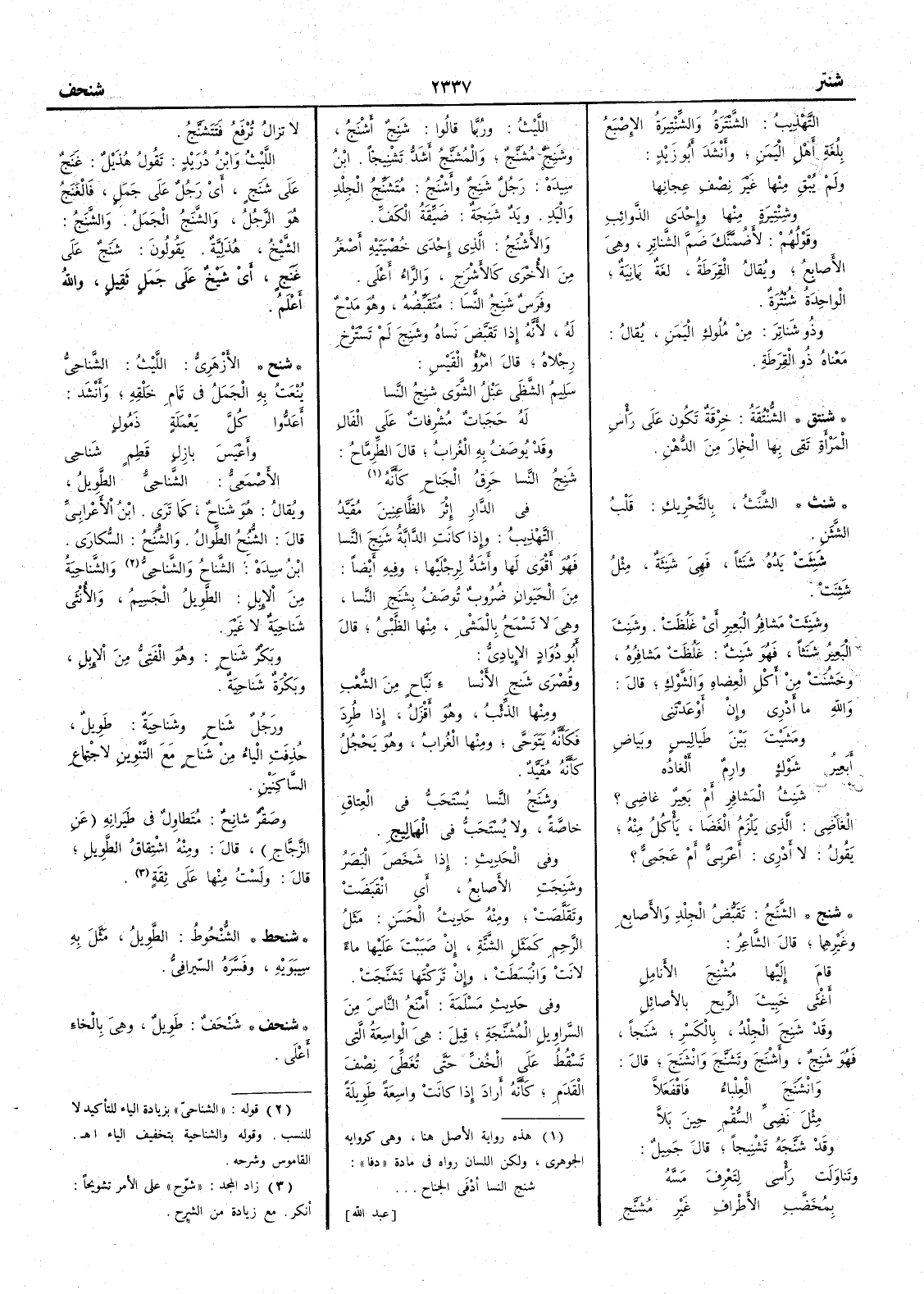 التهذيب الشَّنْتَرَةُ والشِّنْتِيرَةُ الإِصبع بلغة أَهل اليَمَن وأَنشد أَبو زيد ولم يبق منها غير نصف عِجانِها وشِنْتِيرَةٍ مِنها وإِحْدَى الذَّوائِبِ وقولهم لأَضُمَّنَّك ضَمَّ الشَّناتِر وهي الأَصابع ويقال القِرَطَة لغة يَمانِيَة الواحدة شنْتُرَة وذو شَناتِرَ من مُلوك اليَمَن يقال معناه ذُو القِرَطة ( شنتق ) الشُّنْتُقةُ خِرْقةٌ تكون على رأْس المرأَة تقي بها الخِمارَ من الدُّهْن ( شنث ) الشَّنَثُ بالتحريك قَلْبُ الشَّثَنِ شَنِثَتْ يدُه شَنَثاً فهي شَنِثةٌ مثل شَثِنَتْ وشَنِثَتْ مَشافرُ البعير أَي غَلُظَتْ وشَنِثَ البعيرُ شَنَثاً فهو شَنِثٌ غَلُظَتْ مَشافرُه وخَشُنَتْ من أَكل العِضاهِ والشَّوْك قال واللهِ ما أَدْري وإِنْ أَوْعَدْتَني ومَشَيْتَ بين طَيالِسٍ وبَياضِ أَبَعِيرُ شَوْكٍ وارمٌ أَلْغادُه شَنِثُ المَشافِرِ أَم بعيرٌ غاضي ؟ الغاضي الذي يَلْزَم الغَضا يأْكل منه يقول لا أَدري أَعربيٌّ أَم عجميٌّ ؟ ( شنج ) الشَّنَجُ تَقَبُّض الجِلْد والأَصابع وغيرهما قال الشاعر قامَ إِليها مُشنِج الأَنامِلِ أَغْثَى خَبِيث الرِّيح بالأَصائِلِ وقد شَنِجَ الجلد بالكسر شَنَجاً فهو شَنِجٌ وأَشْنَجَ وتَشَنَّجَ وانْشَنَجَ قال وانْشَنَجَ العِلْباءُ فاقْفَعَلاَّ مِثلَ نَضِيِّ السُّقْم حينَ بَلاَّ وقد شَنَّجَه تَشْنِيجاً قال جميل وتناوَلَتْ رأْسي لِتَعْرِفَ مَسَّه بِمُخَضَّبِ الأَطراف غير مُشَنَّجِ الليث وربما قالوا شَنِجٌ أَشْنَج وشَنِجٌ مُشَنَّج والمُشَنَّج أَشج تَشْنِيجاً ابن سيده رجل شَنِجٌ وأَشْنَج مُتَشَنِّجُ الجلد واليد ويد شَنِجَة ضيِّقة الكَفِّ والأَشْنَج الذي إِحدى خُصْيَتَيْه أَصغر من الأُخرى كالأَشْرَج والراء أَعلى وفَرَسٌ شَنِجُ النَّسا مُتقبِّضه وهو مدحٌ له لأَنه إِذا تَقَبَّض نَساه وشَنِج لم تسترخِ رجلاه قال امرؤ القيس سَلِيمُ الشَّظى عَبْلُ الشَّوى شَنِجُ النَّسا له حَجَباتٌ مُشْرِفاتٌ على الفَالِ وقد يوصف به الغُراب قال الطِّرمّاح شَنِجُ النَّسا حَرِقُ الجَناحِ كأَنه في الدارِ إِثْرَ الظَّاعنينَ مُقَيَّدُ التهذيب وإِذا كانت الدابة شَنِجَ النَّسا فهو أَقوى لها وأَشد لرجليها وفيه أَيضاً من الحيوان ضُرُوب توصف بِشَنَجِ النَّسا وهي لا تسمح بالمَشْي مِنها الظَّبْي قال أَبو دُواد الإِيادي وقُصْرى شَنِجِ الأَنْسا ءِ نَبَّاح من الشُّعْبِ ومنها الذئب وهو أَقْزَل إِذا طُرِد فكأَنه يَتَوَحَّى ومنها الغراب وهو يَحْجُِل كأَنه مُقَيَّد وشَنَجُ النَّسا يُستحب في العِتاق خاصَّة ولا يستحب في الهَماليج وفي الحديث إِذا شَخَص البصر وشَنِجَتِ الأَصابع أَي انقبضت وتقلَّصت ومنه حديث الحسَن مَثَل الرَّحِمِ كمثَل الشَّنَّة إِنْ صببت عليها ماء لانتْ وانبسطت وإِن تركتها تَشَنَّجَتْ وفي حديث مسلَمة أَمنعُ الناسَ من السَّراويل المُشَنَّجة قيل هي الواسعة التي تسقُط عن الخفِّ حتى تغطِّي نصف القدَم كأَنه أَراد إِذا كانت واسعة طويلة لا تزال تُرْفَع فَتَتَشَنَّج الليث وابن دريد تقول هُذَيل غَنَجٌ على شَنَجٍ أَي رجل على جمل فالغَنَج هو الرجل والشَّنَج الجمَل والشَّنَجُ الشَّيْخُ هذليَّة يقولون شيخ شَنَجٌ على غَنَجٍ أَي شيخ على جمل ثقيل والله أَعلم