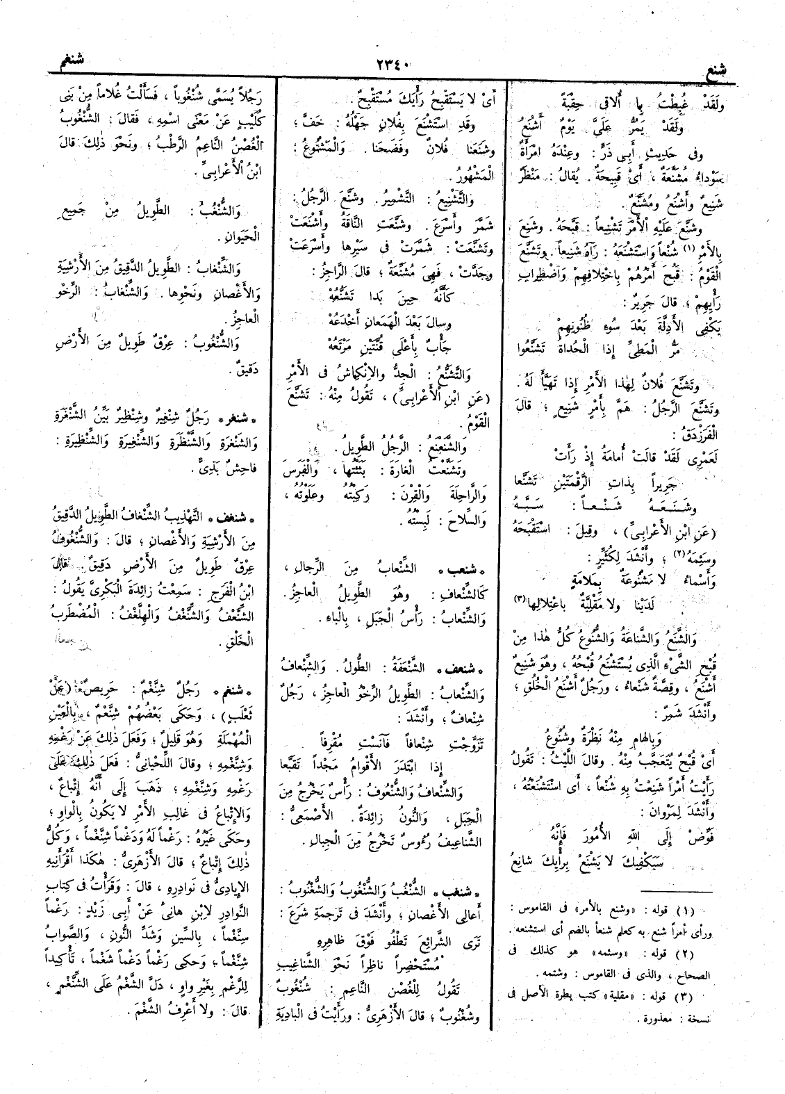 والشَّنَعُ والشَّناعةُ والمَشْنُوعُ كلُّ هذا من قُبْحِ الشيء الذي يُسْتَشْنَعُ قُبْحُه وهو شَنِيعٌ أَشْنَعُ وقصة شَنْعاءُ ورجل أَشْنَعُ الخلق وأَنشد شمر وفي الهامِ منه نَظْرةٌ وشُنُوعُ أَي قُبْح يتعجب منه وقال الليث تقول رأَيت أَمراً شَنِعْتُ به شُنْعاً أَي اسْتَشْنَعْتُه وأَنشد لمرْوان فَوِّضْ إِلى اللهِ الأُمورَ فإِنه سَيَكْفيكَ لا يَشْنَعْ بِرأْيِكَ شانِعُ أَي لا يَسْتَقْبِحُ رأَيَك مُسْتَقْبِحٌ وقد اسْتَشْنَعَ بفلان جَهْلُه خَفَّ وشَنَعَنا فُلان وفَضَحنا والمَشْنوع المشهور والتَّشْنِيعُ التَّشْمير وشَنَّع الرجلُ شَمَّر وأَسْرعَ وشَنَّعَتِ الناقةُ وأَشْنَعَتْ وتَشَنَّعَتْ شَمَّرَت في سَيْرِها وأَسْرَعَتْ وجَدَّت فهي مُشَنِّعةٌ قال الراجز كأَنَّه حِينَ بَدا تَشَنُّعُهْ وسالَ بعد الهَمَعانِ أَخْدَعُهْ جأْبٌ بِأَعْلى قُنَّتَيْنِ مَرْتَعُه والتشنُّع الجِدّ والانْكِماشُ في الأَمر عن ابن الأَعرابي تقول منه تشَنَّعَ القومُ والشَّنَعْنَعُ الرجل الطوِيلُ وتَشَنَّعْتُ الغارةَ بَثَثْتُها والفرسَ والرّاحلةَ والقِرْنَ رَكِبْتُه وعَلَوْتُه والسِّلاحَ لَبِسْتُه ( شنعب ) الشِّنْعابُ من الرجال كالشِّنْعافِ وهو الطويلُ العاجزُ والشِّنْعابُ رأْسُ الجَبَل بالباءِ ( شنعف ) الشَّنْعَفَةُ الطول والشِّنْعافُ والشِّنْعابُ الطويلُ الرِّخْوُ العاجز رجل شِنْعافٌ وأَنشد تَزَوَّجْتِ شِنْعافاً فآنَسْتِ مُقْرِفاً إذا ابْتَدَرَ الأَقْوامُ مَجْداً تَقَبَّعا والشِّنْعافُ والشُّنْعُوفُ رأْس يخرج من الجبل والنون زائدة الأصمعي الشَّناعِيفُ رؤوس تخرج من الجبال ( شنغب ) الشُّنْغُبُ والشُّنْغُوب والشُّغْنُوب أَعالي الأَغْصانِ وأَنشد في ترجمة شرع
