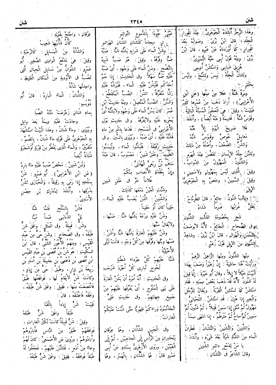 وهذا الرجز أَنشده الجوهري عن اقْوِرارِ الجِلْدِ قال ابن بري وصوابه بعد اقورار كما أَوردناه عن غيره قال ابن بري ومنه قول أَبي حَيَّةَ النُّمَيْرِيّ هُرِيقَ شَبابي واسْتَشَنَّ أَدِيمي وتشَانَّ الجلد يَبِسَ وتَشَنَّجَ وليس بخَلَقٍ ومَرَةٌ شَنَّةٌ خلا من سِنِّها عن ابن الأَعرابي أَرادَ ذَهَبَ من عمرها كثير فبَلِيَتْ وقيل هي العجوز المُسِنَّة البالية وقوس شَنَّة قديمة عنه أَيضاً وأَنشد فلا صَرِيخَ اليَوْمَ إِلا هُنَّهْ مَعابِلٌ خُوصٌ وقَوْسٌ شَنَّهْ والشَّنُّ الضعف وأَصله من ذلك وتَشَنَّنَ جلد الإِنسان تَغَضَّنَ عند الهَرَم والشَّنُونُ المهزول من الدواب وقيل الذي ليس بمهزول ولا سمين وقيل السمين وخص به الجوهري الإِبل وذئب شَنُونٌ جائع قال الطِّرِمَّاح يَظَلُّ غُرابُها ضَرِماً شَذَاه شَجٍ بخُصُومةِ الذئبِ الشَّنُونِ وفي الصحاح الجائع لأَنه لا يوصف بالسِّمَن والهُزال قال ابن بري وشاهد الشَّنُونِ من الإِبل قول زهير منها الشَّنُونُ ومنها الزاهِقُ الزَّهِمُ ورأَيت هنا حاشية إن زهيراً وصف بهذا البيت خيلاً لا إِبلاً وقال أَبو خَيْرَة إنما قيل له شَنُون لأَنه قد ذهب بعضُ سِمَنِه فقد اسْتَشَنَّ كما تَسْتَشِنُّ القربة ويقال للرجل والبعير إذا هُزِلَ قد اسْتَشَنَّ اللحياني مَهْزُول ثم مُنْقٍ إذا سَمِنَ قليلاً ثم شَنُون ثم سَمِين ثم ساحٌّ ثم مُتَرَطِّم إذا انتهى سِمَناً والشَّنِينُ والتَّشْنِينُ والتَّشْنانُ قَطَرانُ الماء من الشَّنَّةِ شيئاً بعد شيء وأَنشد يا مَنْ لدَمْعٍ دائِم الشَّنِين وقال الشاعر في التَّشْنَانِ عَيْنَيَّ جُوداً بالدُّموعِ التوائِم سِجاماً كتَشْنانِ الشِّنانِ الهَزائم وشَنَّ الماءَ على شرابه يَشُنُّه شَنّاً صَبَّه صَبّاً وفرّقه وقيل هو صَبٌّ شبيه بالنَّضْحِ وسَنَّ الماءَ على وجهه أَي صبه عليه صبّاً سهلاً وفي الحديث إذا حُمَّ أَحدُكم فَلْيَشُنَّ عليه الماءَ فَلْيَرُشَّه عليه رَشّاً متفرّقاً الشَّنُّ الصَّبُّ المُتَقَطِّع والسَّنُّ الصَّبُّ المتصل ومنه حديث عمر كان يَسُنُّ الماءَ على وجهه ولا يَشُنُّه أَي يُجْرِيه عليه ولا يُفَرِّقه وفي حديث بول الأََعرابي في المسجد فدعا بدلو من ماء فشَنَّه عليه أَي صبها ويروى بالسين وفي حديث رُقَيْقَةَ فلْيَشُنُّوا الماءَ ولْيَمَسُّوا الطيبَ وعَلَقٌ شَنِينٌ مصبوب قال عبد مناف بن رِبْعِيٍّ الهذلي وإنَّ بعُقْدَةِ الأَنصابِ منكم غُلاماً خَرَّ في عَلَقٍ شَنِينِ وشَنَّتِ العينُ دَمْعَها كذلك والشَّنِينُ اللبن يُصَبُّ عليه الماء حَليباً كان أَو حَقِيناً وشَنَّ عليه دِرْعَه يَشُنُّها شَنّاً صبها ولا يقال سَنِّا وشَنَّ عليهم الغارةَ يَشُنُّها شَنّاً وأَشَنَّ صَبَّها وبَثَّها وفَرَّقها من كل وجه قالت ليلى الأَخْيَلِيَّة شَنَنّا عليهم كُلَّ جَرْداءَ شَطْبَةٍ لَجُوجٍ تُبارِي كلَّ أَجْرَدَ شَرْحَبِ وفي الحديث أَنه أَمره أَن يَشُنَّ الغارَةَ على بني المُلَوِّحِ أَي يُفَرِّقَها عليهم من جميع جهاتهم وفي حديث علي اتَّخَذْتُموه وراءَكم ظِهْرِيّاً حتى شُنَّت عليكم الغاراتُ وفي الجبين الشَّانَّانِ وهما عرقان ينحدران من الرأْس إلى الحاجبين ثم إلى العينين وروى الأَزهري بسنده عن أَبي عمرو قال هما الشَّأْنَانِ بالهمز وهما عرقان واحتج بقوله كأَنَّ شَأْنَيْهِما شَعِيبُ والشَّانَّةُ من المسايل كالرَّحَبَةِ وقيل هي مَدْفَعُ الوادي الصغير أَبو عمرو الشَّوَانُّ من مَسايل الجبال التي تَصُبُّ في الأَوْدِيةِ من المكان الغليظ واحدتها شانَّة والشُّنانُ الماء البارد قال أَبو ذؤيب بماءٍ شُنانٍ زَعْزَعَتْ مَتْنَه الصَّبَا وجادَتْ عليه ديمةٌ بَعْدَ وابِلِ ويروى وماء شُنانٌ وهذا البيت استشهد به الجوهري على قوله ماء شُنانٌ بالضم متفرِّق والماء الذي يقطر من قربة أَو شجرة شُنَانة أَيضاً ولبن شَنينٌ مَحْضٌ صُبَّ عليه ماء بارد عن ابن الأَعرابي أَبو عمرو شَنَّ بسَلْحِه إذا رمى به رقيقاً والحُبَارَ