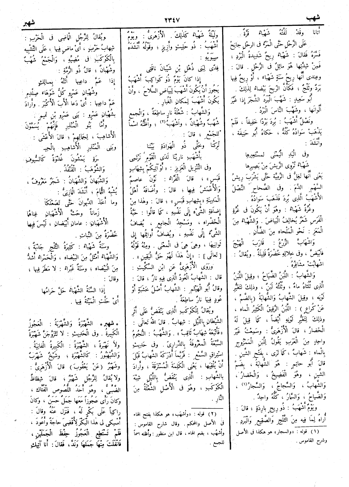 وفي التنزيل العزيز أَوْ آتِيكُمْ بِشِهابٍ قَبَسٍ قال الفراء نَوَّن عاصِمٌ والأَعْمَشُ فِيهِما قال وأَضَافه أَهلُ المَدينَةِ « بِشِهابِ قبسٍ » قال وهذا من إِضافة الشَّيءِ إِلى نفسِه كما قالوا حَبَّةُ الخَضْراءِ ومَسْجِدُ الجامِع يضاف الشَّيءُ إِلى نَفْسِهِ ويُضافُ أَوائِلُها إِلى ثوانِيهَا وهِيَ هِيَ في المعنى ومنه قوله إِنَّ هذا لَهُو حَقُّ اليَقِينِ [ ص 510 ] وروى الأَزهري عن ابن السكيت قال الشِّهابُ العُودُ الذي فيه نارٌ قال وقال أَبو الهَيْثم الشِّهابُ أَصْلُ خَشَبَةٍ أَو عودٍ فيها نارٌ ساطِعَة ويقال لِلْكَوْكَبِ الذي يَنْقَضُّ على أَثر الشَّيْطان بالليْلِ شِهابٌ قال اللّه تعالى فأَتْبَعَهُ شِهابٌ ثاقِبٌ والشُّهُبُ النُّجومُ السَّبْعَة المعْروفَة بالدَّراري وفي حديث اسْتِراقِ السَّمْعِ فَرُبَّما أَدْرَكَه الشِّهابُ قبل أَن يُلْقِيَها يعني الكَلِمَة المُسْتَرَقَة وأَراد بالشِّهابِ الذي يَنْقَضُّ باللَّيْلِ شِبْهَ الكَوكَبِ وهو في الأَصل الشُّعْلَة من النَّارِ ويقال للرجُلِ الماضي في الحرب شِهابُ حَرْبٍ أَي ماضٍ فيها على التَّشْبيهِ بِالكَوْكَبِ في مُضِيِّه والجمعُ شُهُبٌ وشُهْبانٌ قال ذو الرمة