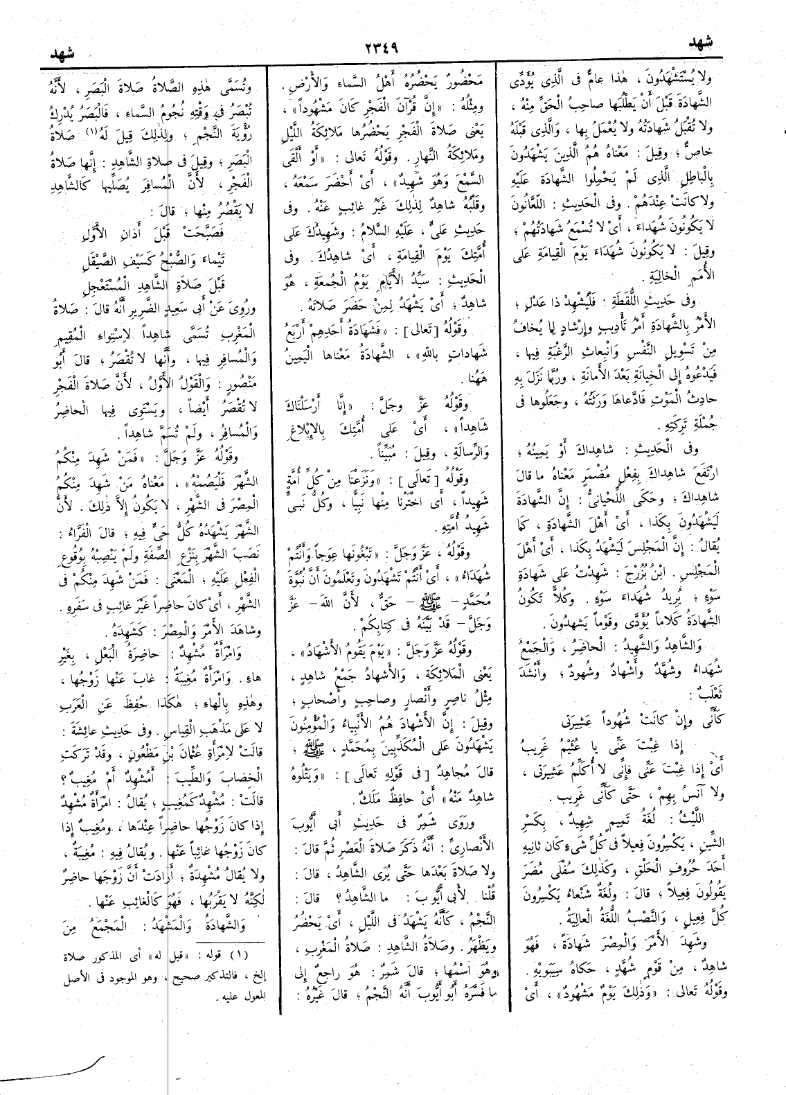 ( * قوله « قيل له » أي المذكور صلاة إلخ فالتذكير صحيح وهو الموجود في الأَصل المعول عليه ) صلاةُ البصر وقيل في صلاةِ الشاهد إِنها صلاةُ الفجر لأَنَّ المسافر يصليها كالشاهد لا يَقْصُرُ منها قال فَصَبَّحَتْ قبلَ أَذانِ الأَوَّلِ تَيْماء والصُّبْحُ كَسَيْفِ الصَّيْقَل قَبْلَ صلاةِ الشاهِدِ المُسْتَعْجل وروي عن أَبي سعيد الضرير أَنه قال صلاة المغرب تسمى شاهداً لاستواءِ المقيم والمسافر فيها وأَنها لا تُقْصَر قال أَبو منصور والقَوْلُ الأَوَّل لأَن صلاة الفجر لا تُقْصَر أَيضاً ويستوي فيها الحاضر والمسافر ولم تُسَمَّ شاهداً وقوله عز وجل فمن شَهِدَ منكم الشهر قليصمه معناه من شَهْدِ منكم المِصْرَ في الشهر لا يكون إِلا ذلك لأَن الشهر يَشْهَدُهُ كلُّ حَيٍّ فيه قال الفراء نَصَبَ الشهر بنزع الصفة ولم ينصبه بوقوع الفعل عليه المعنى فمن شَهِدَ منكم في الشهر أَي كان حاضراً غير غائب في سفره وشاهَدَ الأَمرَ والمِصر كَشهِدَه وامرأَة مُشْهِدٌ حاضرة البعل بغير هاءٍ وامرأَة مُغِيبَة غاب عنها زوجها وهذه بالهاءِ هكذا حفظ عن العرب لا على مذهب القياس وفي حديث عائشة قالت لامرأَة عثمان بن مَظْعُون وقد تَرَكَت الخضاب والطِّيبَ أَمُشْهِدٌ أَم مُغِيبٌ ؟ قالت مُشْهِدٌ كَمُغِيبٍ يقال امرأَة مُشْهِدٌ إِذا كان زوجها حاضراً عندها ومُغِيبٌ إِذا كان زوجها غائباً عنها ويقال فيه مُغِيبَة ولا يقال مُشْهِدَةٌ أَرادت أَن زوجها حاضر لكنه لا يَقْرَبُها فهو كالغائب عنها والشهادة والمَشْهَدُ المَجْمَعُ من