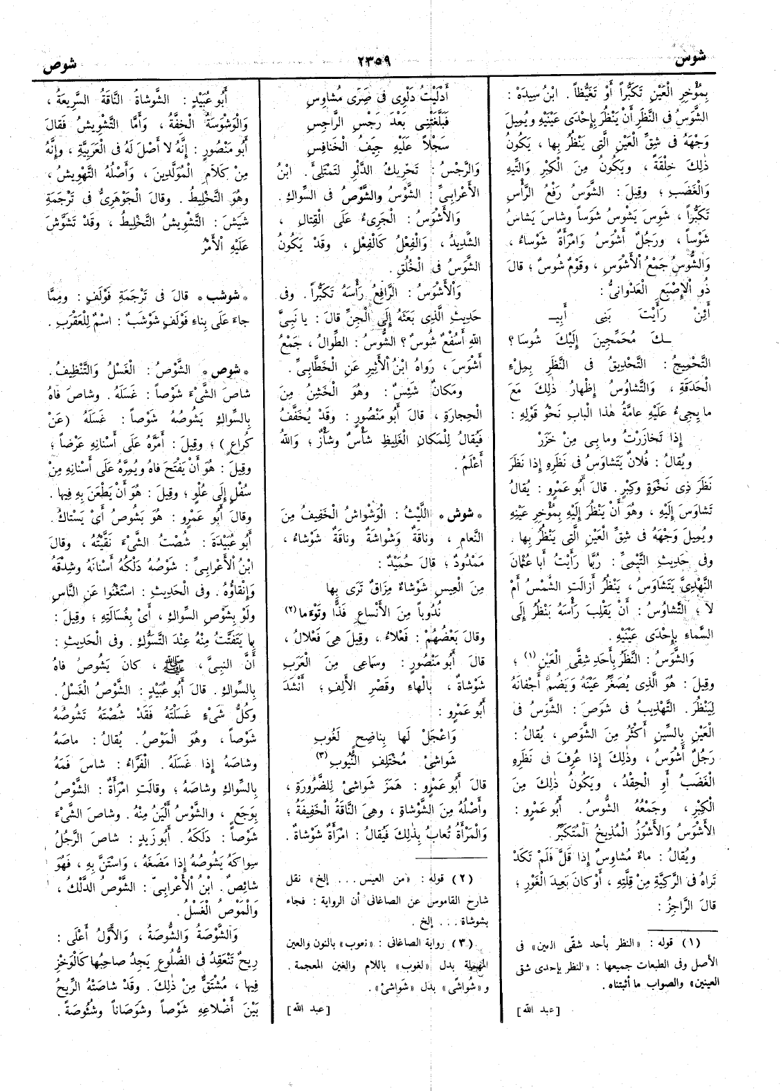 وقال بعضهم فَعْلاء وقيل هي فَعْلال قال أَبو منصور وسماعي من العرب شَوْشاة بالهاء وقَصْر الأَلف أَنشد أَبو عمرو واعْجَلْ لها بناضحٍ لَغُوبِ شَواشئ مُخْتلِف النُّيوبِ قال أَبو عمرو همز شواشئ للضرورة وأَصله من الشَّوْشاةِ وهي الناقةُ الخفيفةُ والمرأَة تُعابُ بذلك فيقال امرأَة شَوْشاةٌ أَبو عبيد الشَّوْشاةُ الناقةُ السريعةُ والوَشْوَشةُ الخفَّةُ وأَما التَّشْوِيشُ فقال أَبو منصور إِنه لا أَصل له في العربية وإِنه من كلام المولدين وأَصله التَّهْوِيش وهو التَخْلِيطُ وقال الجوهري في ترجمة شيش التَّشْوِيش التَّخْلِيطُ وقد تَشَوّش عليه الأَمْرُ ( شوشب ) قال في ترجمة فَوْلَفٍ ومما جاءَ على بِناءِ فَوْلَفٍ شَوْشَبٌ اسمٌ للعَقْرَبِ ( شوص ) الشَّوْصُ الغَسْلُ والتَّنْظِيفُ شاصَ الشيءَ شَوْصاً غَسَلَه وشاصَ فاه بالسِّواكِ يَشُوصُه شَوْصاً غَسَلَه عن كراع وقيل أَمَرَّه على أَسْنانهِ عَرْضاً وقيل هو أَن يَفْتَح فاه ويُمِرَّه على أَسْنانِه من سُفْلٍ إِلى عُلْوٍ وقيل هو أَن يَطْعَن به فيها وقال أَبو عمرو وهو يَشُوصُ أَي يَسْتاكُ أَبو عبيدة شُصْتُ الشيءَ نقَّيْتُه وقال ابن الأَعرابي شَوْصُه دلْكهُ أَسْنانَه وشِدْقَه وإِنْقاؤه وفي الحديث اسْتَغْنُوا عن الناس ولو بَشَوْصِ السِّواكِ أَي بغُسَالَته وقيل بما يَتَفَتَّتُ منه عند التَّسَوُّكِ وفي الحديث أَن النبي صلّى اللّه عليه وسلّم كان يَشُوصُ فاه بالسِّواك قال أَبو عبيد الشَّوْصُ الغَسْل وكلُّ شيء غَسَلْته فقد شُصْتَه تَشُوصُه شَوْصاً وهو المَوْصُ يقال ماصَه وشاصَه إِذا غسَله الفراء شاسَ فَمَه بالسِّواك وشاصَه وقالت امرأَة الشَّوْصُ بِوَجَعٍ والشَّوْسُ أَلْيَنُ منه وشاصَ الشيءَ شَوْصاً دَلَكه أَبو زيد شاصَ الرجلُ سواكَه يَشُوصُه إِذا مَضَغَه واسْتَنَّ به فهو شائصٌ ابن الأَعرابي الشَّوْص الدَّلْك والمَوْصُ الغَسْل والشَّوْصةُ والشُّوصَةُ والأَول أَعلى ريحٌ تَنْعَقِدُ في الضلوع يجد صاحبُها كالوَخْزِ فيها مشتق من ذلك وقد شاصَتْه الرِّيحُ بين أَضْلاعه شَوْصاً وشَوَصَاناً وشُؤوصة