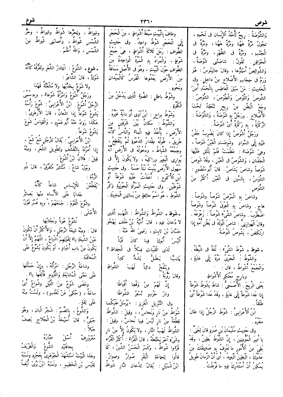 والشَّوْصةُ رِيحٌ تأْخذ الإِنسان في لَحْمِه تَجُول مرَّة ههنا ومرة ههنا ومرة في الجنب ومرة في الظهر ومرة في الحَوَاقِن تقول شاصَتْنِي شَوْصَةٌ والشَّوائِص أَسْماؤها وقال جالينوس هو وَرَمٌ في حِجاب الأَضلاع من داخل وفي الحديث من سَبَقَ العاطِسَ بالحمْدِ أَمِنَ الشَّوْصَ واللَّوْصَ والعِلَّوْصَ الشَّوْص وجعُ البطن من ريح تنعقد تحت الأَضلاع ورجل به شَوْصةٌ والشَّوْصةُ الرَّكْزَةُ به رَكْزَةٌ أَي شَوْصةٌ ورجل أَشْوَصُ إِذا كان يَضْرِبُ جَفْنُ عينِه إِلى السواد وشَوِصَت العَيْنُ شَوْصاً وهي شَوْصاءُ عَظُمَت فلم يَلْتَقِ عليها الجَفْنانِ والشَّوَصُ في العَين وقد شَوِصَ شَوْصاً وشاصَ يَشَاصُ قال أَبو منصور الشَّوَسُ بالسين في العين أَكْثرُ من الشَّوَصِ وشاصَ به المرضُ شَوْصاً وشَوَصاً هاجَ وشاصَ به العِرْق شَوْصاً وشَوَصاً اضطرب وشاص الشيءَ شَوْصاً زَعْزَعَه وقال الهَوازني شاصَ الولَدُ في بطن أُمِّه إِذا ارتكض يَشُوصُ شَوْصةً (شوط) شَوَّطَ الشيءَ لغة في شَيَّطه والشَّوْطُ الجَرْيُ مرة إِلى غاية والجمع أَشْواطٌ قال وبارحٍ مُعْتَكِرِ الأَشْواطِ يعني الريح الأَصمعي شاطَ يَشُوطُ شَوْطاً إِذا عَدا شَوْطاً إِلى غاية وقد عَدا شَوْطاً أَي طَلَقاً ابن الأَعرابي شَوَّطَ الرجلُ إِذا طال سفره وفي حديث سُلَيْمَان بن صُرَدٍ قال لعلي يا أَمير المؤمنين إِن الشَّوْطَ بَطِينٌ وقد بَقِيَ من الأُمورِ ما تَعْرِفُ صَدِيقَك من عدُوِّكَ البَطِينُ البَعِيدُ أَي إِن الزمان طويل يُمكِنُ أَن أَسْتَدْرِكَ فيه ما فرَّطْتُ وطافَ بالبيتِ سبعةَ أَشْواط من الحجَر إِلى الحجَر شَوْطٌ واحد وفي حديث الطوافِ رملَ ثلاثةَ أَشْواطٍ هي جمع شَوْطٍ والمراد به المرّة الواحدةُ من الطَّوافِ حوْلَ البيتِ وهو في الأَصل مَسافة من الأَرض يَعْدُوها الفَرس كالمَيْدان ونحوه وشَوْطُ باطِلٍ الضَّوْء الذي يدخل من الكُوَّة وشَوْطُ بَراحٍ ابن آوى أَو دابَّةٌ غيره والشَّوْطُ مكان بين شَرَفَيْنِ من الأَرض يأْخذ فيه الماء والناسُ كأَنه طريق طولُه مِقْدارُ الدَّعْوةِ ثم يَنْقطِعُ وجمعه الشِّياطُ ودخولُه في الأَرض أَنه يواري البعير وراكبه ولا يكون إِلا في سُهولِ الأَرض يُنْبِتُ نَبْتاً حسَناً وفي حديث ابن الأَكوع أَخَذْت عليه شَوْطاً أَو شَوْطَيْنِ وفي حديث المرأَة الجَوْنِيَّةِ ذِكْرُ الشوْطِ هو اسمُ حائطٍ من بساتِينِ المدينةِ (شوظ) الشَّواظُ والشُّواظُ اللَّهَب الذي لا دُخانَ فيه قال أُمية بن خلف يهجو حسان بن ثابت رضي اللّه عنه أَلَيْسَ أَبوك فينا كان قَيْناً لَدَى القَيْناتِ فَسْلاً في الحِفاظِ؟ يَمانِيّاً يَظَلُّ يَشُدُّ كِيراً ويَنْفُخُ دائباً لَهَبَ الشُّواظِ وقال رؤبة إِنّ لَهم من وَقْعِنا أَقْياظَا ونارَ حَرْبٍ تُسْعِرُ الشَّواظا وفي التنزيل العزيز يُرْسَل عليكما شُواظ من نار ونحاس وقيل الشُّواظ قِطْعة من نار ليس فيها نُحاس وقيل الشواظ لهب النار ولا يكون إِلا من نار وشيءٍ آخر يَخْلِطُه قال الفراء أَكثر القراء قرؤوا شُواظ وكسر الحسن الشين كما قالوا لجماعة البقرِ صُوارٌ وصِوار ابن شميل يقال لدُخان النار شُواظ وشِواظ ولحرّها شُواظ وشِواظ وحرّ الشمس شُواظ وأَصابني شواظ من الشمس واللّه أَعلم (شوع) الشَّوَعُ انْتِشارُ الشَّعر وتَفَرُّقُه كأَنه شَوْك قال الشاعر ولا شَوَعٌ بخَدَّيْها ولا مُشْعَنَّةٌ قَهْدا ورجل أَشْوَعُ وامرأَة شَوْعاءُ وبه سمي الرجل أَشْوَعَ ابن الأَعرابي شَوُعَ رأْسُه يَشُوعُ شَوْعاً إِذا اشْعانَّ قال الأَزهري هكذا رواه عنه أَبو عمرو والقِياسُ شَوِعَ يَشْوَعُ شَوَعاً ابن الأَعرابي يقال للرجل شُعْ شُعْ إِذا أَمرته بالتَّقَشُّفِ وتطويل الشعر ومنه قيل فُلانٌ ابن أَشْوَعَ وبَوْلٌ شاعٌ مُنْتَشِرٌ مُتَفَرِّق قال ذو الرمة يُقَطِّعْنَ لِلإِبْساسِ شاعاً كأَنَّه جَدايا على الأَنْساءِ مِنها بَصائِر وشَوَّعَ القومَ جمعهم وبه فسر قول الأَعشى نُشَوِّعُ عُوناً 