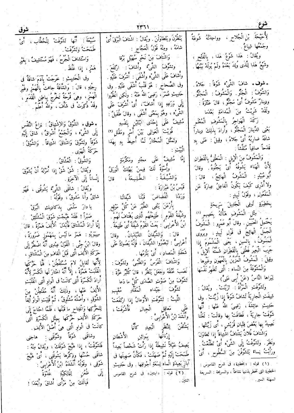 وتمثّل المخْتارُ لما أُحِيطَ به بهذا البيت إما مُشِيف على مجْدٍ ومَكْرُمةٍ وأُسْوةٌ لك فيمن يَهْلِكُ الوَرَقُ والشَّيِّفةُ الطَّلِيعةُ قال قَيْسُ بن عَيزارة ورَدْنا الفُضاضَ قَبْلَنا شَيِّفاتُنا بأَرْعَنَ يَنْفي الطيرَ عن كلِّ مَوْقِعِ وشَيِّفةُ القوم طَلِيعَتُهم الذي يَشْتافُ لهم ابن الأَعرابي بعث القومُ شَيِّفةً أَي طَليعةً قال والشَّيِّفانُ الدَّيْدَبانُ وقال أَعرابي تَبَصَّرُوا الشَّيِّفانَ فإنه يَصُوكُ على شَعَفَةِ المَصادِ أَي يلزمها واشْتافَ الفرسُ والظَّبْيُ وتَشَوَّفَ نَصَب عُنُقَه وجعل ينظر قال كثير عزة تَشَوّفَ من صَوْتِ الصَّدى كلَّ ما دَعا تَشَوُّفَ جَيْداء المُقَلَّدِ مُغْيِبِ الليث تشوَّفتِ الأَوْعالُ إذا ارتفعت على معاقِلِ الجبال فأَشْرفت وأَنشد ابن الأَعرابي يَشْتَفْنَ للنظرِ البعيد كأَنما إرنانُها ببَوائِن الأَشْطانِ