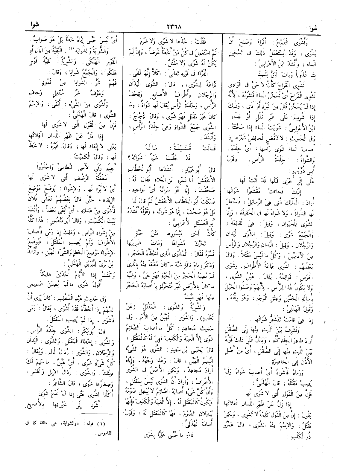 وأَشْوَى القَمْحُ أَفْرَكَ وصلَحَ أَنْ يُشْوَى وقد يستعمل ذلك في تَسْخينِ الماءِ وأَنشد ابن الأَعرابي بِتْنا عُذُوباً وباتَ البَقُّ يَلْسِبُنا نَشْوِي القَراحَ كأَنْ لا حَيَّ في الوَادِي نَشْوِي القَراحَ أَي نُسَخِّنُ الماءَ فنَشْرَبُهُ لأَنه إِذا لَمْ يُسَخَّنْ قَتَل من البَرْدِ أَو آذى وذلك إِذا شُرِبَ على غيرِ ثُفْلٍ أَو غِذَاءٍ ابن الأَعرابي شَوَيْتُ الماءَ إِذا سَخَّنْتَه وفي الحديث لا تَنْقُضِ الحائِضُ شَعَرَها إِذا أَصابَ الماءُ شَوَى رأْسِها أَي جِلْدَه والشَّواةُ جِلْدَةُ الرأْسِ وقولُ أَبي ذُؤَيْب على إِثْرِ أُخْرَى قَبْلَها قد أَتتْ لها إِليكَ فجاءتْ مُقْشَعِرّاً شَواتُها أَراد المَآلِكَ التي هي الرسائلُ فاستَعار لها الشَّواةَ ولا شَواةَ لها في الحقيقة وإِنما الشَّوَى للحَيَوان وقيل هي القائمةُ والجمع شَوىً وقيل الشَّوَى اليَدانِ والرِّجْلانِ وقيل اليَدانِ والرِّجْلانِ والرأْسُ من الآدِميِّينَ وكُلُّ ما ليس مَقْتَلاً وقال بعضهم الشَّوَى جماعة الأَطرافِ وشَوَى الفَرَسِ قَوَائُمه يُقالُ عَبْلُ الشَّوَى ولا يكونُ هذا للرَّأْسِ لأَنهم وصَفُوا الخَيْلَ بأَسالَةِ الخَدَّيْنِ وعِتْقِ الوَجْهِ وهو رِقَّتُه وقول الهذلي إِذا هي قامَتْ تَقْشَعِرُّ شَوَاتُها وتُشْرِفُ بين اللِّيتِ منها إِلى الصُّقْلِ أَراد ظاهِرَ الجِلدِ كلّه ويدُلُّ على ذلك قوله بين اللّيتِ منها إِلى الصُّقْلِ أَي من أَصلِ الأُذُنِ إِلى الخاصِرَة ورَماهُ فأَشْواهُ أَي أَصابَ شَواهُ ولم يُصِبْ مَقْتَلَه قال الهذلي فإِنَّ من القَوْل التي لا شَوَى لها إِذ زَلَّ عن ظَهْرِ اللسانِ انْفلاتُها يقول إِنَّ من القَوْل كَلِمَةً لا تُشْوِي ولكنْ تَقْتُلُ والاسمُ منه الشَّوَى قال عَمْرو ذُو الكَلْب فَقُلْتُ خُذْهَا لا شَوىً ولا شَرَمْ ثم اسْتُعْمِلَ في كُلِّ مَن أَخْطَأَ غَرَضاً وإِن لم يكن له شَوىً ولا مَقْتَلٌ الفراء في قوله تعالى كَلاَّ إِنَّها لَظَى نَزَّاعَة للشَّوَى قال الشَّوَى اليَدَانِ والرِّجْلانِ وأَطْرافُ الأَصابع وقِحْفُ الرَّأْسِ وجِلْدَةُ الرَّأْسِ يقال لها شَوَاةٌ وما كان غيرَ مَقْتَلٍ فهو شَوىً وقال الزجاج الشَّوَى جمع الشَّوَاةِ وهي جِلْدَةُ الرَّأْسِ وأَنشد قَالَتْ قُتَيْلَةُ مَا لَهُ قَدْ جُلِّلَتْ شَيْباً شَوَاتُهْ ؟ قال أَبو عبيد أَنشدها أَبو الخطاب الأَخفش أَبا عمرو ابن العلاءِ فقال له صحَّفتَ إِنما هو سراتُه أَي نواحيه فسكت أَبو الخطَّاب الأَخْفَش ثم قال لنا بل هو صَحَّفَ إِنما هو شَواتُه وقوله أَنشده أَبو العَمَيْثَل الأَعرابي كَأَنّ لَدَى مَيْسُورها متْنَ حَيَّةٍ تَحَرَّكَ مُشْواهَا ومَاتَ ضَرِيبُها فسَّره فقال المُشْوَى الذي أَخْطَأَه الحَجَر وذكر زِمامَ ناقَةٍ شَبَّه ما كان مُعَلَّقاً منه بالذي لم يُصِبْهُ الحَجرُ من الحيَّة فهو حَيٌّ وشبَّه ما كان بالأَرض غير متحرك بما أَصابه الحجر منها فهو ميِّتٌ والشَّوِيَّةُ والشَّوى المَقْتلُ عن ثعلب والشَّوى الهَيِّنُ من الأَمر وفي حديث مجاهد كل ما أَصابَ الصائمُ شَوىً إِلاَّ الغِيبةَ والكَذِبَ فهي له كالمقْتَل قال يحيى بن سعيد الشَّوى هو الشيءُ اليَسيرُ الهَيِّن قال وهذا وجهُه وإِياه أَراد مجاهدٌ ولكنِ الأَصلُ في الشَّوى الأَطْراف وأَراد أَن الشَّوى ليس بمَقْتلٍ وأَن كلَّ شيءٍ أَصابَه الصائم لا يُبْطِل صوْمَه فيكون كالمَقتل له إِلا الغِيبةَ والكَذِبَ فإِنهما يُبْطِلان الصَّوْم فهما كالمَقتل له وقولُ أُسامة الهُذَلي تاللهِ ما حُبِّي عَلِيّاً بشَوى أَي ليس حُبِّي إِياه خطأً بل هو صوابٌ والشُّوايَةُ والشِّوايَةُ