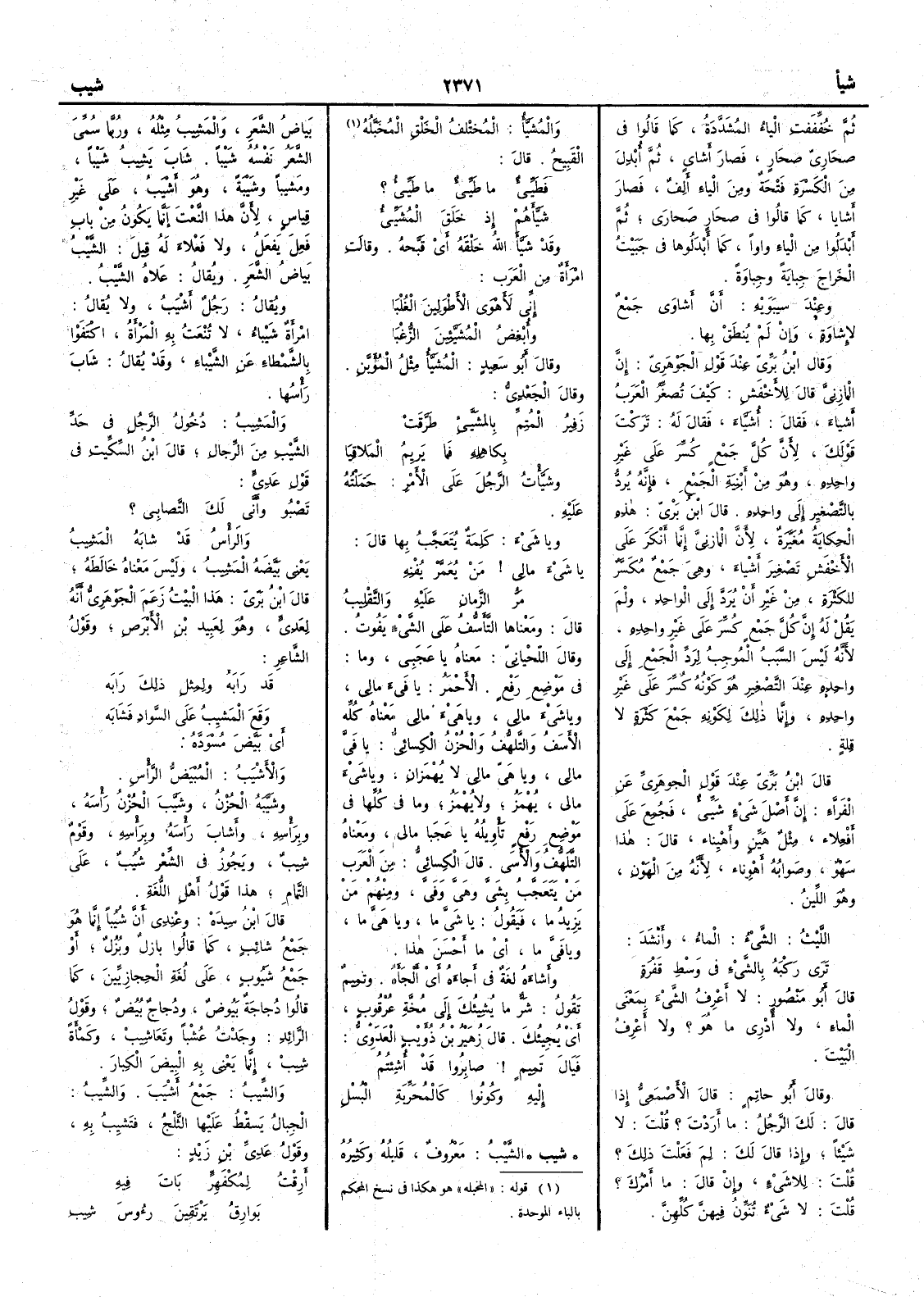 ثم خففت الياء المشدّدة كما قالوا في صَحارِيّ صَحارٍ فصار أَشايٍ ثم أُبْدِلَ من الكسرة فتحةٌ ومن الياءِ أَلف فصار أَشايا كما قالوا في صَحارٍ صَحارَى ثم أَبدلوا من الياء واواً كما أَبدلوها في جَبَيْت الخَراج جِبايةً وجِباوةً وعند سيبويه أَنَّ أَشاوَى جمع لإِشاوةٍ وإِن لم يُنْطَقْ بها وقال ابن بري عند قول الجوهري إِن المازني قال للأَخفش كيف تصغِّر العرب أَشياء فقال أُشَيَّاء فقال له تركت قولك لأَن كل جمع كسر على غير واحده وهو من أَبنية الجمع فإِنه يُردُّ بالتصغير إِلى واحده قال ابن بري هذه الحكاية مغيرة لأَنَّ المازني إِنما أَنكر على الأَخفش تصغير أَشياء وهي جمع مكسر للكثرة من غير أَن يُردَّ إِلى الواحد ولم يقل له إِن كل جمع كسر على غير واحده لأَنه ليس السببُ المُوجِبُ لردِّ الجمع إِلى واحده عند التصغير هو كونه كسر على غير واحده وإِنما ذلك لكونه جَمْعَ كَثرة لا قلة قال ابن بري عند قول الجوهري عن الفرّاء إِن أَصل شيءٍ شَيِّئٌ فجمع على أَفْعِلاء مثل هَيِّنٍ وأَهْيِناء قال هذا سهو وصوابه أَهْوناء لأَنه من الهَوْنِ وهو اللِّين الليث الشَّيء الماء وأَنشد تَرَى رَكْبَه بالشيءِ في وَسْطِ قَفْرةٍ قال أَبو منصور لا أَعرف الشيء بمعنى الماء ولا أَدري ما هو ولا أَعرف البيت وقال أَبو حاتم قال الأَصمعي إِذا قال لك الرجل ما أَردت ؟ قلتَ لا شيئاً وإِذا قال لك لِمَ فَعَلْتَ ذلك ؟ قلت للاشَيْءٍ وإِن قال ما أَمْرُكَ ؟ قلت لا شَيْءٌ تُنَوِّن فيهن كُلِّهن والمُشَيَّأُ المُخْتَلِفُ الخَلْقِ المُخَبَّله ( 1 )