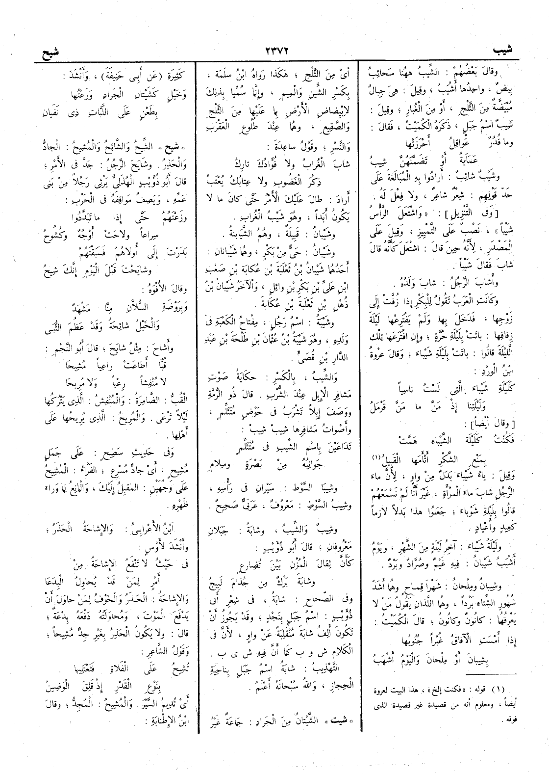 ( شيت ) الشِّيْتانُ من الجَرادِ جماعةٌ غير كثيرة عن أَبي حنيفة وأَنشد وخَيْلٍ كشَيْتانِ الجَرادِ وزَعْتُها بطَعْنٍ على اللَّبَّاتِ ذِي نَفَيانِ ( شيح ) الشِّيحُ والشائِحُ والمُشِيحُ الجادُّ والحَذِرُ وشَايَح الرجلُ جدَّ في الأَمر قال أَبو ذؤيب الهذلي يرثي رجلاً من بني عمه ويصف مواقفه في الحرب وزَعْتَهُمُ حتى إِذا ما تَبَدَّدُوا سِراعاً ولاحَتْ أَوْجُهٌ وكُشُوحُ بَدَرْتَ إِلى أُولاهُمُ فَسَبَقْتَهُمْ وشايَحْتَ قبلَ اليومِ إِنكَ شِيحُ وقال الأَفْوه وبرَوْضةِ السُّلاَّنِ منا مَشْهَدٌ والخيلُ شائحةٌ وقد عَظُمَ الثُّبَى وأَشاحَ مثل شايَحَ قال أَبو النجم قُبًّا أَطاعتْ راعِياً مُشِيحا لا مُنْفِشاً رِعْياً ولا مُرِيحا القُبُّ الضامرة والمُنْفِشُ الذي يتركها ليلاً تَرْعَى والمُرِيحُ الذي يُريحها على أَهلها وفي حديث سطيح على جَمَل مُشِيح أَي جادّ مُسْرِع الفراء المُشِيح على وجهين المُقْبِلُ إِليك والمانع لما وراء ظهره ابن الأَعرابي والإِشاحةُ الحَذَرُ وأَنشد لأَوْسٍ في حَيْثُ لا تَنْفَعُ الإِشاحةُ من أَمْرٍ لمن قد يُحاوِلُ البِدَعا والإِشاحةُ الحَذَر والخوف لمن حاول أَن يدفع الموت ومحاوَلَتُه دَفْعَه بِدْعةٌ قال ولا يكون الحَذِرُ بغير جدّ مُشِيحاً وقول الشاعر تُشِيحُ على الفَلاةِ فَتَعْتَليها بنَوْعِ القَدْرِ إِذ قَلِقَ الوَضِينُ أَي تديم السير والمُشِيحُ المُجِدُّ وقال ابن الإِطْنابَة