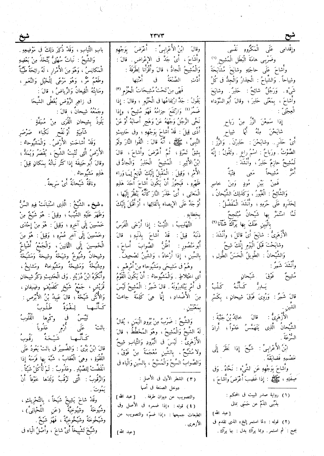 الأَزهري شايَحَ أَي قاتل وأَنشد وشايَحْتَ قبلَ اليوم إِنك شِيحُ والشَّيْحانُ الطويلُ الحَسَن الطُّولِ وأَنشد شمر مُشِيحٌ فوقَ شَيْحانٍ يَدِرُّ كأَنه كَلْبُ قال شمر ورُوِي فوق شِيحانٍ بكسر الشين الأَزهري قال خالد بن جَنْبَة الشَّيْحانُ الذي يَتَهَمَّسُ عَدْواً أَراد السرعة ابن الأَعرابي شَيَّحَ إِذا نظر إِلى خَصْمِه فضايقه وأَشاحَ بوجهه عن الشيء نَحَّاه وفي صفته صلى الله عليه وسلم إِذا غَضِبَ أَعْرَضَ وأَشاحَ وقال ابن الأَعرابي أَعرض بوجهه وأَشاحَ أَي جَدَّ في الإِعراض قال والمُشِيحُ الجادُّ قال وأَقرأَنا لطرفة أَدَّتِ الصنعةُ في أَمتُنِها فهيَ من تحتُ مُشِيحَاتُ الحُزُمْ يقول جَدَّ ارتفاعُها في الحُزُم وقال إِذا ضمَّ وارتفع حزامه فهو مُشيح وإِذا نَحَّى الرجلُ وجهَه عن وَهَجٍ أَصابه أَو عن أَذًى قيل قد أَشاح بوجهه وفي حديث النبي صلى الله عليه وسلم أَنه قال اتقوا النار ولو بشِقِّ تمرة ثم أَعرض وأَشاح قال ابن الأَثير المُشِيح الحَذِرُ والجادُّ في الأَمر وقيل المقبل إِليك المانع لما وراء ظهره فيجوز أَن يكون أَشاحَ أَحدَ هذه المعاني أَي حَذِرَ النارَ كأَنه ينظر إِليها أَو جَدَّ على الإِيصاء باتقائها أَو أَقبل إِليك بخطابه التهذيب الليث إِذا أَرْخَى الفَرَسُ ذَنَبَه قيل قد أَشاح بذنبه قال أَبو منصور أَظن الصواب أَساحَ بالسين إِذا أَرْخاه والشين تصحيف وهم في مَشِيحَى ومَشْيُوحاءَ من أَمرهم أَي اختلاط والمَشْيُوحاء أَن يكون القوم في أَمر يَبْتَدِرُونه قال شمر المُشِيحُ ليس من الأضداد إِنما هي كلمة جاءَت بمعْنَيَين والشِّيحُ ضَرْبٌ من بُرودِ اليمن يقال له الشِّيح والمُشِيحُ وهو المخطط قال الأَزهري ليس في البرود والثياب شِيحٌ ولا مُشَيَّحٌ بالشين معجمة من فوق والصواب السِّيحُ والمُسَيَّحُ بالسين والياء في باب الثياب وقد ذكر ذلك في موضعه والشِّيحُ نبات سُهْلِيٌّ يتخذ من بعضه المَكانِسُ وهو من الأَمْرار له رائحة طيبة وطعم مُرٌّ وهو مَرْعًى للخيل والنَّعَم ومَنابتُه القِيعانُ والرِّياض قال في زاهر الرَّوْضِ يُغَطِّي الشِّيحا وجمعه شِيحانٌ قال يَلُوذُ بشِيحانِ القُرَى من مُسَِفَّةٍ شَآمِيَةٍ أَو نَفْحِ نَكْباءَ صَرْصَرِ وقد أَشاحت الأَرضُ والمَشْيُوحاءُ الأَرض التي تُنْبِت الشِّيح يقصر ويمدّ وقال أَبو حنيفة إِذا كثر نباته بمكان قيل هذه مَشْيُوحاء وناقة شَيْحانة أَي سريعة