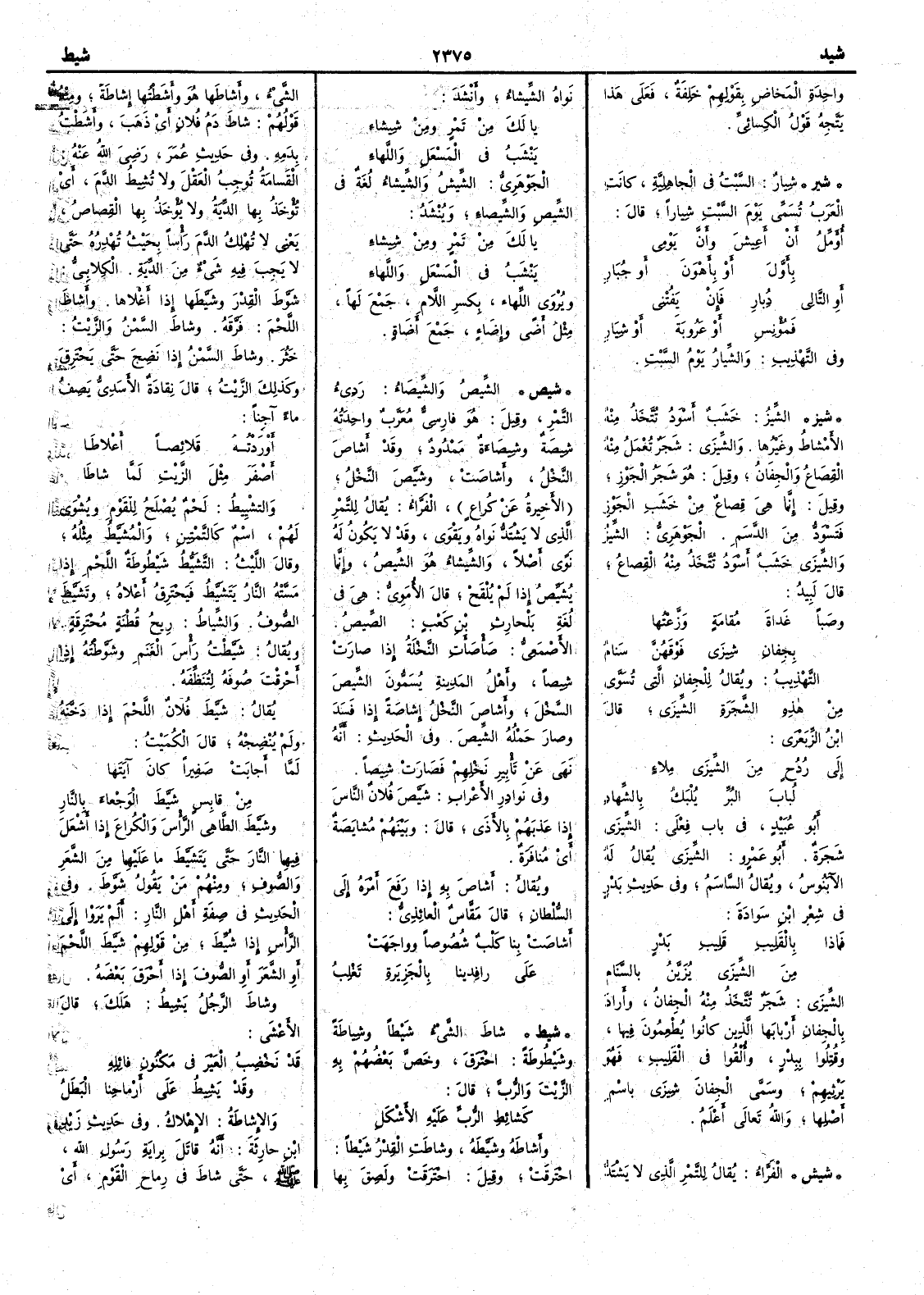 ( شيش ) : الفراء : يقال للتمر الذي لا يشتَدُّ نواه الشِّيشاءُ وأَنشد : يا لك من تَمْرٍ ومن سِيشاءِ يَنْشَبُ في المَسْعل واللَّهاءِ الجوهري : الشِّيشُ و الشِّيشاءُ لغةٌ في الشيِّصِ والشِّيصاء ويُنْشَدُ : يا لك من تمر ومن شيشاء ينشب في المسعل واللَّهاء ويروى اللِّهاء بكسر اللام جمع لَهاً مثل أَضىً وإِضَاءٍ جمع أَضَاةٍ ( شيص ) الشِّيصُ والشِّيصَاءُ رَدِيء التمر وقيل هو فارسي معرب واحدتُه شِيصةٌ وشِيصَاءَة ممدودة وقد َأشاصَ النخلُ وأَشاصَت وشَيَّصَ النخلُ الأَخيرة عن كراع الفراء يقال للتمر الذي لا يشتدُّ نواه ويَقْوَى وقد لا يكون له نوى أَصلاً والشِّيشاءُ هو الشِّيصُ وإِنما يُشَيِّصُ إِذا لم يُلْقَحْ قال الأُموي هي في لغة بلحرث بن كعب الصِّيصُ الأَصمعي صَأْصأَت النخلة إِذا صارت شِيصاً وأَهلُ المدينة يسمون الشِّيصَ السَّخْلَ وأَشاصَ النخلُ إِشاصةً إِذا فسَدَ وصار حملُه الشِّيصَ وفي الحديث أَنه نهى عن تَأْبِير نَخْلهم فصارت شيصاً وفي نوادر الأَعراب شَيَّصَ فلانٌ الناسَ إِذا عذَّبَهم بالأَذَى قال وبينهم مُشايَصةٌ أَي مُنافرةٌ ويقال أَشاصَ به إِذا رفَعَ أَمرَه إِلى السلطان قال مَقّاس العائذيّ أَشاصَتْ بنا كَلْب شُصُوصاً وواجَهَت على رافِدينا بالجزيرة تَغْلب ( شيط ) شاطَ الشيءُ شَيْطاً وشِياطةً وشَيْطُوطةً احترق وخصَّ بعضهم به الزيتَ والرُّبَّ قال كَشائطِ الرُّبِّ عليه الأَشْكَلِ وأَشاطَه وشَيَّطَه وشاطَتِ القِدْر شَيْطاً احتَرقَتْ وقيل احترقت ولَصِقَ بها الشيء وأَشاطَها هو وأَشَطْتُها إِشاطة ومنه قولهم شاطَ دمُ فلان أَي ذهب وأَشَطْتُ بدَمِه وفي حديث عمر رضي اللّه عنه القسامةُ تُوجِبُ العَقْلَ ولا تُشِيطُ الدَّمَ أَي تؤخذ بها الدِّيَةُ ولا يُؤْخَذُ بها القِصاصُ يعني لا تُهْلِكُ الدم رأْساً بحيث تُهْدِرُه حتى لا يجب فيه شيء من الديّة الكلابي شَوَّط القِدْرَ وشَيَّطَها إِذا أَغْلاها وأَشاطَ اللحم فَرَّقه وشاطَ السمْنُ والزَّيْتُ خَثُرَ وشاطَ السمنُ إِذا نَضِجَ حتى يَحْتَرِقَ وكذلك الزيت قال نِقادةُ الأَسدي يصف ماء آجِناً أَوْرَدْتُه قَلائصاً أَعْلاطا أَصْفَرَ مِثْل الزَّيْتِ لَمّا شاطا والتَشْيِيطُ لحم يُصْلَح للقوم ويُشْوى لهم اسم كالتَّمْتِين والمُشَيَّطُ مِثْلُه وقال الليث التشَيُّطُ شَيْطُوطةُ اللحم إِذا مسَّته النار يَتَشَيَّطُ فيَحْتَرِقُ أَعْلاه وتَشَيَّطَ الصوفُ والشِّياطُ رِيح قُطنة مُحْتَرِقةٍ ويقال شَيَّطْتُ رأْس الغنم وشوَّطْتُه إِذا أَحْرَقْت صُوفه لتُنظِّفه يقال شَيَّطَ فلان اللحم إِذا دَخَّنه ولم يُنْضِجُه قال الكميت لَمّا أَجابَتْ صَفِيراً كان آيَتَها مِنْ قابِسٍ شَيَّطَ الوَجْعاء بالنارِ وشَيَّطَ الطَّاهي الرأْس والكُراعَ إِذا أَشْعَل فيهما النار حتى يَتَشَيَّطَ ما عليهما من الشعرَ والصُّوفِ ومنهم من يقول شَوّطَ وفي الحديث في صفةِ أَهل النار أَلم يَرَوْا إِلى الرأْسِ إِذا شُيِّطَ من قولهم شَيَّطَ اللحمَ أَو الشعَرَ أَو الصُّوفَ إِذا أَحرقَ بعضَه وشاطَ الرجلُ يَشيطُ هلَك قال الأَعشى قد نَخْضِبُ العَيْرَ في مَكْنُون فائِله وقد يَشِيطُ على أَرْماحِنا البَطَلُ