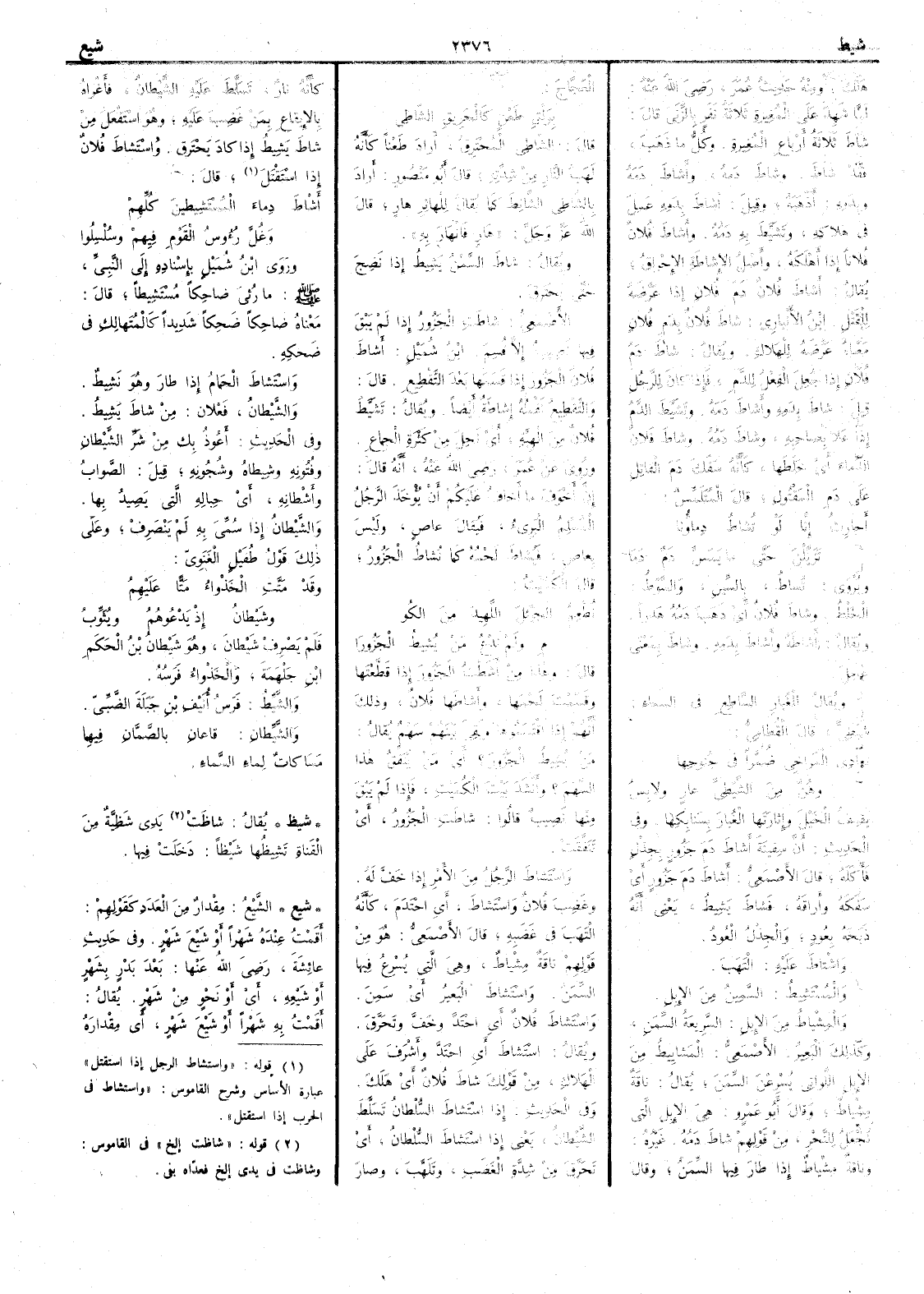 هلَك ومنه حديث عمر رضي اللّه عنه لما شَهِدَ على المُغيرة ثلاثةُ نَفَرٍ بالزِّنا قال شاطَ ثلاثةُ أَرباع المُغيرة وكلُّ ما ذهَب فقد شاطَ وشاطَ دَمُه وأَشاطَ دمَه وبدَمِه أَذْهَبَه وقيل أَشاطَ فلان فلاناً إِذا أَهْلَكه وأَصلُ الإِشاطةِ الإِحْراقُ يقال أَشاط بدَمِه عَمِل في هَلاكِه وتَشَيَّطَ دمُه وأَشاطَ فلان دمَ فلانٍ إِذا عَرَّضه للقتل ابن الأَنباري شاطَ فلانٌ بدم فلانٍ معناه عَرَّضه للهَلاك ويقال شاط دمُ فلان إِذا جُعل الفعل للدّمِ فإِذا كان للرجلِ قيل شاط بدمِه وأَشاط دمَه وتشيَّطَ الدمُ إِذا عَلا بصاحبه وشاط دمُه وشاط فلانٌ الدِّماء أَي خلَطَها كأَنه سَفَكَ دمَ القاتل على دم المقتول قال المتلَمِّسُ أَحارِثُ إِنَّا لو تُشاطُ دِماؤنا تَزَيَّلْن حتى ما يَمَسّ دَمٌ دَما ويروى تُساطُ بالسين والسَّوْطُ الخَلْط وشاطَ فلان أَي ذهب دمُه هَدَراً ويقال أَشاطَه وأَشاطَ بدمِه وشاطَ بمعنى عَجِلَ ويقال للغُبار السَّاطِعِ في السماء شَيْطِيٌّ قال القطامي تَعادِي المَراخِي ضُمَّراً في جُنوحِها وهُنَّ من الشَّيطِيّ عارٍ ولابِسُ يصف الخيل وإِثارَتَها الغُبارَ بسنابِكها وفي الحديث أَنَّ سَفِينةَ أَشاطَ دمَ جَزُورٍ بِجِذْلٍ فأَكَله قال الأَصمعي أَشاطَ دمَ جَزُورٍ أَي سَفَكَه وأَراقه فشاطَ يَشِيطُ يعني أَنه ذبحه بعُود والجذل العود واشْتاطَ عليه الْتَهَب والمُسْتَشِيطُ السَّمين من الإِبل والمِشْياطُ من الإِبل السريعةُ السِّمَنِ وكذلك البعير الأَصمعي المَشايِيطُ من الإِبل اللَّواتي يُسْرِعن السِّمَن يقال ناقةِ مِشْياطٌ وقال أَبو عمرو هي الإِبل التي تجعل للنَّحْر من قولهم شاطَ دمُه غيره وناقة مِشْياطٌ إِذا طارَ فيها السِّمنُ وقال العجاج بوَلْقِ طَعْنٍ كالحَرِيقِ الشّاطي قال الشّاطي المُحْتَرِق أَرادَ طَعْناً كأَنه لَهَبُ النار من شدَّته قال أَبو منصور أَراد بالشاطي الشائطَ كما يقال للهائر هارِ قال اللّه عزّ وجلّ هارٍ فانْهارَ به ويقال شاطَ السَّمْنُ يَشِيطُ إِذا نَضِجَ حتى يحترق الأَصمعي شاطَتِ الجَزُور إِذا لم يبق فيها نصيب إِلا قُسم ابن شميل أَشاطَ فلان الجزور إِذا قسَمها بعد التقطيع قال والتقطيعُ نفْسه إِشاطةٌ أَيضاً ويقال تَشَيَّطَ فلان من الهِبّةِ أَي نَحِلَ من كثرة الجماع وروي عن عمر رضي اللّه عنه أَنه قال إِنَّ أَخْوفَ ما أَخافُ عليكم أَن يؤخذ الرجلُ المسلمُ البريء فيقالَ عاصٍ وليس بعاص فيُشاطَ لحمُه كما تُشاطُ الجَزُور قال الكميت نُطْعِمُ الجَيْأَلَ اللَّهِيدَ من الكوُ مِ ولم نَدْعُ من يُشِيطُ الجَزُورا قال وهذا من أَشَطْتُ الجزور إِذا قطَّعْتها وقسَّمت لحمها وأَشاطَها فلان وذلك أَنهم إِذا اقْتَسَمُوها وبقي بينهم سهم فيقال من يُشِيطُ الجَزُور أَي من يُنَفِّقُ هذا السهمَ وأَنشد بيت الكميت فإِذا لم يبق منها نصيب قالوا شاطت الجزور أَي تنَفَّقَتْ واسْتَشاطَ الرجلُ من الأَمر إِذا خَفّ له وغَضِبَ فلان واسْتشاطَ أَي احْتَدَم كأَنه التهب في غضَبِه قال الأَصمعي هو من قولهم ناقة مِشْياط وهي التي يُسْرِع فيها السِّمَن واسْتَشاطَ البعير أَي سَمِن واستشاط فلان أَي احْتَدَّ وخَفّ وتحرّقَ ويقال استشاط أَي احتدَّ وأَشرف على الهَلاكِ من قولك شاطَ فلان أَي هلَك وفي الحديث إِذا اسْتَشاطَ السُّلْطان تَسَلَّطَ الشيطان يعني إِذا استشاط السلطان أَي تحرَّقَ من شدَّة الغضَب وتلهَّب وصار كأَنه نار تسلَّط عليه الشيطانُ فأَغْراه بالإِيقاع بمن غَضب عليه وهو اسْتَفْعَلَ من شاطَ يَشِيط إِذا كاد يحترق واستشاط فلان إِذا اسْتَقْتَل قال أَشاطَ دِماء المُسْتَشِيطِين كلِّهم وغُلَّ رُؤوسُ القومِ فيهم وسُلْسِلُوا وروى ابن شميل بإِسناده إِلى النبي صلّى اللّه عليه وسلّم ما رؤي ضاحِكاً مُسْتَشِيطاً قال معناه ضاحكاً ضَحِكاً شديداً كالمُتَهالِكِ في ضَحِكه واسْتشاطَ الحَمامُ إِذا طارَ وهو نشِيطٌ والشيْطان فَعْلان من شاطَ يَشِيط وفي الحديث أَعُوذ بك من شرِّ ا