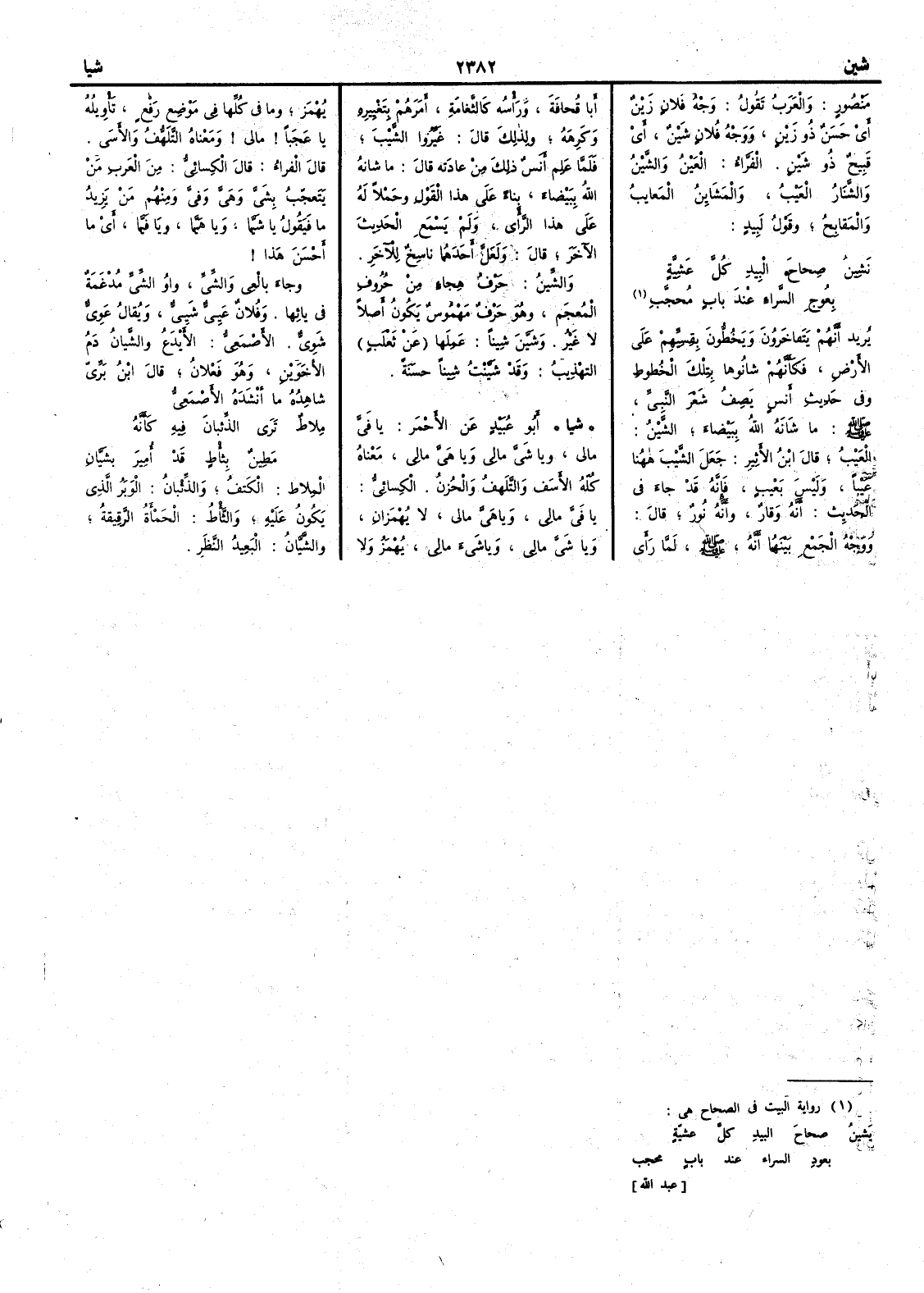 منصور : والعرب تقول وجه فلان زَيْنٌ أي حسن ذو زَيْنٍ ووجه فلان شَيْنٌ أي قبيح ذو شَيْنٍ . الفراء : العَيْنُ و الشَّيْنُ والشَّنَارُ العَيْبُ و المَشَاين المَعايب والمَقابح وقول لبيد : نَشِينُ صِحاحَ البِيدِ كلَّ عَشِيَّةٍ بعُوجِ السَّراءِ عند بابٍ مُحَجَّبِ يريد أنهم يتفاخرون ويخطُّون بِقسِيِّهم على الأَرض فكأَنهم شانوها بتلك الخطوط . وفي حديث أنس يصف شَعْرَ النبي : ما شانه اللَّهُ ببَيْضاء الشَّيْنُ : العيبُ قال ابن الأَثير : جعل الشيب ههنا عيباً وليس بعيب فإِنه قد جاء في الحديث : أنه وَقار وأنه نور قال : ووجه الجمع بينهما أنه لَمَّا رأى أبا قُحافَة رأْسه كالثَّغَامة أمرهم بتغييره وكرهه ولذلك قال غَيِّرُوا الشيب فلما علم أنس ذلك من عادته قال : ما شانه الله ببيضاء بناء على هذا القول وحملاً له على هذا الرأي ولم يسمع الحديث الآخر قال : ولعل أحدهما ناسخ للآخر . و الشِّين : حرف هجاء من حروف المعجم وهو حرف مهموس يكون أصلاً لا غير . و شَيَّنَ شِيناً : عَمِلَها عن ثعلب . التهذيب : وقد شَيَّنْتُ شِيناً حَسَنة