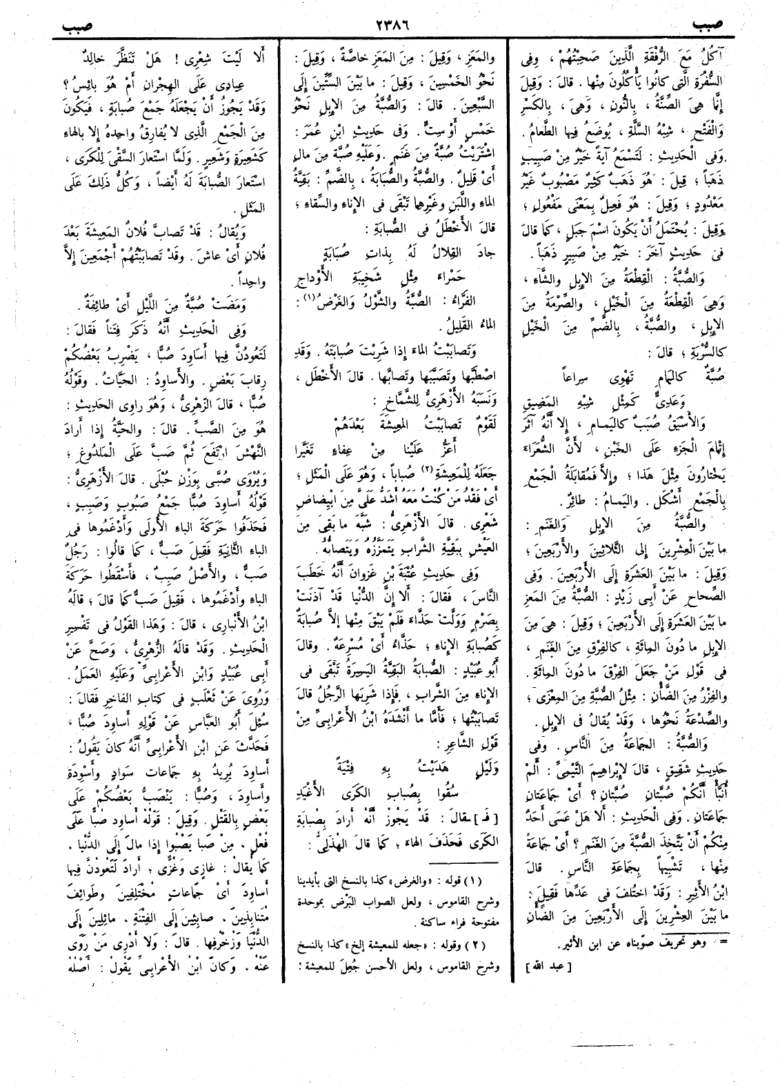 وقد يجوز أَِن يجعله جمع صُبابة فيكون من الجمع الذي لا يفارق واحده إِلا بالهاءِ كشعيرة وشعير ولما استعار السقي للكرى استعار الصُّبابة له أَيضاً وكل ذلك على المثل ويقال قد تَصابَّ فلان [ ص 517 ] المعِيشَةَ بعد فلان أَي عاش وقد تَصابَبْتهم أَجمعين إِلا واحداً ومضت صُبَّة من الليل أَي طائفة وفي الحديث أَنه ذكر فتناً فقال لَتَعُودُنَّ فيها أَسَاوِدَ صُبّاً يضْرِبُ بعضُكم رِقابَ بعض والأَساود الحيَّات وقوله صُبّاً قال الزهري وهو راوي الحديث هو من الصَّبِّ قال والحية إِذا أَراد النَّهْش ارتفع ثم صَبَّ على الملدوغ ويروى صُبَّى بوزن حُبْلى قال الأَزهري قوله أَساوِدَ صُبّاً جمع صَبُوب وصَبِب فحذفوا حركة الباء الأُولى وأَدغموها في الباءِ الثانية فقيل صَبٌّ كما قالوا رجل صَبٌّ والأَصل صَبِبٌ فأَسقطوا حركة الباء وأَدغموها فقيل صَبٌّ كما قال قاله ابن الأَنباري قال وهذا القول في تفسير الحديث وقد قاله الزهري وصح عن أَبي عبيد وابن الأَعرابي وعليه العمل وروي عن ثعلب في كتاب الفاخر فقال سئل أَبو العباس عن قوله أَساوِدَ صُبّاً فحدث عن ابن الأَعرابي أَنه كان يقول أَساوِدَ يريد به جماعاتٍ سَواد وأَسْوِدَة وأَساوِد وصُبّاً يَنْصَبُّ بعضكم على بعض بالقتل وقيل قوله أَساود صُبّاً على فُعْل من صَبا يَصْبو إِذا مال إِلى الدنيا كما يقال غازَى وغَزا أَراد لَتَعُودُنَّ فيها أَساود أَي جماعات مختلفين وطوائفَ متنابذين صابئين إِلى الفِتْنة مائلين إِلى الدنيا وزُخْرُفها قال ولا أَدري من روى عنه وكان ابن الأَعرابي يقول أَصله