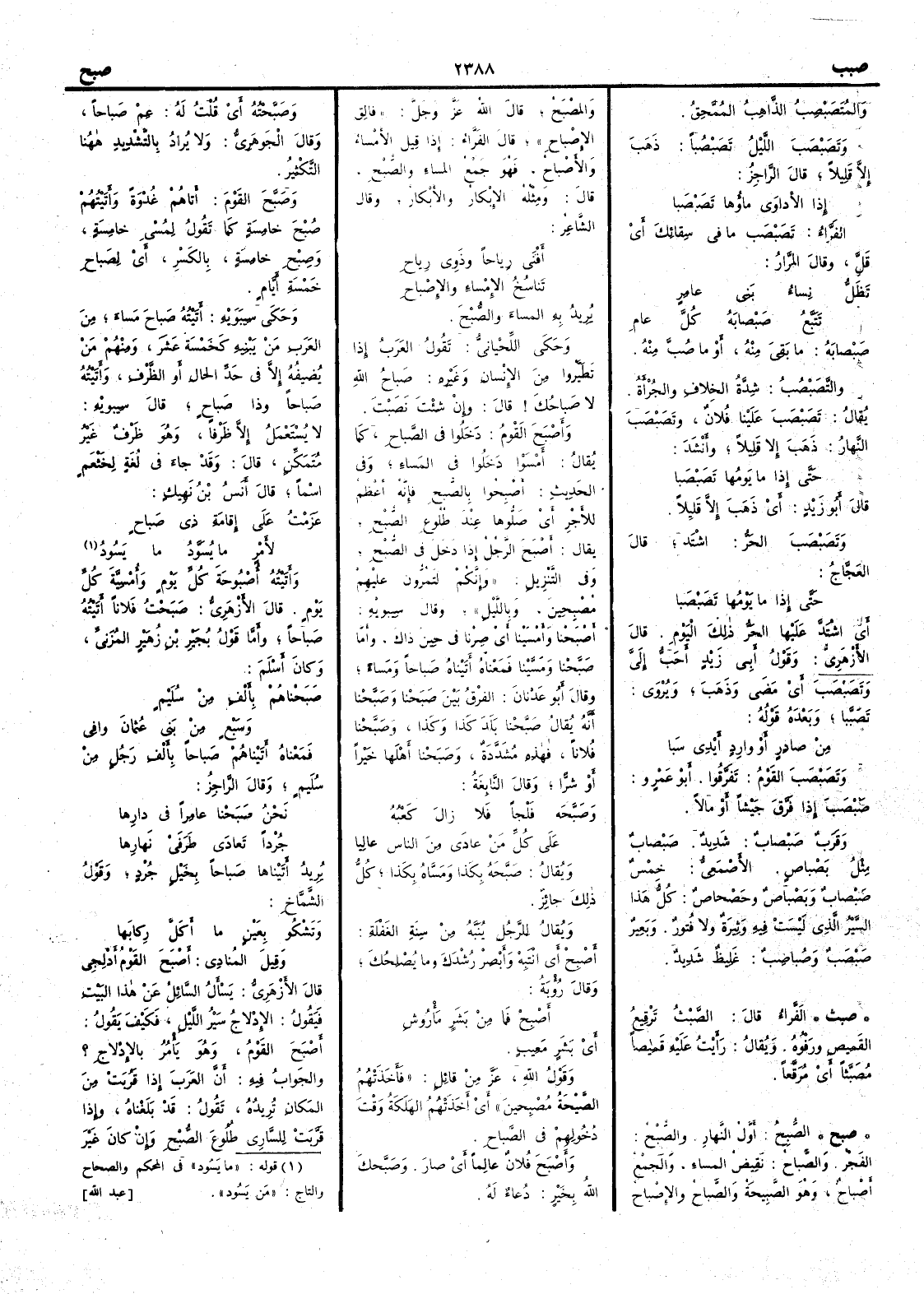 صَبْصابهُ ما بقي منه أَو ما صُبَّ منه والتَّصَبْصُبُ شدّة الخِلاف والجُرْأَة يقال تَصَبْصَبَ علينا فلان وتَصَبْصَبَ النهارُ ذهب إِلا قليلاً وأَنشد حتى إِذا ما يَومُها تَصَبْصَبا قال أَبو زيد أَي ذهب إِلا قليلاً وتصَبْصب الحرُّ اشتدّ قال العجاج حتى إِذا ما يومها تصبصبا أَي اشتد عليها الحرّ ذلك اليوم قال الأَزهري وقول أَبي زيد أَحب إِليَّ وتصبصب أَي مضى وذهب ويروى تصبّبا وبعده قوله من صادِرٍ أَو وارِدٍ أَيدي سبا وتصَبْصَب القوم تفرقوا أَبو عمرو صبصب إِذا فرَّق جَيشاً أَو مالاً وقَرَبٌ صَبْصاب شديد صَبصابٌ مثل بَصْباص الأَصمعي خِمْسٌ صبْصاب وبَصْباص وحَصْحاص كل هذا السير الذي ليست فيه وَثِيرة ولا فُتور وبعير صَبْصَب وصُباصِبٌ غليظ شديد ( صبث ) الفراء قال الصَّبْثُ تَرْقِيعُ القَمِيصِ ورَفْوُه ويقال رأُيت عليه قَميصاً مُصَبَّثاً أَي مُرَقَّعاً( صبح ) الصُّبْحُ أَوّل النهار والصُّبْحُ الفجر والصَّباحُ نقيص المَساء والجمع أَصْباحٌ وهو الصَّبيحةُ والصَّباحُ والإِصْباحُ والمُصْبَحُ قال الله عز وجل فالِقُ الإِصْباحِ قال الفراء إِذا قيل الأَمْسَاء والأَصْباح فهو جمع المَساء والصُّبْح قال ومثله الإِبْكارُ والأَبْكارُ وقال الشاعر أَفْنَى رِياحاً وذَوِي رِياحِ تَناسُخُ الإِمْساءِ والإِصْباحِ يريد به المَساء والصُّبْحَ وحكى اللحياني تقول العربُ إِذا تَطَيَّرُوا من الإِنسان وغيره صباحُ الله لا صَباحُك قال وإِن شئت نصبتَ وأَصْبَحَ القومُ دخلوا في الصَّباح كما يقال أَمْسَوْا دخلوا في المساء وفي الحديث أَصْبِحُوا بالصُّبحِ فإِنه أَعظم للأَجر أَي صلوها عند طلوع الصُّبْح يقال أَصْبَحَ الرجل إِذا دخل في الصُّبْح وفي التنزيل وإِنكم لَتَمُرُّون عليهم مُصْبِحِينَ وبالليل وقال سيبويه أَصْبَحْنا وأَمْسَينا أَي صرنا في حين ذاك وأَما صَبَّحْنا ومَسَّيْنا فمعناه أَتيناه صَباحاً ومساء وقال أَبو عدنان الفرق بين صَبَحْنا وصَبَّحْنا أَنه يقال صَبَّحْنا بلد كذا وكذا وصَبَّحْنا فلاناً فهذه مُشَدَّدة وصَبَحْنا أَهلَها خيراً أَو شرّاً وقال النابغة وصَبَّحَه فَلْجاً فلا زال كَعْبُه عل كلِّ من عادى من الناسِ عاليا ويقال صَبَّحَه بكذا ومسَّاه بكذا كل ذلك جائز ويقال للرجل يُنَبَّه من سِنَةِ الغَفْلة أَصْبِحْ أَي انْتَبِهْ وأَبْصِرْ رُشْدَك وما يُصْلِحُك وقال رؤبة أَصْبِحْ فما من بَشَرٍ مَأْرُوشِ أَي بَشَرٍ مَعِيبٍ وقول الله عز من قائل فأَخذتهم الصَّيْحةُ مُصْبِحِين أَي أَخذتهم الهَلَكة وقت دخولهم في الصباح وأَصْبَحَ فلان عالماً أَي صار وصَبَّحك الله بخير دُعاء له وصَبَّحْته أَي قلت له عِمْ صَباحاً وقال الجوهري ولا يُرادُ بالتشديد ههنا التكثير وصَبَّحَ القومَ أَتاهم غُدْوَةً وأَتيتهم صُبْحَ خامِسةٍ كما تقول لِمُسْيِ خامسةٍ وصِبْحِ خامسة بالكسر أَي لِصَباحِ خمسة أَيام وحكى سيبويه أَتيته صَباحَ مَساءَ من العرب من يبنيه كخمسة عشر ومنهم من يضيفه إِلا في حَدِّ الحال أَو الظرف وأَتيته صَباحاً وذا صَباحٍ قال سيبويه لا يستعمل إِلاَّ ظرفاً وهو ظرف غير متمكن قال وقد جاء في لغة لِخَثْعَم اسماً قال أَنس ابنُ نُهَيْكٍ عَزَمْتُ على إِقامةِ ذي صباحٍ لأَمْرٍ ما يُسَوَّدُ ما يَسُودُ وأَتيته أُصْبُوحةَ كل يوم وأُمْسِيَّةَ كلِّ يوم قال الأَزهري صَبَحْتُ فلاناً أَتيته صباحاً وأَما قول بُجَيْر بن زُهير المزنيِّ وكان أَسلم صَبَحْناهمْ بأَلفٍ من سُلَيْمٍ وسَبْعٍ من بني عُثمانَ وافى فمعناه أَتيناهم صَباحاً بأَلف رجل من سُليم وقال الراجز نحْنُ صَبَحْنا عامراً في دارِها جُرْداً تَعادَى طَرَفَيْ نَهارِها يريد أَتيناها صباحاً بخيل جُرْد وقول الشَّمَّاخ وتَشْكُو بعَيْنٍ ما أَكَلَّ رِكابَها وقيلَ المُنادِي أَصْبَحَ القومُ أَدْلِجِي قال الأَزهري يسأَل السائل عن هذا البيت فيقول الإِدلاج سير الليل فكيف يقول أَصبح القوم وهو يأْمر بالإِدلاج ؟ والجواب فيه أَن العرب إِذا قربت