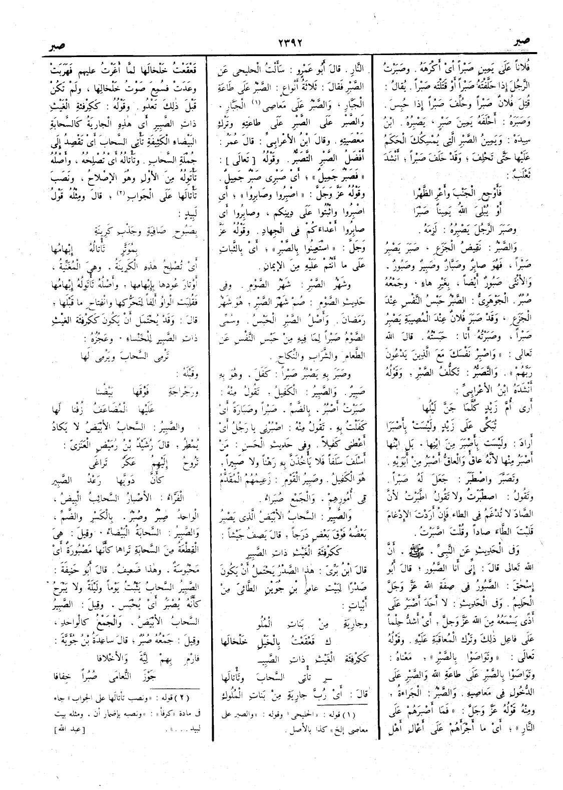 ( * قوله « الحليحي » وقوله « والصبر على معاصي إلخ » كذا بالأَصل ) الجَبَّار والصَّبر على الصَّبر على طاعته وتَرْك معصيته وقال ابن الأَعرابي قال عُمر أَفضل الصَّبر التَّصَبر وقوله فَصَبْرٌ جَمِيل أَي صَبْرِي صَبْرٌ جَمِيل وقوله عز وجل اصْبِرُوا وصَابِرُوا أَي اصْبِرُوا واثْبُتُوا على دِينِكم وصابروا أَي صابروا أَعداءَكُم في الجِهاد وقوله عز وجل اسْتَعِينوا بالصَّبْرِ أَي بالثبات على ما أَنتم عليه من الإِيمان وشَهْرُ الصَّبْرِ شهر الصَّوْم وفي حديث الصَّوْم صُمْ شَهْرَ الصَّبْر هُوَ شهرُ رمضان وأَصل الصَّبْرِ الحَبْس وسُمِّي الصومُ صَبْراً لِمَا فيه من حَبْس النفس عن الطَّعام والشَّرَاب والنِّكاح وصَبَرَ به يَصْبُرُ صَبْراً كَفَلَ وهو بِهِ صَبِيرٌ والصَّبِيرُ الكَفِيل تقول منه صَبَرْتُ أَصْبُرُ بالضَّم صَبْراً وصَبَارة أَي كَفَلْت به تقول منه اصْبُرْني يا رجل أَي أَعْطِنِي كَفِيلاً وفي حديث الحسَن مَنْ أَسْلَفَ سَلَفاً فَلا يأْخُذَنَّ به رَهْناً ولا صَبِيراً هو الكفِيل وصَبِير القوم زَعِيمُهم المُقَدَّم في أُمُورِهم والجمع صُبَراء والصَّبِيرُ السحاب الأَبيض الذي يصبرُ بعضه فوق بعض درجاً قال يصِف جَيْشاً كَكِرْفِئَة الغَيْث ذاتِ الصبِير قال ابن بري هذا الصدر يحتمل أَن يكون صدراً لبيت عامر بن جوين الطائي من أَبيات وجارِيَةٍ من بَنَات المُلُو ك قَعْقَعْتُ بالخيْل خَلْخالَها كَكِرْفِئَة الغَيْث ذات الصَّبِي رِ تأْتِي السَّحابَ وتَأْتالَها قال أَي رُبَّ جارية من بَنات المُلُوك قَعْقَعتُ خَلْخَالَها لَمَّا أَغَرْت عليهم فهَرَبَتْ وعَدَت فسُمِع صَوْت خَلْخَالِها ولم تكن قبل ذلك تَعْدُو وقوله كَكِرْفِئَة الغَيْث ذات الصَّبِيرِ أَي هذه الجارية كالسَّحابة البَيْضاء الكَثِيفة تأْتي السَّحاب أَي تقصِدُ إِلى جُمْلَة السَّحاب وتأْتالُه أَي تُصْلِحُه وأَصله تأْتَوِلُهُ من الأَوْل وهو الإِصْلاح ونصب تأْتالَها على الجواب قال ومثله قول لبيد بِصَبُوحِ صَافِيَة وجَذْب كَرِينَةٍ بِمُوَتَّرٍ تَأْتالُه إِبهامُها أَي تُصْلِح هذه الكَرِينَة وهي المُغَنِّية أَوْتار عُودِها بِإِبْهامِها وأَصله تَأْتَوِلُه إِبْهامُها فقلبت الواو أَلفاً لتحركها وانفتاح ما قبلها قال وقد يحتمل أَن يكون كَكِرْفِئَة الغيْث ذات الصبير للْخَنْسَاء وعجزه تَرْمِي السَّحابَ ويَرْمِي لَها وقبله ورَجْراجَة فَوْقَها بَيْضُنا عليها المُضَاعَفُ زُفْنا لَها والصَّبِير السحاب الأَبيض لا يكاد يُمطِر قال رُشَيْد بن رُمَيْض العَنَزيّ تَرُوح إِليهمُ عَكَرٌ تَراغَى كأَن دَوِيَّها رَعْدُ الصَّبِير الفراء الأَصْبار السحائب البيض الواحد صِبْر وصُبْر بالكسر والضم والصَّبِير السحابة البيضاء وقيل هي القطعة من السحابة تراها كأَنها مَصْبُورة أَي محبُوسة وهذا ضعيف قال أَبو حنيفة الصَّبير السحاب يثبت يوماً وليلة ولا يبرَح كأَنه يُصْبَرُ أَي يحبس وقيل الصَّبِير السحاب الأَبيض والجمع كالواحد وقيل جمعه صُبُرٌ قال ساعدة بن جؤية فارْمِ بِهم لِيَّةَ والأَخْلافا جَوْزَ النُّعامَى صُبُراً خِفافا
