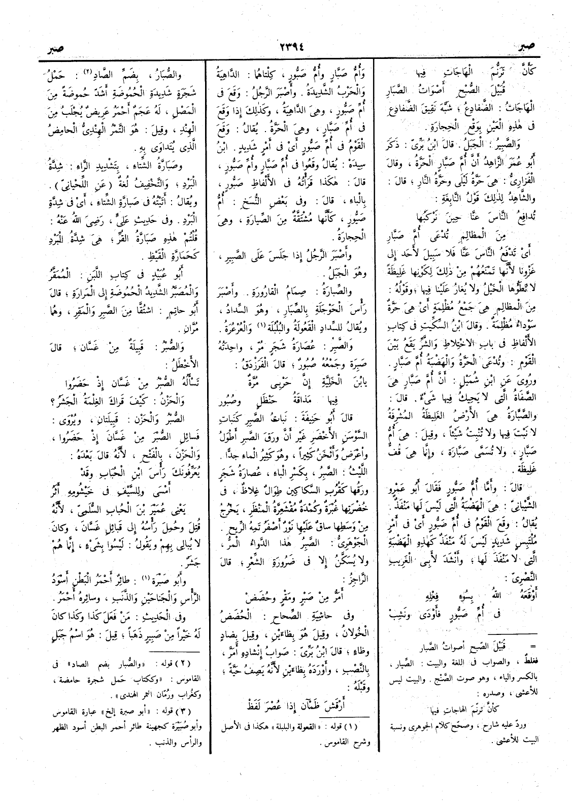 كأَن تَرَنُّمَ الهَاجَاتِ فيها قُبَيْلَ الصُّبح أَصْوَات الصَّبَارِ الهَاجَات الضَّفادِع شبَّه نَقِيق الضفادع في هذه العين بوقع الحجارة والصَّبِير الجَبَل قال ابن بري اذكر أَبو عمر الزاهد أَن أُم صَبَّار الحرّة وقال الفزاري هي حرة ليلى وحرَّة النار قال والشاهد لذلك قول النابغة تُدافِع الناسَ عنّا حِين نَرْكَبُها من المظالم تُدْعَى أُمَّ صَبَّار أَي تَدْفَعُ الناس عنّا فلا سَبِيل لأَحد إِلى غَزْوِنا لأَنها تمنعهم من ذلك لكونها غَلِيظة لا تَطَؤُها الخيل ولا يُغار علينا فيها وقوله من المظالم هي جمع مُظْلِمة أَي هي حَرَّة سوداء مُظْلِمة وقال ابن السكِّيت في كتاب الأَلفاظ في باب الاختلاط والشرِّ يقع بين القوم وتدعى الحرَّة والهَضْبَةُ أُمَّ صَبَّار وروي عن ابن شميل أَن أُم صَبَّار هي الصَّفَاة التي لا يَحِيك فيها شيء قال والصَّبَّارة هي الأَرض الغَلِيظة المُشْرفة لا نبت فيها ولا تُنبِت شيئاً وقيل هي أُم صَبَّار ولا تُسمَّى صَبَّارة وإِنما هي قُفٌّ غليظة قال وأَما أُمّ صَبُّور فقال أَبو عمرو الشيباني هي الهَضْبة التي ليس لها منفَذ يقال وقع القوم في أُمّ صَبُّور أَي في أَمرٍ ملتبِس شديد ليس له منفَذ كهذه الهَضْبة التي لا منفَذ لها وأَنشد لأَبي الغريب النصري أَوْقَعَه اللهُ بِسُوءٍ فعْلِهِ في أُمِّ صَبُّور فأَودَى ونَشِبْ وأُمّ صَبَّار وأُمُّ صَبُّور كلتاهما الداهية والحرب الشديدة وأَصبر الرجلُ وقع في أُم صَبُّور وهي الداهية وكذلك إِذا وقع في أُم صَبَّار وهي الحرَّة يقال وقع القوم في أُم صَبُّور أَي في أَمر شديد ابن سيده يقال وقعوا في أُم صَبَّار وأُم صَبُّور قال هكذا قرأْته في الأَلفاظ صَبُّور بالباء قال وفي بعض النسخ أُم صيُّور كأَنها مشتقَّة من الصِّيارة وهي الحجارة وأَصْبَرَ الرجلُ إِذا جلس على الصَّبِير وهو الجبل والصِّبَارة صِمَام القارُورَة وأَصبر رأْسَ الحَوْجَلَة بالصِّبَار وهو السِّداد ويقال للسِّداد القعولة والبُلْبُلَة