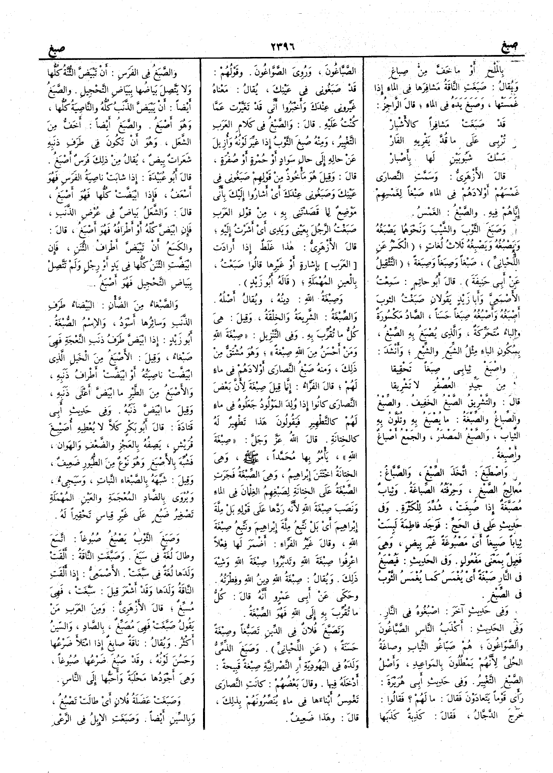 بالمِلْحِ أَو ما خَفَّ من صِباغِ ويقال صَبَغَتِ الناقةُ مَشافِرَها في الماء إذا غَمَسَتْها وصَبَغَ يدَه في الماء قال الراجز قد صَبَغَتْ مَشافِراً كالأَشْبارْ تُرْبِي على ما قُدَّ يَفْرِيهِ الفَارْ مَسْكَ شَبُوبَينِ لها بأَصْبارْ قال الأَزهري وسمَّتِ النصارى غَمْسَهم أَوْلادَهم في الماء صَبْغاً لغَمْسِهم إياهم فيه والصَّبْغُ الغَمْسُ وصَبَغَ الثوبَ والشَّيْبَ ونحوَهما يَصْبَغُه ويَصْبُغُه ويَصْبِغُه ثلاتُ لغاتٍ الكسر عن اللحياني صَبْغاً وصِبْغاً وصِبَغةً التثقيل عن أَبي حنيفة قال أَبو حاتم سمعت الأَصمعي وأَبا زيد يقولان صَبَغْتُ الثوبَ أَصْبَغُه وأَصْبُغُه صِبَغاً حسناً الصاد مكسورة والباء متحركة والذي يصبغ به الصِّبْغُ بسكون الباء مثل الشِّبَعِ والشِّبْع وأَنشد واصْبَغْ ثِيابي صِبَغاً تَحْقِيقا مِن جَيِّدِ العُصْفُرِ لا تَشْرِيقا قال والتَّشْرِيقُ الصَّبْغُ الخفيفُ والصِّبْغُ والصِّباغُ والصِّبْغةُ ما يُصْبَغُ به وتُلَوَّنُ به الثياب والصَّبْغُ المصدر والجمع أَصْباغٌ وأَصْبِغةٌ واصْطَبَغَ اتَّخَذَ الصِّبْغَ والصِّباغُ مُعالِجُ الصّبْغِ وحِرْفته الصِّباغةُ وثيابٌ مُصَبَّغةٌ إِذا صُبِغَتْ شُدِّدَ للكثرة وفي حديث علي في الحج فوجَد فاطمة لَبِسَتْ ثياباً صَبِيغاً أَي مَصْبوغة غير بيض وهي فَعِيل بمعنى مَفْعول وفي الحديث فَيُصْبَغُ في النار صَبْغةً أَي يُغْمَسُ كما يُغْمَسُ الثوبُ في الصِّبْغ وفي حديث آخر اصْبُغُوه في النار وفي الحديث أَكْذَبُ الناسِ الصبّاغُون والصَّوّاغُون هم صَبّاغو الثياب وصاغةُ الحُلِيِّ لأَنهم يَمْطُلُون بالمَواعِيد وأَصله الصَّبْغُ التغيير وفي حديث أَبي هريرة رأَى قوماً يَتَعادَوْنَ فقال ما لهم ؟ فقالوا خرج الدَّجّالُ فقال كَذِبةٌ كَذَبَها الصّباغُون وروي الصوَّاغون وقولهم قد صَبَغُوني في عَيْنِكَ يقال معناه غَيَّروني عندك وأَخبروا أَني قد تغيرت عما كنت عليه قال والصَّبْغُ في كلام العرب التَّغْيِيرُ ومنه صُبِغَ الثوبُ إذا غُيِّرَ لَونُه وأُزِيلَ عن حاله إلى حالِ سَوادٍ أَو حُمْرةٍ أَو صُفْرةٍ قال وقيل هو مأْخوذ من قولهم صَبَغُوني في عينك وصَبغوني عندك أَي أَشارُوا إليك بأَني موضع لما قَصَدْتَني به من قوْلِ العرب صَبَغْتُ الرجلَ بعيني ويدي أَي أَشَرْتُ إليه قال الأَزهري هذا غلط إذا أَرادت بإشارةٍ أَو غيرها قالوا صَبَعْت بالعين المهملة قال أَبو زيد وصِبْغةُ الله دِينُه ويقال أَصلُه والصِّبغةُ الشرِيعةُ والخِلقةُ وقيل هي كل ما تُقُرِّبَ به وفي التنزيل صِبْغةَ الله ومَنْ أَحْسَنُ من اللهِ صِبْغةً وهي مشتقٌّ من ذلك ومنه صَبْغُ النصارى أَولادهم في ماء لهم قال الفراء إنما قيل صِبْغةَ لأَن بعض النصارى كانوا إذا وُلِدَ المولود جعلوه في ماءٍ لهم كالتطهير فيقولون هذا تطهير له كالخِتانة قال الله عز وجل قل صبغة الله يأْمر بها محمداً صلى الله عليه وسلم وهي الخِتانةُ اخْتَتَنَ إِبراهيم وهي الصِّبْغَةُ فجرت الصِّبْغة على الخِتانة لصَبْغهم الغِلْمانَ في الماء ونصب صبغةَ الله لأَنه رَدَّها على قوله بل مِلَّةَ إبراهيم أَي بل نَتَّبِع مِلَّة إبراعهيم ونتَّبِع صبغةَ الله وقال غير الفراء أَضمر لها فعلاً اعْرِفُوا صِبْغة الله وتدبَّرُوا صبغة الله وشبه ذلك ويقال صبغةُ الله دِينُ الله وفِطْرته وحكي عن أَبي عمرو أَنه قال كل ما تُقُرِّبَ به إلى الله فهو الصبغة وتَصَبَّغَ فلان في الدين تَصَبُّغاً وصِبغةً حَسَنةً عن اللحياني وصَبَغَ الذَّمِّيُّ ولدَه في اليهوديّة أَو النصرانية صِبْغةً قبيحة أَدخلها فيها وقال بعضهم كانت النصارى تَغْمِسُ أَبناءها في ماء يُنَصِّرونهم بذلك قال وهذا ضعيف والصَّبَغُ في الفرس أَن تَبْيَضَّ الثُّنّةُ كلُّها ولا يَتَّصلَ بياضُها ببَياضِ التَّحْجِِيلِ والصَّبَغُ أَيضاً أَن يَبْيَضَّ الذنَبُ كله والناصيةُ كلها وهو أَصْبَغُ والصَّبَغُ أَيضاً أَخَفُّ من الشَّعَل وهو أَن تكون في 