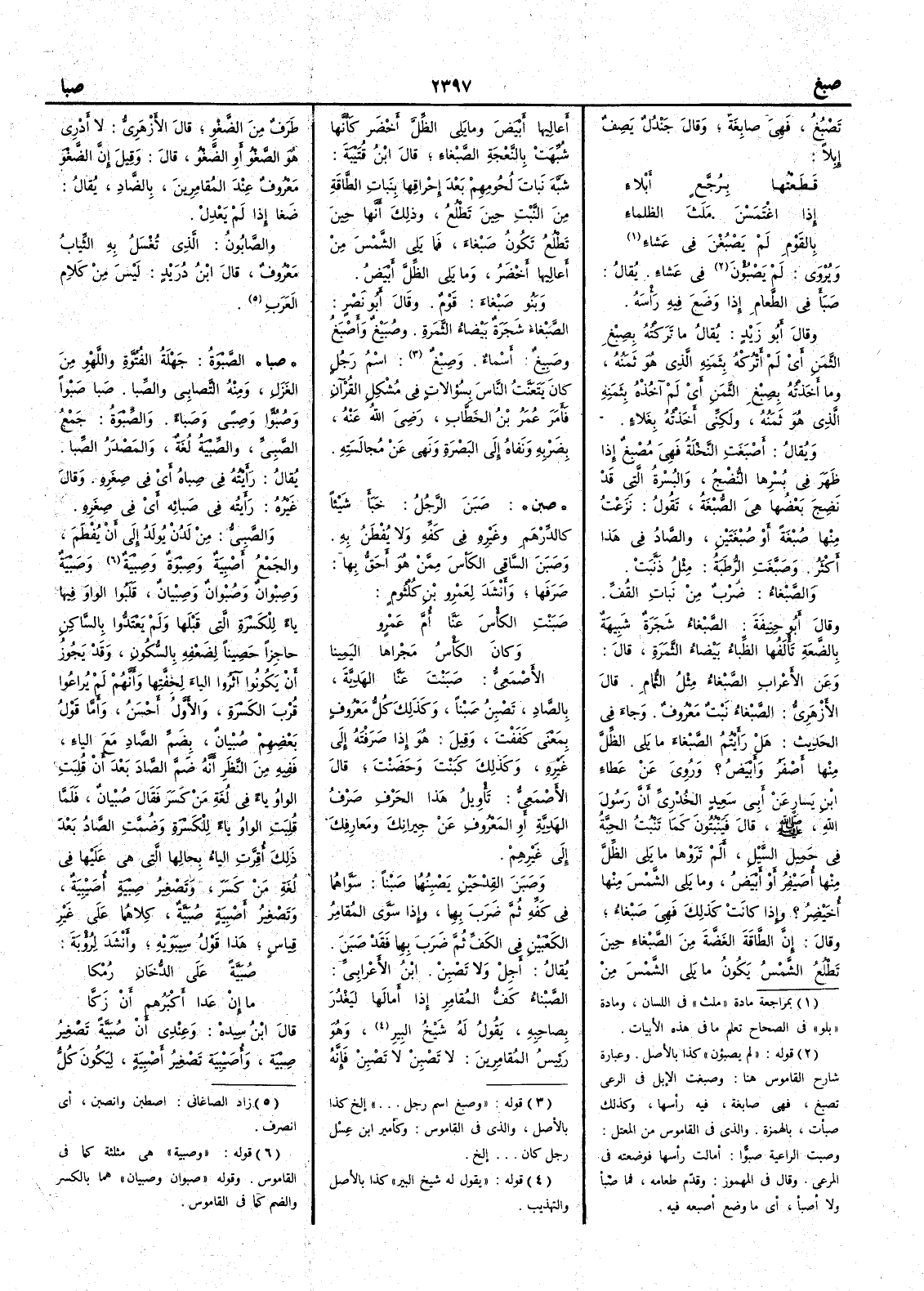 تَصْبُغُ فهي صابغةٌ وقال جندل يصف إِبلاً قَطَعْتُها بِرُجَّعٍ أَبْلاءِ إذا اغْتَمَسْنَ مَلَثَ الظَّلْماءِ بالقَوْمِ لم يَصْبُغْنَ في عَشاءِ ويروى لم يَصْبُؤْنَ في عَشاء يقال صَبأَ في الطعام إذا وضَعَ فيه رأْسَه وقال أَبو زيد يقال ما تَرَكْتُه بِصِبْغ الثَّمَنِ أَي لم أَتركه بثَمَنِه الذي هو ثمنه وما أَخذته بِصِبْغ الثمن أَي لم آخذه بثمنه الذي هو ثمنه ولكني أَخذته بِغلاَءٍ ويقال أَصْبَغَتِ النخلةُ فهي مُصْبِغٌ إذا ظَهر في بُسْرِها النُّضْجُ والبُسْرةُ التي قد نَضِجَ بعضها هي الصُّبْغةُ تقول نَزَعْتُ منها صُبْغةً أَو صُبْغَتَينِ والصاد في هذا أَكثر وصَبَّغَت الرُّطَبةُ مثل ذنَّبَتْ والصَّبْغاءُ ضَرْبٌ من نبات القُفِّ وقال أَبو حنيفة الصَّبْغاء شجرة شبيهة بالضَّعةِ تأْلَفُها الظِّباء بيضاء الثمرة قال وعن الأَعراب الصَّبْغاءُ مثل الثُّمامِ قال الأَزهري الصَّبْغاءُ نبت معروف وجاء في الحديث هل رأَيتم الصَّبْغاء ما يَلي الظلَّ منها أَصفرُ وأَبيضُ ؟ وروي عن عطاء بن يسار عن أَبي سعيد الخُدْري أَن رسول الله صلى الله عليه وسلم قال فَيَنْبُتُونَ كما تَنْبُتُُ الحِبَّةُ في حَمِيل السيْلِ أَلم تَرَوْها ما يَلِي الظلَّ منها أُصَيْفِرُ أَو أَبيضُ وما يلي الشمسَ منها أُخَيْضِرُ ؟ وإذا كانت كذلك فهي صَبْغاءُ وقال إِنَّ الطاقَةَ الغَضَّةَ من الصبْغاء حين تَطْلُعُ الشمسُ يكون ما يلي الشمسَ من أَعالِيها أَبيضَ وما يلي الظلَّ أَخضر كأَنها شبهت بالنعجة الصبغاء قال ابن قتيبة شَبَّه نَباتَ لحومهم بعد إحْراقِها بنبات الطاقة من النبت حين تطلُع وذلك أَنها حين تطلُع تكون صَبْغاء فما يلي الشمسَ من أَعالِيها أَخضرُ وما يلي الظلَّ أَبيضُ وبنو صَبْغاء قوم وقال أَبو نصر الصَّبْغاء شجرة بيضاء الثمرةِ وصُبَيْغٌ وأَصْبَغُ وصبِيغٌ أَسماء وصِبْغٌ اسم رجل كان يَتَعَنَّتُ الناسَ بسُؤالات في مُشْكِل القرآن فأَمر عمر بن الخطاب رضي الله عنه بضربه ونفاه إلى البَصرة ونَهى عن مُجالَسَتِه