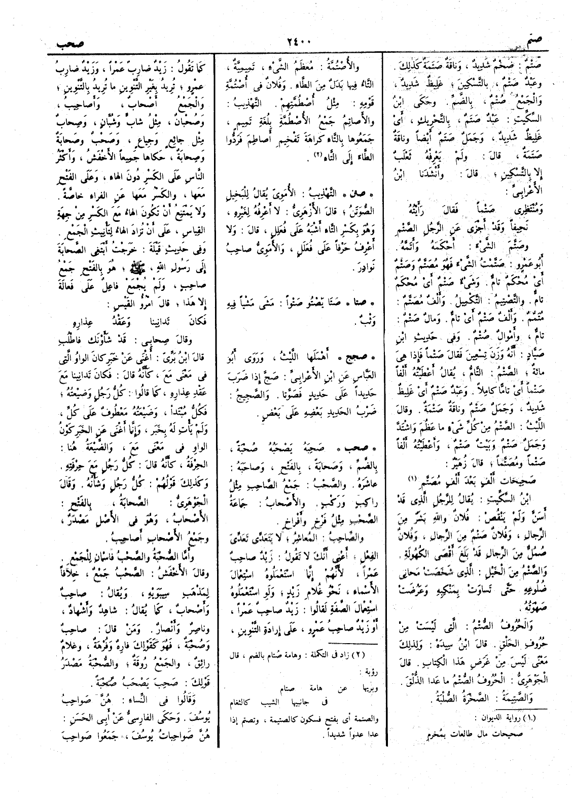 ( صجج ) أَهملها الليث وروى أَبو العباس عن ابن الأَعرابي صَجَّ إِذا ضرب حديداً على حديد فصوَّتا والصَّجِيجُ ضَرْب الحديد بعضه على بعض ( صحب ) صَحِبَه يَصْحَبُه صُحْبة بالضم وصَحابة بالفتح وصاحبه عاشره والصَّحْب جمع الصاحب مثل راكب وركب والأَصْحاب جماعة الصَّحْب مثل فَرْخ وأَفْراخ والصاحب المُعاشر لا يتعدَّى تَعَدِّيَ الفعل أَعني أَنك لا تقول زيد صاحِبٌ عَمْراً لأَنهم إِنما استعملوه استعمال الأَسماء نحو غلام زيد ولو استعملوه استعمال الصفة لقالوا زيد صاحِبٌ عمراً أَو زيد صاحبُ عَمْرو على إِرادة التنوين كما تقول زيد ضاربٌ عمراً وزيد ضاربُ عمْرٍو تريد بغير التنوين ما تريد بالتنوين والجمع أَصحاب وأَصاحيبُ وصُحْبان مثل شابّ وشُبّان وصِحاب مثل جائع وجِياع وصَحْب وصَحابة وصِحابة حكاها جميعاً الأَخفش وأَكثر الناس على الكسر دون الهاءِ وعلى الفتح معها والكسر معها عن الفراء خاصة ولا يمتنع أَن تكون الهاء مع الكسر من جهة القياس على أَن تزاد الهاء لتأْنيث الجمع وفي حديث قيلة خرجت أَبتغي الصَّحابة إِلى رسول اللّه صلى اللّه عليه وسلم هو بالفتح جمع صاحب ولم يجمع فاعِل على فَعالة إِلا هذا قال امرؤُ القيس