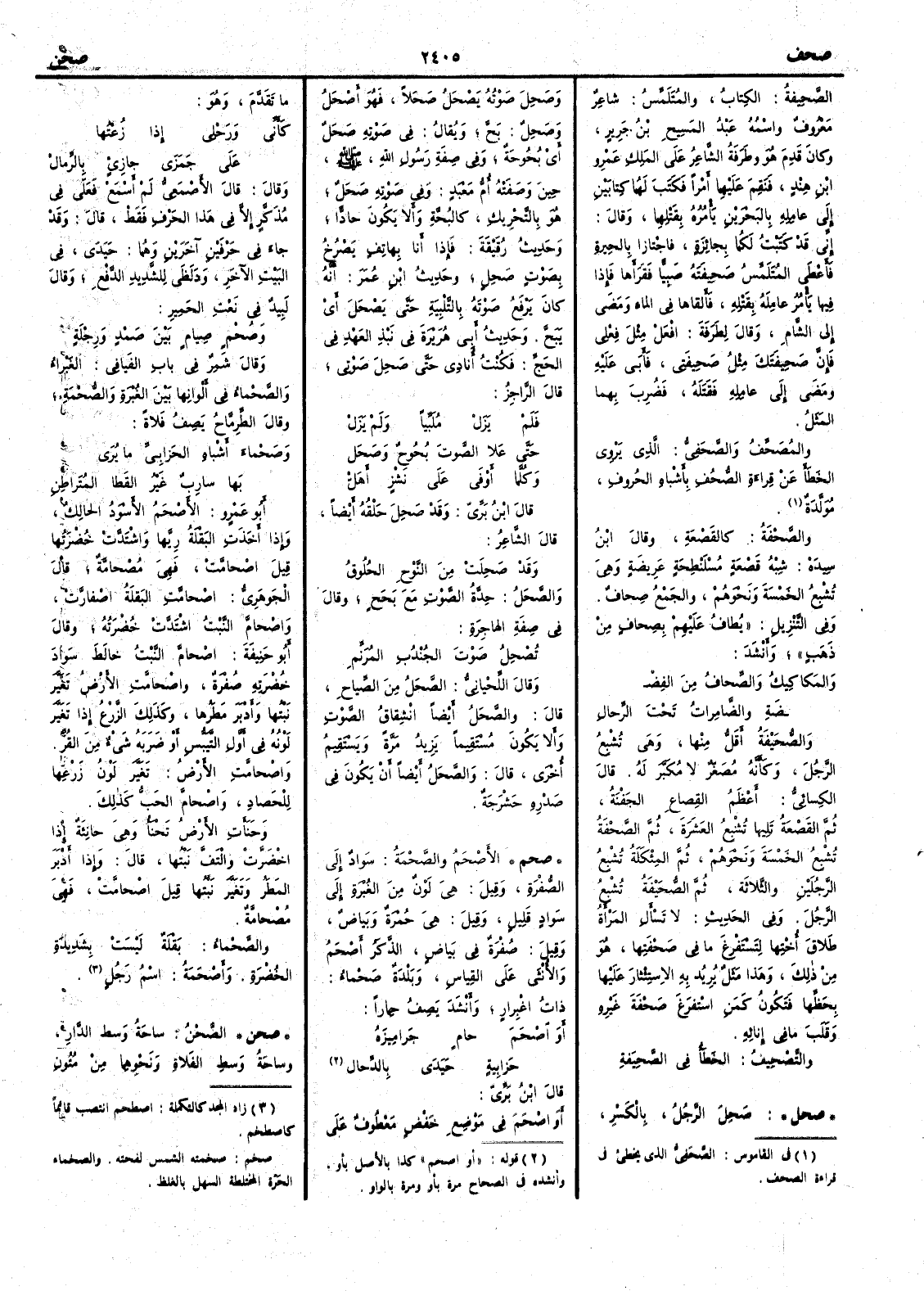 قال ابن بري أو اصْحَم في موضع خفض معطوف على ما تقدم وهو كأَني ورَحْلي إذا زُعْتُها على جَمَزى جازِئٍ بالرِّمالْ وقال قال الأَصمعي لم أَسمع فَعَلى في مذكر إلاَّ في هذا الحرف فقط قال وقد جاء في حرفين آخرين وهما حَيَدى في البيت الآخر ودَلَظى للشديد الدَّفْع وقال لبيد في نعت الحمير وصُحْمٍ صِيامٍ بين صَمْدٍ ورِجْلَةٍ وقال شمر في باب الفَيافي الغَبْراءُ والصَّحْماءُ في ألوانها بين الغُبْرةِ والصُّحْمة وقال الطرمّاح يصف فَلاةً وصَحْماءَ أَشْباهِ الحَزابيِّ ما يُرى بها سارِبٌ غيرُ القَطا المُتَراطِنِ أبو عمرو الأَصْحَمُ الأَسْوَدُ الحالِكُ وإذا أَخَذَتِ البَقْلَةُ رِيَّها واشْتَدَّتْ خُضْرَتُها قيل اصْحامّتْ فهي مُصْحامَّة قال الجوهري اصْحامَّتِ البَقلَةُ اصْفارَّتْ واصْحامَّ النَّبتُ اشتدّت خُضْرته وقال أبو حنيفة اصْحامَّ النبتُ خالَطَ سَوادَ خُضْرته صُفْرَةٌ واصْحامَّتِ الأرض تغير نبتها وأَدْبَرَ مَطرُها وكذلك الزرع إذا تغير لونه في أَوَّل التَّيَبُّسِ أو ضَرَبه شيءٌ من القُرِّ واصْحامَّت الأَرضُ تغير لون زرعها للحصاد واصْحامَّ الحَبُّ كذلك وحَنَأَتِ الأَرضُ تَحْنَأُ وهي حانِئَةٌ إذا اخْضَرَّتْ والْتَفَّ نَبْتُها قال وإذا أَدبر المطر وتغير نبتها قيل اصْحامَّت فهي مُصْحامَّة والصَّحْماءُ بقلة ليست بشديدة الخضرة وأَصْحَمَةُ اسم رجل