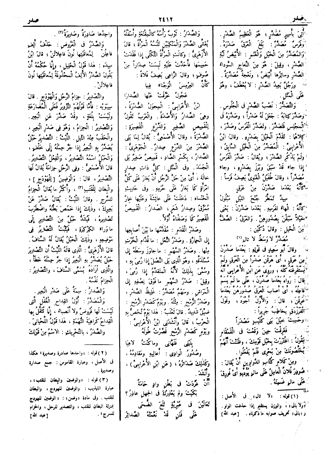 أُتِيَ بأَسِير مُصَدَّر هو العظيم الصَّدْر وفَرس مُصَدَّرٌ بَلَغ العَرَق صَدْرَه والمُصَدَّرُ من الخيل والغنم الأَبيض لَبَّةِ الصَّدْرِ وقيل هو من النِّعاج السَّوداء الصدر وسائرُها أَبيضُ ونعجة مُصَدَّرَة ورجل بعيد الصَّدْر لا يُعطَف وهو على المثَل والتَّصَدُّر نصْب الصَّدْر في الجُلوس وصَدَّر كتابه جعل له صَدْراً وصَدَّره في المجلس فتصدَّر وتصدَّر الفرسُ وصَدَّر كلاهما تقدَّم الخيلَ بِصَدره وقال ابن الأَعرابي المُصَدَّرُ من الخيل السابق ولم يذكر الصَّدْرَ ويقال صَدَّرَ الفرسُ إِذا جاء قد سبق وبرز بِصَدْرِه وجاء مُصَدَّراً وقال طفيل الغَنَوِيّ يصف فرساً كأَنه بَعْدَما صَدَّرْنَ مِنْ عَرَقٍ سِيدٌ تَمَطَّرَ جُنْحَ الليل مَبْلُولُ كأَنه الهاءُ لَفَرسِهِ بعدما صَدَّرْنَ يعني خَيْلاَ سَبَقْنَ بصُدُورِهِنَّ والعَرَق الصفُّ من الخيل وقال دكين مُصَدَّرٌ لا وَسَطٌ ولا بَالي
