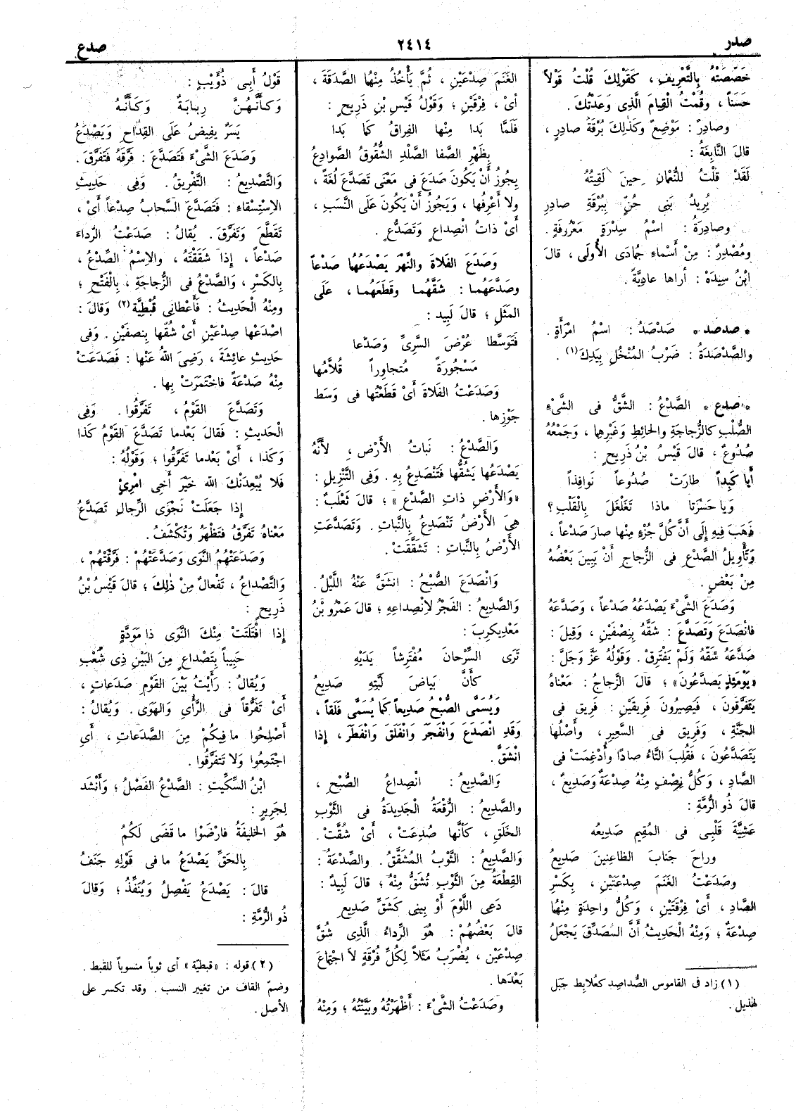 ( صدع ) الصَّدْعُ الشَّقُّ في الشيءِ الصُّلْبِ كالزُّجاجةِ والحائِطِ وغيرهما وجمعه صُدُوعٌ قال قيس ابن ذريح أَيا كَبِداً طارتْ صُدُوعاً نَوافِذاً ويا حَسْرَتا ماذا تَغَلْغَلَ بِالْقَلْبِ ؟ ذهب فيه أَي أَن كل جزء منها صار صَدْعاً وتَأْوِيل الصَّدْعِ في الزجاج أَن يَبِينَ بعضُه من بعض وصَدَعَ الشيءَ يَصْدَعُه صَدْعاً وصَدَّعَه فانْصَدَعَ وتَصَدَّعَ شَقّه بنصفين وقيل صَدّعه شقّه ولم يفترق وقوله عز وجل يومئذ يَصَّدَّعُون قال الزجاج معناه يَتَفَرَّقُون فيصيرون فَرِيقَيْنِ فريق في الجنة وفريق في السعير وأَصلها يَتَصَدَّعُون فقلب التاء صاداً وأُدغمت في الصاد وكل نصف منه صِدْعةٌ وصَدِيعٌ قال ذو الرمة عَشِيّةَ قَلْبِي في المُقِيم صَدِيعُه وراحَ جَنابَ الظاعِنينَ صَدِيعُ وصَدَعْتُ الغنم صِدْعَتَيْن بكسر الصاد أَي فِرْقَتَيْن وكل واحدة منهما صِدْعة ومنه الحديث أَنَّ المُصَدِّقَ يجعل الغنم صدْعَيْنِ ثم يأْخذ منهما الصَّدَقةَ أَي فِرْقَيْنِ وقول قيس بن ذريح فلَمّا بَدا منها الفِراقُ كما بَدا بِظَهْرِ الصَّفا الصَّلْدِ الشُّقُوقُ الصَّوادِعُ يجوز أَن يكون صَدَعَ في معنى تَصَدع لغة ولا أَعرفها ويجوز أَن يكون على النسب أَي ذاتُ انْصِداعٍ وتَصَدُّعٍ وصَدَع الفَلاةَ والنهرَ يَصْدَعُهما صَدْعاً وصَدَّعَهما شَقَّهما وقَطَعَهما على المثل قال لبيد فَتَوَسَّطا عُرْضَ السَّرِيِّ وصَدَّعا مَسْجُورةً مُتَجاوِراً قُلاَّمُها وصَدَعْتُ الفَلاةَ أَي قَطَعْتُها في وسَط جَوْزها والصَّدْعُ نباتُ الأَرض لأَنه يَصْدَعُها يَشُقُّها فَتَنْصَدِعُ به وفي التنزيل والأَرضِ ذاتِ الصَّدْعِ قال ثعلب هي الأَرضُ تَنْصَدِعُ بالنبات وتَصَدَّعَتِ الأَرضُ بالنبات تشَقَّقَت وانْصَدَعَ الصبحُ انشَقَّ عنه الليلُ والصَّدِيعُ الفجرُ لانصِداعِه قال عمرو بن معديكرب تَرَى السِّرْحانَ مُفْتَرِشاً يَدَيْهِ كأَنَّ بَياضَ لَبَّتِه صَدِيعُ ويسمى الصبح صَدِيعاً كما يسمى فَلَقاً وقد انْصَدَعَ وانْفَجَرَ وانْفَلَقَ وانْفَطَرَ إِذا انْشَقَّ والصَّدِيعُ انصِداعُ الصُّبْح والصَّدِيعُ الرُّقْعةُ الجديدة في الثوب الخَلَق كأَنها صُدِعَتْ أَي شُقَّتْ والصَّدِيعُ الثوب المُشَقَّقُ والصِّدْعةُ القِطْعةُ من الثوب تُشَقُّ منه قال لبيد دَعِي اللَّوْمَ أَوْ بِينِي كشقِّ صَدِيعِ قال بعضهم هو الرِّداءُ الذي شُقَّ صِدْعَيْن يُضْرب مثلاً لكل فُرْقةٍ لا اجتِماعَ بعدها وصَدَعْتُ الشيءَ أَظهَرْتُه وبَيَّنْتُه ومنه قول أَبي ذؤيب وكأَنَّهُنَّ رِبابةٌ وكأَنَّه يَسَرٌ يُفِيضُ على القِداحِ ويَصْدَعُ وصَدَعَ الشيءَ فَتَصَدَّعَ فزّقه فتفرَّقَ والتصديعُ التفريقُ وفي حديث الاستسقاء فتَصَدَّعَ السَّحابُ صِدْعاً أَي تقطَّعَ وتفرَّقَ يقال صَدَعْتُ الرّداء صَدْعاً إِذا شَقَقْتَه والاسم الصِّدْعُ بالكسر والصَّدْع في الزجاجة بالفتح ومنه الحديث فأَعطانِي قُبْطِيّةً وقال اصْدَعْها صَدْعَيْنِ أَي شُقَّها بنصفين وفي حديث عائشة رضي الله عنها فَصَدَعَتْ منه صَدْعةً فاخْتَمَرَتْ بها وتصَدَّعَ القوم تفرَّقُوا وفي الحديث فقال بعدما تَصَدّعَ كذا وكذا أَي بعدما تفرّقوا وقوله فلا يُبْعِدَنْكَ اللهُ خَيْرَ أَخِي امْرئٍ إِذا جَعَلَتْ نَجْوى الرِّجالِ تَصَدَّعُ معناه تَفَرَّقُ فتَظْهَرُ وتُكْشَفُ وصَدَعَتْهم النَّوَى وصَدَّعَتْهم فرَّقَتْهم والتَّصْداعُ تَفْعالٌ من ذلك قال قيس بن ذريح إِذا افْتَلَتَتْ مِنْكَ النَّوَى ذا مَوَدّةٍ حَبِيباً بِتَصْداعٍ مِنَ البَيْنِ ذِي شَعبِ ويقال رأَيتُ بين القوم صَدَعاتٍ أَي تفرُّقاً في الرأْي والهَوَى ويقال أَصْلِحوا ما فيكم من الصَّدَعاتِ أَي اجْتَمِعوا ولا تتفَرَّقُوا ابن السكيت الصَّدْعُ الفَصْلُ وأَنشد لجرير هو الخَلِيفةُ فارْضَوْا ما قَضَى لكُمُ بالحَقِّ يَصْدَعُ ما في قوله جَنَفُ قال يَصْدع يفْصِلُ ويُنَفِّذُ وقال ذو الرمة