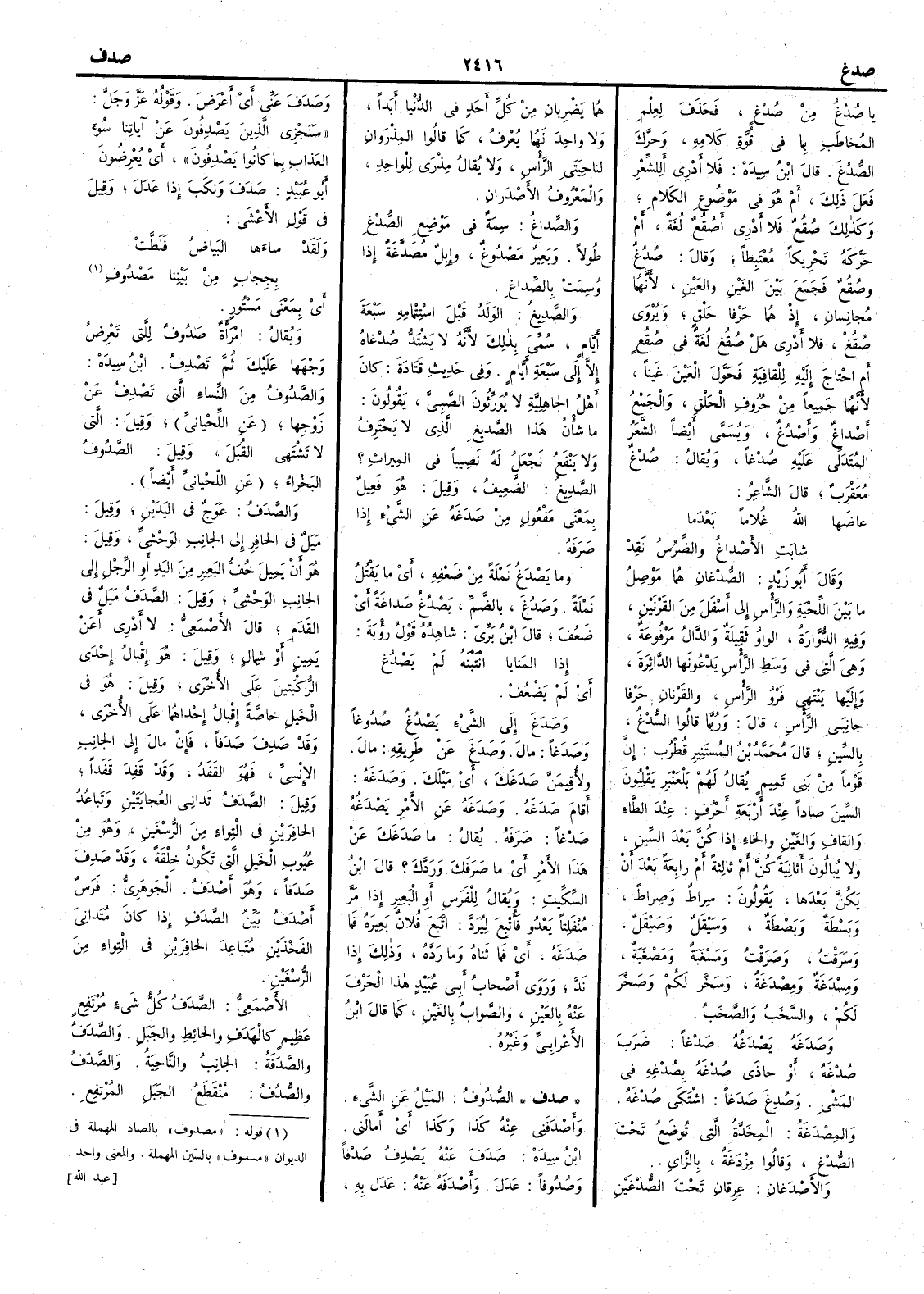 ( صدف ) الصُّدُوفُ المَيْلُ عن الشيء وأَصْدَفَني عنه كذا وكذا أَي أَمالَني ابن سيده صَدَفَ عنه يَصْدِفُ صَدْفاً وصُدُوفاً عَدَلَ وأَصْدَفَه عنه عَدَل به وصَدَفَ عني أَي أَعْرَضَ وقوله عز وجل سَنَجْزِي الذين يَصْدِفون عن آياتنا سُوء العذاب بما كانوا يَصْدِفُونَ أَي يُعْرِضون أَبو عبيد صَدَفَ ونكَبَ إذا عَدلَ وقيل في قول الأَعشى ولقد ساءها البياض فَلَطَّتْ بِحِجابٍ من بَيْنِنا مَصْدُوفِ أَي بمعنى مَسْتُور ويقال امرأَة صَدُوفٌ للتي تَعْرِضُ وجهها عليك ثم تَصْدِفُ ابن سيده والصَّدُوفُ من النساء التي تَصْدِفُ عن زَوجها عن اللحياني وقيل التي لا تشتهي القبل وقيل الصَّدُوفُ البَخْراء عن اللحياني أَيضاً والصَّدَفُ عَوَجٌ في اليدين وقيل مَيَلٌ في الحافر إلى الجانب الوحْشِيِّ وقيل هو أَن يَمِيل خُفُّ البعير من اليد أَو الرجل إلى الجانب الوحشي وقيل الصَّدَفُ مَيل في القدم قال الأَصمعي لا أَدري أَعن يمين أَو شمال وقيل هو إقْبالُ إحدى الرُّكْبَتين على الأُخرى وقيل هو في الخيل خاصّة إقْبالُ إحداهما على الأُخرى وقد صَدِفَ صَدَفاً فإن مالَ إلى الجانب الإنسيّ فهو القَفَدُ وقد قَفِدَ قَفَداً وقيل الصَّدَفُ تَداني العُجايَتَين وتباعُدُ الحافرين في التِواءٍ من الرُّسْغَينِ وهو من عيوب الخيل التي تكون خِلْقةً وقد صَدِفَ صَدَفاً وهو أَصْدَفُ الجوهري فرس أَصْدَفُ بَيِّنُ الصَّدَفِ إذا كان مُتَدانيَ الفَخْذين مُتَباعِد الحافرين في التواء من الرسغين الأَصمعي الصدفُ كل شيء مرتفع عظيم كالهدَف والحائط والجبل والصدَفُ والصدَفَةُ الجانِبُ والناحِيةُ والصَّدَفُ والصُّدُفُ مُنْقَطَعُ الجبل المرتفِع