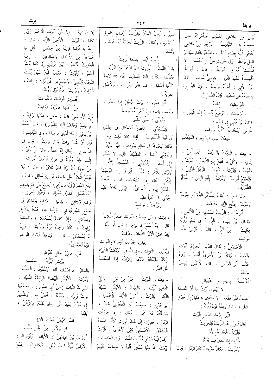 ( برث ) البَرْثُ جبلٌ من رَمْلٍ سهل التراب لَيِّنه والبَرْثُ الأَرض السَّهْلة اللَّيِّنة والبَرْثُ أَسهلُ الأَرض وأَحسَنُها أَبو عمرو سمعت ابنَ الفَقْعَسِيِّ يقول وسأَلته عن نَجْد فقال إِذا جاوزتَ الرمل فصِرْتَ إِلى تلك البِراثِ كأَنها السَّنامُ المُشَقَّقُ الأَصمعي وابن الأَعرابي البَرْثُ أَرضٌ لينة مستوية تُنْبِتُ الشَّعَر وفي الحديث يَبْعَثُ الله منها سبعين أَلفاً لا حسابَ عليهم ولا عذابَ فيما بَيْنَ البَرْثِ الأَحْمَر وبين كذا البَرْثُ الأَرضُ اللَّيِّنة قال يريد به أَرضاً قريبةً من حِمْصٍ قُتِلَ بها جماعةٌ من الشهداء والصالحين ومنه الحديث الآخر بين الزَّيْتُونِ إِلى كذا بَرْثٌ أَحْمَرُ والبَرْثُ مكانٌ ليِّنٌ سهْلٌ يُنْبِتُ النَّجْمة والنَّصِيَّ والجمعُ من كل ذلك بِراثٌ وأَبْراثٌ وبُروثٌ فأَما قول رؤْبة أَقْفَرَتِ الوَعْساءُ فالعُثاعِثُ من أَهْلِها فالبُرَقُ البَرارِثُ فإِن الأَصمعي قال جعل واحدتها بَرْثِيةً ثم جَمَع وحذف الياء للضرورة قال أَحمد بن يحيى فلا أَدري ما هذا وفي التهذيب أَراد أَن يقول بِراث فقال بَرارِثُ وقال في الصحاح يقال إِنه خطأٌ قال ابن بري إِنما غَلِطَ رؤْبة في قوله فالبُرَقُ البَرارِثُ من جهة أَن بَرْثاً اسم ثلاثي قال ولا يجمع الثلاثيّ على ما جاء على زنة فَعالل قال ومن انتصر لرؤبة قال يجيءُ الجمع على غير واحده المستعمل كضَرَّة وضَرائر وحُرَّة وحَرائر وكَنَّة وكَنائِن وقالوا مَشابِهَ ومَذاكِر في جمع شِبْه وَذكر وإِنما جاء جمعاً لمُشْبِه ومِذْكار وإِن كانا لم يُستعملا وكذلك بَرارِثُ كأَنَّ واحدَه بُرَّثةٌ وبَرِّيثةٌ وإِن لم يُستعمل قال وشاهدُ البَرْثِ للواحد قولُ الجَعْديّ على جانِبَيْ حائِرٍ مُفْرَطٍ يبَرْثٍ تَبَوَّأْنه مُعْشِبِ والحائرٌ ما أَمْسَك الماءَ والمُفْرَطُ المَمْلُوء والبَرْثُ الأَرض البيضاء الرقيقة السَّهْلة السريعة النبات عن أَبي عمرو وجمعُها بِراثٌ وبِرَثَة وتَبَوَّأْنَه أَقَمْنَ به ويالضمير في تَبَوَّأْنَ يعود على نساء تقدم ذكرهن وقبله فلمَّا تَخَيَّمْنَ تَحْتَ الأَرا كِ والأَثْلِ من بَلَدٍ طَيِّبِ أَي ضَرَبْنَ خِيامَهُنَّ في الأَراك والوَعْساءُ الأَرض اللينة ذاتُ الرمل والعَثاعِثُ جمعُ