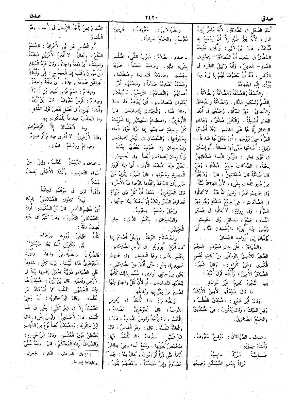 أَخذ الفحل في الصدقة لأَنه مُضِرٌّ برَبِّ المال لأَنه يَعِزُّ عليه إِلاَّ أَن يسمح به فيؤْخذ قال ابن الأَثير والذي شرحه الخطابي في المعالم أَن المُصَدِّق بتخفيف الصاد العاملُ وأَنه وكيل الفقراء في القبض فله أَن يتصرف بهم بما يراه مما يؤَدِّي إِليه اجتهاده والصَّدَقةُ والصَّدُقةُ والصُّدُقةُ والصُّدْقةُ بالضم وتسكين الدال والصَّدْقةُ والصَّداقُ والصِّداقُ مهر المرأَة وجمعها في أَدنى العدد أَصْدِقةٌ والكثير صُدُقٌ وهذان البناءَ ان إِنما هما على الغالب وقد أَصْدَق المرأَةَ حين تزوَّجها أَي جعل لها صَداقاً وقيل أَصْدَقَها سمَّى لها صَداقاً أَبو إِسحق في قوله تعالى وآتوا النساءَ صَدُقاتِهنَّ نِحْلةً الصَّدُقات جمع الصَّدُقةِ ومن قال صُدْقة قال صُدْقاتِهنَّ قال ولا يقرأُ من هذه اللغات بشيء إِن القراءَة سنَّة وفي حديث عمر رضي الله عنه لا تُغالُوا في الصَّدُقاتِ هي جمع صَدُقة وهو مهر المرأَة وفي رواية لا تُغالُوا في صُدُق النساء جمع صَداقٍ وفي الحديث وليس عند أَبَوَيْنا ما يُصْدِقانِ عَنَّا أَي يُؤدِّيانِ إِلى أَزواجنا الصَّداقَ والصَّيْدَقُ على مثال صَيْرف النجمُ الصغير اللاصق بالوُسْطَى من نبات نعش الكبرى عن كراع وقال شمر الصَّيْدقُ الأَمِينُ وأَنشد قول أُمية فيها النجومُ تُطِيعُ غير مُراحةٍ ما قال صَيْدَقُها الأَمِينُ الأَرْشَدُ وقال أَبو عمرو الصَّيْدَقُ القطب وقيل المَلِك وقال يعقوب هي الصُّنْدوق والجمع الصَّنادِيق ( صدل ) الصِّيْدَلانُ موضع معروف وأَنشد سيبويه ضَبابِيَّةً مُرِّيَّةً حابسِيَّةً مُنِيفاً بنَعْفِ الصَّيْدَلَيْن وَضيعُها والصَّيْدَلانِيُّ معروف فارسي مُعَرَّب والجمع صَيادِلة ( صدم ) الصَّدْمُ ضَرْبُ الشيء الصُّلْب بشيء مثله وصَدَمَه صَدْماً ضَرَبه بجسده وصادَمَهُ فتَصادَماً واصطَدَما وصَدَمَه يَصدِمُه صَدْماً وصَدَمَهُم أَمْرٌ أصابهم والتَّصادُمُ التَّزاحُمُ والرَّجُلانِ يَعْدُوانِ فيَتَصادَمانِ أي يَصْدِمُ هذا ذاك وذاك هذا والجَيْشانِ يَتَصادَمان قال الأزهري واصطِدامُ السفينتين إذا ضربتْ كلُّ واحدة صاحِبَتَها إذا مَرَّتا فوق الماء بحَمْوَتِهما والسفينتان في البحر تتَصادَمانِ وتَصْطَدِمان إذا ضرب بعضُهما بعضاً والفارسان يَتَصادمان أَيضاً وفي الحديث الصَّبْرُ عند الصَّدْمةِ الأُولى أي عند فَوْرة المصِيبة وحَمْوَتِها قال شمر يقول من صَبَرَ تلك الساعة وتَلَقَّاها بالرِّضا فله الأَجر قال الجوهري معناه أن كل ذي مَرْزِئةٍ قُصاراه الصبرُ ولكنه إنما يُحْمَدُ عند حِدَّتِها ورجل مِصْدَمٌ مِحْرَبٌ والصَّدِمَتان بكسر الدال جانبا الجَبِينَينِ والصَّدمَةُ النَّزَعةُ ورجل أَصْدَمُ إذا كان أَنْزَع أبو زيد في الرأْس الصَّدِمَتان بكسر الدال وهما الجبينان وفي حديث مسيره إلى بَدْرٍ حتى أَفْتَقَ من الصَّدِمَتَيْنِ يعني من جانبي الوادي سمِّيتا بذلك كأَنهما لتقابلهما تَتَصادَمانِ أو لأَنَّ كل واحدة منهما تَصْدِمُ من يَمُرُّ بها ويُقابلها والصُّدامُ داء يأْخذ في رؤوس الدواب قال الجوهري الصِّدامُ بالكسر داء يأْخذ رؤوسَ الدواب قال والعامَّة تضمه قال وهو القياس قال ابن شميل الصُّدامُ داء يأْخذ الإبل فتَخْمَصُ بُطُونُها وتَدَعُ الماء وهي عِطاشٌ أياماً حتى تَبْرأَ أو تموت يقال منه جمل مَصْدُوم وإبل مُصَدَّمَةٌ وبعضهم يقول الصُّدامُ ثِقَلٌ يأخذ الإنسان في رأْسه وهو الخُشامُ أبو العباس عن ابن الأعرابي الصَّدْمُ الدَّفْعُ ويقال لا أَفْعَلُ الأمرين صَدْمَةً واحدة أي دَفْعَةً واحدة وقال عبدُ المَلِكِ بنُ مَرْوانَ وكتب إلى الحجاج إني وَلَّيْتُكَ العراقين صَدْمةً واحدة أي دَفْعَةَ واحدةً وصِدامٌ اسْمُ فرس لَقِيط بن زُرارَةَ وصِدامٌ فرس معروف قال ابن بري وأَنشد الهَرَويُّ في فصل نَقَصَ قول الشاعر وما اتَّخَدْتُ صِداماً للمُكوثِ بها وما انْتَقَشْناكَ إلاَّ للوَصَرَّاتِ وقال الأزهري لا أَدري صِدامٌ أو صَرامٌ وصِد