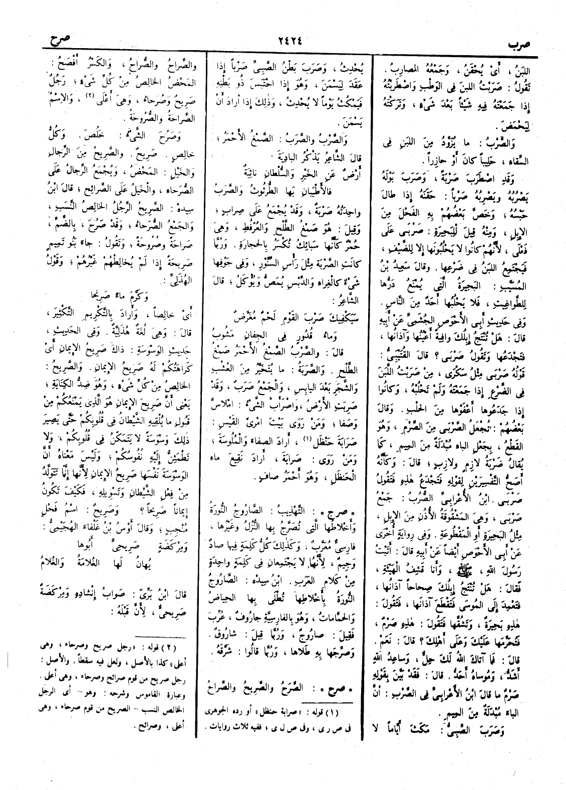 ( صرح ) الصَّرَحُ والصَّرِيحُ والصَّراحُ والصِّراح والصُّراحُ والكسر أَفصح المَحْضُ الخالصُ من كل شيء رجل صَرِيحٌ وصُرَحاء وهي أَعلى