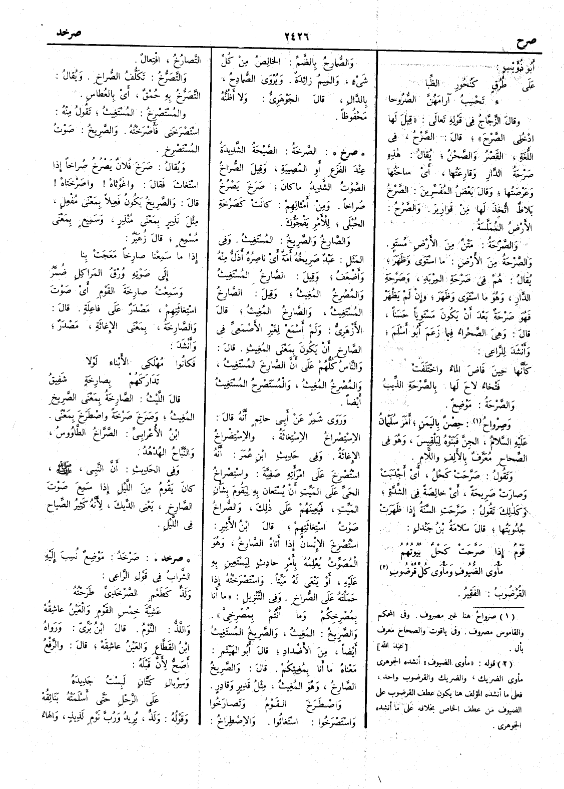 ( صرخد ) صَرْخَدُ موضع نسب إِليه الشراب في قول الراعي ولَذٍّ كَطَعْمِ الصَّرْخَديِّ طَرَحْتُه عَشِيَّةَ خِمْسِ القومِ والعينُ عاشِقُه واللَّذُّ النومُ قال ابن بري ورواه ابن القطاع والعين عاشقَه قال والرفع أَصح لأَن قبله وسِرْبالِ كَتَّانٍ لَبِسْتُ جَدِيدَه على الرَّحْلِ حتى أَسْلَمَتْه بَنَائِقُهْ وقوله ولَذٍّ يريد وَرُبَّ نوم لذيذ والهاء