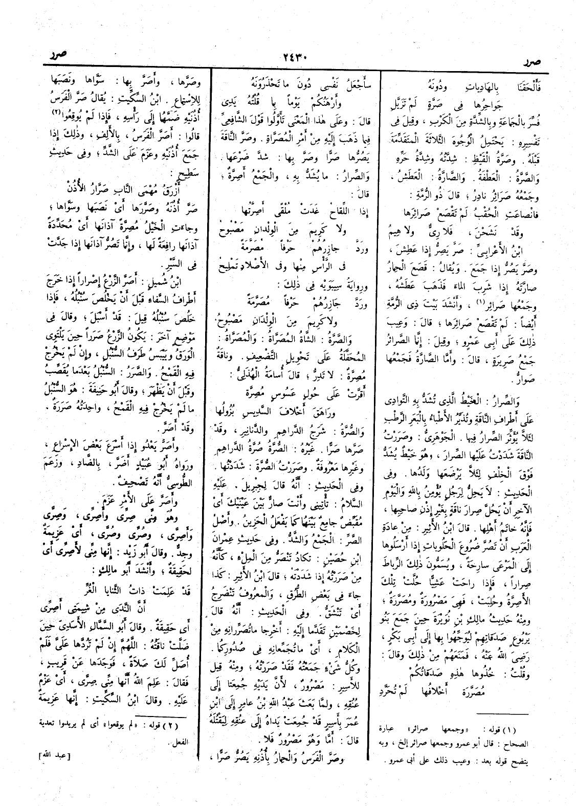 ( * قوله « وجمعها صرائر » عبارة الصحاح قال أَبو عمرو وجمعها صرائر إلخ وبه يتضح قوله بعد وعيب ذلك على أَبي عمرو ) وأَنشد بيت ذي الرمة أَيضاً « لم تَقْصَعْ صَرائِرَها » قال وعِيب ذلك على أَبي عمرو وقيل إِنما الصَّرائرُ جمع صَرِيرة قال وأَما الصَّارَّةُ فجمعها صَوارّ والصِّرار الخيط الذي تُشَدُّ به التَّوادِي على أَطراف الناقة وتُذَيَّرُ الأَطباءُ بالبَعَر الرَّطْب لئلاَّ يُؤَثِّرَ الصِّرارُ فيها الجوهري وصَرَرْتُ الناقة شددت عليها الصِّرار وهو خيط يُشَدُّ فوق الخِلْف لِئلاَّ يرضعَها ولدها وفي الحديث لا يَحِلُّ لرجل يُؤمن بالله واليوم الآخر أَن يَحُلَّ صِرَارَ ناقةٍ بغير إِذْنِ صاحبها فإِنه خاتَمُ أَهْلِها قال ابن الأَثير من عادة العرب أَن تَصُرَّ ضُرُوعَ الحَلُوبات إِذا أَرسلوها إِلى المَرْعَى سارِحَة ويسمُّون ذلك الرِّباطَ صِراراً فإِذا راحَتْ عَشِيّاً حُلَّت تلك الأَصِرَّة وحُلِبَتْ فهي مَصْرُورة ومُصَرَّرة ومنه حديث مالك بن نُوَيْرَةَ حين جَمَعَ بَنُو يَرْبُوَع صَدَقاتهم ليُوَجِّهوا بها إِلى أَبي بكر رضي الله عنه فمنعَهم من ذلك وقال وقُلْتُ خُذُوها هذِه صَدَقاتكُمْ مُصَرَّرَة أَخلافها لم تُحَرَّدِ سأَجْعَلُ نفسي دُونَ ما تَحْذَرُونه وأَرْهَنُكُمْ يَوْماً بما قُلْتُهُ يَدِي قال وعلى هذا المعنى تأَوَّلُوا قولَ الشافعي فيما ذَهب إِليه من أَمْرِ المُصَرَّاة وصَرَّ الناقة يَصُرُّها صَرّاً وصَرَّ بها شدَّ ضَرْعَها والصِّرارُ ما يُشدُّ به والجمع أَصِرَّة قال إِذا اللَّقاح غَدَتْ مُلْقًى أَصِرَّتُها ولا كَريمَ من الوِلْدانِ مَصْبُوحُ ورَدَّ جازِرُهُمْ حَرْفاً مُصَرَّمَةً في الرأْس منها وفي الأَصْلاد تَمْلِيحُ ورواية سيبويه في ذلك ورَدْ جازِرُهُمْ حَرْفاً مُصَرَّمة ولا كريمَ من الوِلْدَان مَصْبُوح والصَّرَّةُ الشاة المُضَرَّاة والمُصَرَّاة المُحَفَّلَة على تحويل التضعيف وناقةٌ مُصِرَّةٌ لا تَدِرُّ قال أُسامة الهذلي أَقرَّتْ على حُولٍ عَسُوس مُصِرَّة ورَاهَقَ أَخْلافَ السَّدِيسِ بُزُِولُها والصُّرَّة شَرَجْ الدَّراهم والدنانير وقد صَرَّها صَرّاً غيره الصُّرَّة صُرَّة الدراهم وغيرها معروفة وصَرَرْت الصُّرَّة شددتها وفي الحديث أَنه قال لجبريل عليه السلام تأْتِيني وأَنت صارٌّ بين عَيْنَيْك أَي مُقَبِّض جامعٌ بينهما كما يفعل الحَزِين وأَصل الصَّرِّ الجمع والشدُّ وفي حديث عمران بن حصين تَكاد تَنْصَرُّ من المِلْءِ كأَنه من صَرَرْته إِذا شَدَدْته قال ابن الأَثير كذا جاء في بعض الطرق والمعروف تنضرج أَي تنشقُّ وفي الحديث أَنه قال لِخَصْمَيْنِ تقدَّما إِليه أَخرِجا ما تُصَرّرانه من الكلام أَي ما تُجَمِّعانِه في صُدُوركما وكلُّ شيء جمعته فقد صَرَرْته ومنه قيل للأَسير مَصْرُور لأَن يَدَيْه جُمِعتَا إِلى عُنقه ولمَّا بعث عبدالله بن عامر إِلى ابن عمر بأَسيرِ قد جُمعت يداه إِلى عُنقه لِيَقْتُلَه قال أَمَّا وهو مَصْرُورٌ فَلا وصَرَّ الفرسُ والحمار بأُذُنِه يَصُرُّ صَرّاً وصَرَّها وأَصَرَّ بها سَوَّاها ونَصَبها لِلاستماع ابن السكيت يقال صَرَّ الفرس أُذنيه ضَمَّها إِلى رأْسه فإِذا لم يُوقِعوا قالوا أَصَرَّ الفرس بالأَلف وذلك إِذا جمع أُذنيه وعزم على الشَّدِّ وفي حديث سَطِيح أَزْرَقُ مُهْمَى النَّابِ صَرَّارُ الأُذُنْ صَرَّ أُذُنه وصَرَّرها أَي نَصَبها وسوَّاها وجاءت الخيلُ مُصِرَّة آذانها إِذا جَدَّت في السير ابن شميل أَصَرَّ الزرعُ إِصراراً إِذا خَرَج أَطراف السَّفاءِ قبل أَن يخلُص سنبله فإِذا خَلُص سُنْبُلُه قيل قد أَسْبَل وقال قي موضع آخر يكون الزرع صَرَراً حين يَلْتَوي الورَق ويَيْبَس طرَف السُّنْبُل وإِن لم يخرُج فيه القَمْح والصَّرَر السُّنْبُل بعدما يُقَصِّب وقبل أَن يظهر وقال أَبو حنيفة هو السُّنْبُل ما لم يخرج فيه القمح واحدته صَرَرَة وقد أَصَرَّ وأَصَرَّ يعْدُو إِذا أَسرع بعض الإِسراع ورواه أَبو عبيد أَضَرَ