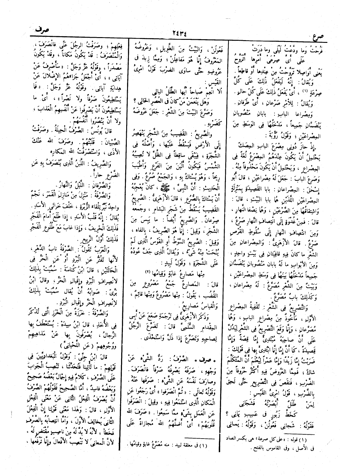 ( صرف ) الصَّرْفُ رَدُّ الشيء عن وجهه صَرَفَه يَصْرِفُه صَرْفاً فانْصَرَفَ وصارَفَ نفْسَه عن الشيء صَرفَها عنه وقوله تعالى ثم انْصَرَفوا أَي رَجَعوا عن المكان الذي استمعُوا فيه وقيل انْصَرَفُوا عن العمل بشيء مما سمعوا صَرَفَ اللّه قلوبَهم أَي أَضلَّهُم اللّه مُجازاةً على فعلهم وصَرفْتُ الرجل عني فانْصَرَفَ والمُنْصَرَفُ قد يكون مكاناً وقد يكون مصدراً وقوله عز وجل سأَصرفُ عن آياتي أَي أَجْعَلُ جَزاءهم الإضْلالَ عن هداية آياتي وقوله عز وجل فما يَسْتَطِيعُون صَرْفاً ولا نَصْراً أَي ما يستطيعون أَن يَصْرِفُوا عن أَنفسهم العَذابَ ولا أَن يَنْصُروا أَنفسَهم قال يونس الصَّرْفُ الحِيلةُ وصَرَفْتُ الصِّبْيان قَلَبْتُهم وصَرَفَ اللّه عنك الأَذى واسْتَصْرَفْتُ اللّه المَكارِهَ والصَّريفُ اللَّبَنُ الذي يُنْصَرَفُ به عن الضَّرْعِ حارّاً والصَّرْفانِ الليلُ والنهارُ والصَّرْفةُ مَنْزِل من مَنازِلِ القمر نجم واحد نَيِّرٌ تِلْقاء الزُّبْرةِ خلْفَ خراتَي الأَسَد يقال إنه قلب الأَسد إذا طلع أَمام الفجر فذلك الخَريفُ وإِذا غابَ مع طُلُوع الفجر فذلك أَول الربيع والعرب تقول الصَّرْفةُ نابُ الدَّهْرِ لأَنها تفْتَرُّ عن البرد أَو عن الحَرّ في الحالتين قال ابن كُناسةَ سميت بذلك لانْصراف البرد وإقبال الحرّ وقال ابن بري صوابه أَن يقال سميت بذلك لانْصراف الحرِّ وإقبال البرد والصَّرْفةُ خرَزةٌ من الخرَز التي تُذْكر في الأُخَذِ قال ابن سيده يُسْتَعْطَفُ بها الرجال يُصْرَفون بها عن مَذاهِبهم ووجوههم عن اللحياني قال ابن جني وقولُ البغداديين في قولهم ما تَأْتينا فتُحَدِّثَنا تَنْصِبُ الجوابَ على الصَّرْف كلام فيه إجمال بعضه صحيح وبعضه فاسد أَما الصحيح فقولهم الصَّرْفُ أَن يُصْرَف الفِعْلُ الثاني عن معنى الفعل الأَول قال وهذا معنى قولنا إن الفعل الثاني يخالف الأَوّل وأَما انتصابه بالصرف فخطأٌ لأَنه لا بدّ له من ناصب مُقْتَض له لأَن المعاني لا تنصب الأَفعال وإنما ترفعها