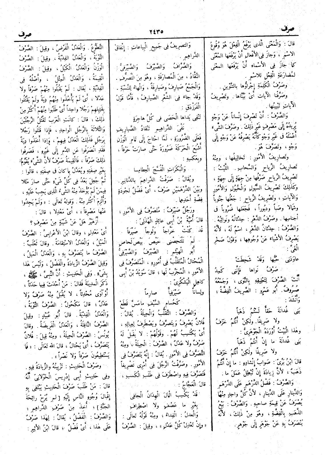 قال والمعنى الذي يرفع الفعل هو وقوع الاسم وجاز في الأَفعال أَن يرفعها المعنى كما جاز في الأَسماء أَن يرفعها المعنى لمُضارعَة الفعل للاسم وصَرْفُ الكلمة إجْراؤها بالتنوين وصَرَّفْنا الآياتِ أَي بيَّنْاها وتَصْريفُ الآيات تَبْيينُها والصَّرْفُ أَن تَصْرِفَ إنساناً عن وجْهٍ يريده إلى مَصْرِفٍ غير ذلك وصَرَّفَ الشيءَ أَعْمله في غير وجه كأَنه يَصرِفُه عن وجه إلى وجه وتَصَرَّفَ هو وتَصارِيفُ الأُمورِ تَخالِيفُها ومنه تَصارِيفُ الرِّياحِ والسَّحابِ الليث تَصْريفُ الرِّياحِ صَرْفُها من جهة إلى جهة وكذلك تصريفُ السُّيُولِ والخُيولِ والأُمور والآيات وتَصْريفُ الرياحِ جعلُها جَنُوباً وشَمالاً وصَباً ودَبُوراً فجعلها ضُروباً في أَجْناسِها وصَرْفُ الدَّهْرِ حِدْثانُه ونَوائبُه والصرْفُ حِدْثان الدهر اسم له لأَنه يَصْرِفُ الأَشياء عن وجُوهها وقول صخر الغَيّ عاوَدَني حُبُّها وقد شَحِطَتْ صَرْفُ نَواها فإنَّني كَمِدُ أَنَّث الصرف لتَعْلِيقه بالنَّوى وجمعه صُروفٌ أَبو عمرو الصَّريف الفضّةُ وأَنشد بَني غُدانةَ حَقّاً لَسْتُمُ ذَهَباً ولا صَريفاً ولكن أَنْتُمُ خَزَفُ وهذا البيتُ أَورَدَه الجوهري بني غُدانَةَ ما إن أَنتُمُ ذَهَباً ولا صَريفاً ولكن أَنتُمُ خزَفُ قال ابن بري صواب إنشاده ما إِن أَنْتُمُ ذَهبٌ لأَن زيادة إنْ تُبْطِل عمل ما والصَّرْفُ فَضْلُ الدًِّرهم على الدرهم والدينار على الدِّينار لأَنَّ كلَّ واحد منهما يُصْرَفُ عن قِيمةِ صاحِبه والصَّرْفُ بيع الذهب بالفضة وهو من ذلك لأَنه يُنْصَرَفُ به عن جَوْهر إلى جَوْهر والتصْريفُ في جميع البِياعاتِ إنْفاق الدَّراهم والصَّرَّافُ والصَّيْرَفُ والصَّيْرَفيُّ النقّادُ من المُصارفةِ وهو التَّصَرُّفِ والجمع صَيارِفُ وصَيارِفةٌ والهاء للنسبة وقد جاء في الشعر الصَّيارِفُ فأَما قول الفرزدق تَنْفِي يَداها الحَصى في كلِّ هاجِرَةٍ نَفْيَ الدَّراهِيمِ تَنْقادُ الصَّيارِيفِ فعلى الضرورة لما احتاج إلى تمام الوزن أَشْبع الحركة ضرورةً حتى صارت حرفاً وبعكسه والبَكَراتِ الفُسَّجَ العطامِسا ويقال صَرَفْتُ الدَّراهِمَ بالدَّنانِير وبين الدِّرهمين صَرْفٌ أَي فَضْلٌ لجَوْدةِ فضة أَحدهما ورجل صَيْرَفٌ مُتَصَرِّفٌ في الأُمور قال أُمَيَّة ابن أَبي عائذ الهذلي قد كُنْتُ خَرَّاجاً وَلُوجاً صَيْرَفاً لم تَلْتَحِصْني حَيْصَ بَيْصَ لَحاصِ أَبو الهيثم الصَّيْرفُ والصَّيْرَفيُّ المحتال المُتقلب في أُموره المُتَصَرِّفُ في الأَُمور المُجَرّب لها قال سويد بن أَبي كاهل اليَشْكُرِيّ ولِساناً صَيْرَفِيّاً صارِماً كحُسامِ السَّيْفِ ما مَسَّ قَطَعْ والصَّرْفُ التَّقَلُّبُ والحِيلةُ يقال فلان يَصْرِف ويَتَصَرَّفُ ويَصْطَرِفُ لعياله أَي يَكتسب لهم وقولهم لا يُقبل له صَرْفٌ ولا عَدْلٌ الصَّرْفُ الحِيلة ومنه التَّصَرُّفُ في الأَمور يقال إنه يتصرَّف في الأَُمور وصَرَّفْت الرجل في أَمْري تَصْريفاً فتَصَرَّفَ فيه واصْطَرَفَ في طلَبِ الكسْب قال العجاج قد يَكْسِبُ المالَ الهِدانُ الجافي بغَيْرِ ما عَصْفٍ ولا اصْطِرافِ والعَدْلُ الفِداء ومنه قوله تعالى وإن تَعْدِلْ كلَّ عَدْلٍ وقيل الصَّرْفُ التَّطَوُّعُ والعَدْلُ الفَرْضُ وقيل الصَّرْفُ التوبةُ والعدل الفِدْيةُ وقيل الصرفُ الوَزْنُ والعَدْلُ الكَيْلُ وقيل الصَّرْفُ القيمةُ والعَدلُ المِثْلُ وأَصلُه في الفِدية يقال لم يقبلوا منهم صَرفاً ولا عَدلاً أَي لم يأْخذوا منهم دية ولم يقتلوا بقَتيلهم رجلاً واحداً أَي طلبوا منهم أَكثر من ذلك قال كانت العرب تقتل الرجلين والثلاثة بالرجل الواحد فإذا قتلوا رجلاً برجل فذلك العدل فيهم وإذا أَخذوا دية فقد انصرفوا عن الدم إلى غيره فَصَرَفوا ذلك صرْفاً فالقيمة صَرْف لأَن الشيء يُقَوّم بغير صِفته ويُعَدَّل بما كان في صفته قالوا ثم جُعِل بعدُ في كل شيء حتى صار مثلاً فيمن لم يؤخذ منه الشيء الذي يجب عليه وأُلزِمَ أَكثر 