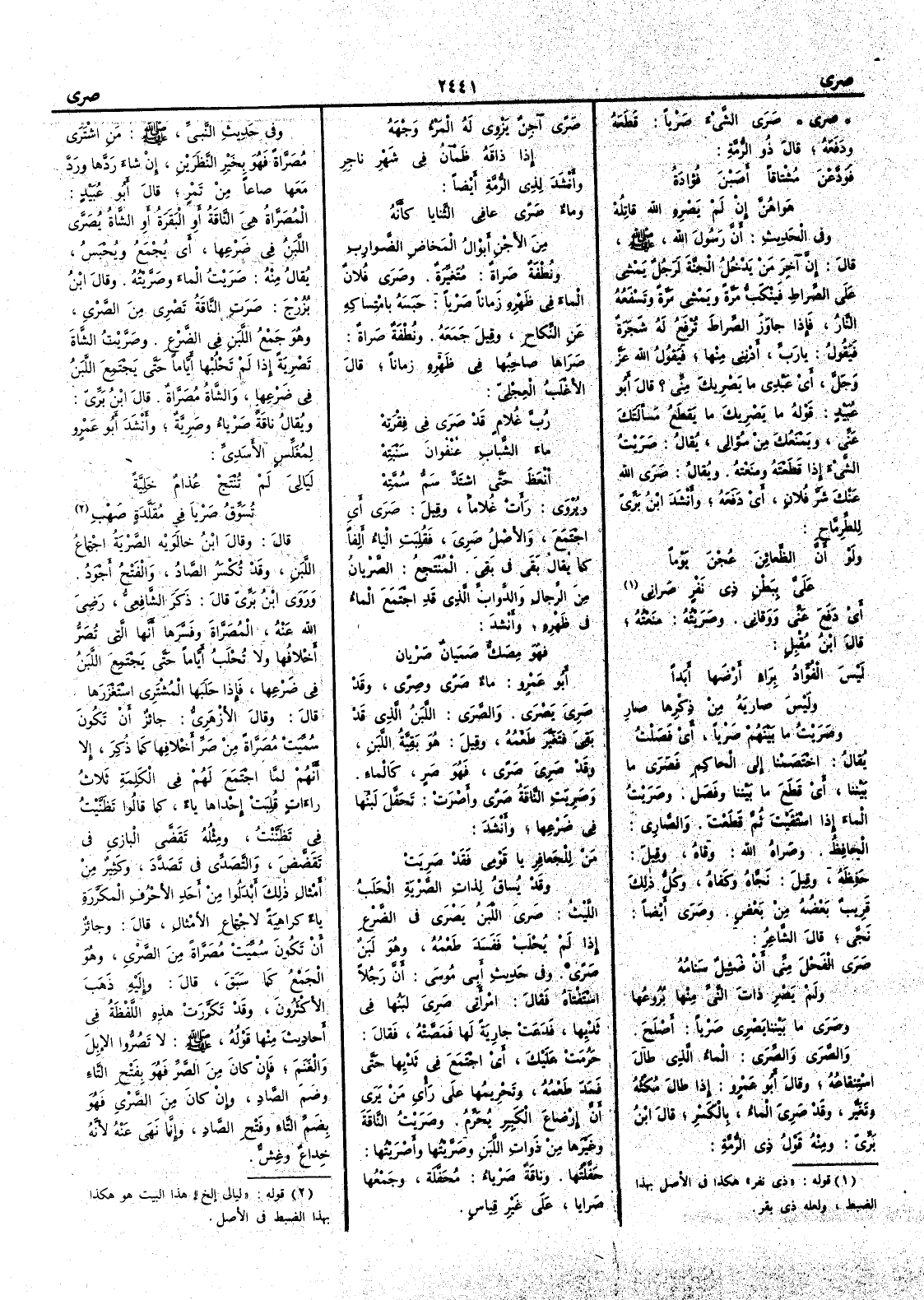 أَي دَفعَ عني ووقاني وصَرَيْتهُ منَعْتُه قال ابن مقبل ليس الفُؤادُ بِراءٍ أَرْضَها أَبداً وليس صارِيَهُ مِنْ ذِكرِها صارِ وصَرَيْتُ ما بينهم صَرْياً أَي فَصَلْتُ يقال اخْتَصَمنا إلى الحاكم فصَرَى ما بينَنا أَي قَطَعَ ما بينَنا وفَصَلَ وصَرَيْتُ الماءَ إذا اسْتَقَيْتَ ثم قَطَعْتَ والصاري الحافِظُ وصَراةُ الله وقاه وقيل حَفِظَه وقيل نَجَّاه وكَفاهُ وكلُّ ذلك قريبٌ بعضهُ من بعضٍ وصَرَى أَيضاً نَجَّى قال الشاعر صَرَى الفَحْلَ مِنِّي أَنْ ضَئِيلٌ سَنامُه ولم يَصْرِ ذاتَ النَّيِّ منها بُرُوعُها وصَرَى ما بينَنا يَصْري صَرْياً أَصْلَحَ والصَّرَى والصِّرَى الماءُ الذي طالَ اسْتِنقاعه وقال أَبو عمرو إذا طال مُكْثُه وتغَيَّر وقد صَرِي الماءُ بالكسر قال ابن بري ومنه قول ذي الرمة صَرىً آجِنٌ يَزْوي له المَرْءُ وجْهَه إذا ذاقَه ظَمْآنُ في شَهْرِ ناجِرِ وأَنشد لذي الرمة أَيضاً وماء صَرىً عافي الثَّنايا كأَنه من الأَجْنِ أَبْوالُ المَخاضِ الضَّوارِبِ ونُطْفةٌ صَراةٌ مُتَغيِّرَة وصَرَى فُلانٌ الماءَ في ظَهْرِه زَماناً صَرْياً حَبَسه بامْتِساكه عن النكاح وقيل جَمَعه ونُطْفةٌ صَراةٌ صَرَاها صاحِبُها في ظَهْرهِ زماناً قال الأَغلب العجلي رُبَّ غُلامٍ قد صَرَى في فِقْرَتِهْ ماءَ الشَّبابِ عُنْقُوانَ سَنْبَتِهْ أَنْعَظَ حتى اشتَدَّ سََمُّ سُمَّتِهْ ويروى رأَتْ غلاماً وقيل صَرَى أَي اجْتَمع والأَصل صَرِيَ فقلبت الياءُ أَلفاً كما يقال بَقَى في بَقِيَ المُنْتَجع الصَّرْيانُ من الرجال والدوابِّ الذي قد اجْتَمع الماءُ في ظَهْرهِ وأَنشد فهو مِصَكُّ صَمَىان صَرْيان أَبو عمرو ماءٌ صَرىً وصِرىً وقد صَرِي يَصْرى والصَّرَى اللبن الذي قد بَقِيَ فتَغَيَّرَ طَعْمهُ وقيل هو بقيَّةُ اللَّبَنِ وقد صَرِيَ صَرىً فهو صَرٍ كالماء وصَرِيَتِ الناقةُ صَرىً وأَصْرَتْ تَحَفَّل لبَنُها في ضَرْعِها وأَنشد مَنْ للجَعافِرِ يا قوْمي فقد صَرِيَتْ وقد يُساقُ لذاتِ الصَّرْيةِ الحَلَبُ الليث صَرِيَ اللَّبَنُ يَصْرى في الضَّرْعِ إذا لم يُحْلَبْ ففَسَدَ طَعْمُهُ وهو لَبَنٌ صَرىً وفي حديث أَبي موسى أَنَّ رجلاً اسْتَفْتاه فقال امرأَتي صَرِيَ لبَنُها في ثَدْيها فدَعَتْ جارِيةً لها فمَصَّته فقال حَرُمَت عليكَ أَي اجْتَمَع في ثدْيِها حتى فسَدَ طَعْمُه وتحْريمُها على رأْيِ من يَرَى أَنَّ إرْضاع الكبير يُحَرِّم وصَرَيْتُ الناقةَ وغيرَها من ذواتِ اللَّبنِ وصَرَّيْتُها وأَصْرَيتها حفَّلْتها وناقةٌ صَرْياءُ مُحَفَّلة وجمعُها صَرايا على غير قياس وفي حديث النبي صلى الله عليه وسلم من اشترى مُصَرَّاة فهو بخير النَّظَرَينِ إن شاءَ رَدَّها ورَدَّ معها صاعاً من تمرٍ قال أَبو عبيد المُصَرّاة هي الناقةُ أَو البَقرة أَو الشاة يُصَرَّى اللبنُ في ضَرْعِها أَي يُجْمَعُ ويُحْبَسُ يقال منه صَرَيْتُ الماءَ وصَرَّيْتُه وقال ابن بزرج صَرَتِ الناقةُ تَصْرِي من الصَّرْيِ وهو جمع اللبنِ في الضَّرْعِ وصَرَّيْت الشاة تَصْرِيةً إذا لم تَحْلُبْها أَياماً حتى يجتمعَ اللَّبَنُ في ضَرْعِها والشاةُ مُصَرَّاة قال ابن بري ويقال ناقةٌ صَرْياءُ وصَرِيَّة وأَنشد أَبو عَمْرو لمُغَلِّس الأَسَدِيِّ لَيَاليَ لم تُنْتَجْ عُذامٌ خَلِيَّةً تُسَوِّقُ صَرْىَا في مُقَلَّدَةٍ صُهْبِ