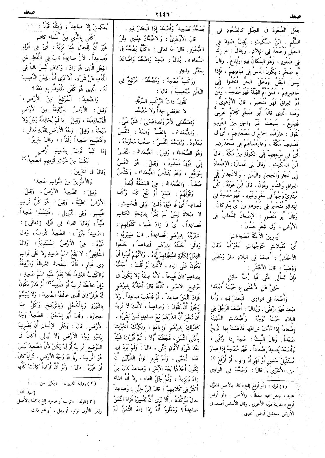 ( * قوله « او أرفع إلخ » كذا بالأصل المعوّل عليه ولعل فيه سقطاً والأصل أو أرض أَرفع بقرينة قوله الأخرى وقال الأساس أصعد في الأرض مستقبل أرض أخرى ) من الأُخرى قال وصَعَّدَ في الوادي يُصَعّدُ تَصْعِيداً وأَصْعَدَ إِذا انحدر فيه قال الأَزهري والاصِّعَّادُ عندي مثل الصُّعُود قال الله تعالى كأَنما يَصَّعِّد في السماء يقال صَعِدَ واصَّعَّدَ واصَّاعَدَ بمعنى واحد ورَكَبٌ مُصْعِدٌ ومُصَّعِّدٌ مرتفع في البطن منتصب قال تقول ذاتُ الرَّكَبِ المُرَفَّدِ لا خافضٍ جِدّاً ولا مُصَّعِّد وتصَعَّدني الأَمرُ وتَصاعَدني شَقَّ عليَّ والصُّعَداءُ بالضم والمدّ تنفس ممدود وتصَعَّدَ النَّفَسُ صَعُبَ مَخْرَجُه وهو الصُّعَداءُ وقيل الصُّعَداءُ النفَسُ إِلى فوق ممدود وقيل هو النفَسُ بتوجع وهو يَتَنَفَّسُ الصُّعَداء ويتنفس صُعُداً والصُّعَداءُ هي المشقة أَيضاً وقولهم صَنَعَ أَو بَلَغَ كذا وكذا فَصاعِداً أَي فما فوق ذلك وفي الحديث لا صلاةَ لمن لم يقرأْ بفاتحة الكتاب فَصاعِداً أَي فما زاد عليها كقولهم اشتريته بدرهم فصاعداً قال سيبويه وقالوا أَخذته بدرهم فصاعداً حذفوا الفعل لكثرة استعمالهم إِياه ولأَنهم أَمِنوا أَن يكون على الباء لأَنك لو قلت أَخذته بِصاعِدٍ كان قبيحاً لأَنه صفة ولا يكون في موضع الاسم كأَنه قال أَخذته بدرهم فزاد الثمنُ صاعِداً أَو فذهب صاعداً ولا يجوز أَن تقول وصاعداً لأَنك لا تريد أَن تخبر أَن الدرهَم مع صاعِدٍ ثَمَنٌ لشيء كقولك بدرهم وزيادة ولكنك أَخبرت بأَدنى الثمن فجعلته أَولاً ثم قَرَّرْتَ شيئاً بعد شيء لأَثْمانٍ شَتَّى قال ولم يُرَدْ فيها هذا المعنى ولم يُلْزِم الواوُ الشيئين أَن يكون أَحدهما بعد الآخر وصاعِدٌ بدل من زاد ويزيد وثم مثل الفاء إِلاَّ أَنّ الفاء أَكثر في كلامهم قال ابن جني وصاعداً حال مؤكدة أَلا ترى أَن تقديره فزاد الثمنُ صاعِداً ؟ ومعلوم أَنه إِذا زاد الثمنُ لم يمكن إِلا صاعِداً ومثله قوله كَفى بالنَّأْيِ من أَسْماءَ كافٍ غير أَن للحال هنا مزية أَي في قوله فصاعداً لأَن صاعداً ناب في اللفظ عن الفعل الذي هو زاد وكاف ليس نائباً في اللفظ عن شيء أَلا ترى أَن الفعل الناصب له الذي هو كفى ملفوظ به معه ؟ والصعيدُ المرتفعُ من الأَرض وقيل الأَرض المرتفعة من الأَرض المنخفضةِ وقيل ما لم يخالطه رمل ولا سَبَخَةٌ وقيل وجه الأَرض لقوله تعالى فَتُصْبِحَ صَعِيداً زَلَقاً وقال جرير إِذا تَيْمٌ ثَوَتْ بِصَعِيد أَرْضٍ بَكَتْ من خُبْثِ لُؤْمِهِم الصَّعيدُ وقال في آخرين والأَطْيَبِينَ من التراب صَعيدا وقيل الصَّعِيدُ الأَرضُ وقيل الأَرض الطَّيِّبَةُ وقيل هو كل تراب طيب وفي التنزيل فَتَيَمَّموا صَعِيداً طَيِّباً وقال الفراء في قوله صَعيداً جُرزُاً الصعيد التراب وقال غيره هي الأَرض المستوية وقال الشافعي لا يَقع اسْمُ صَعيد إِلاّ على تراب ذي غُبار فأَما البَطْحاءُ الغليظة والرقيقة والكَثِيبُ الغليظ فلا يقع عليه اسم صعيد وإِن خالطه تراب أَو صعيد