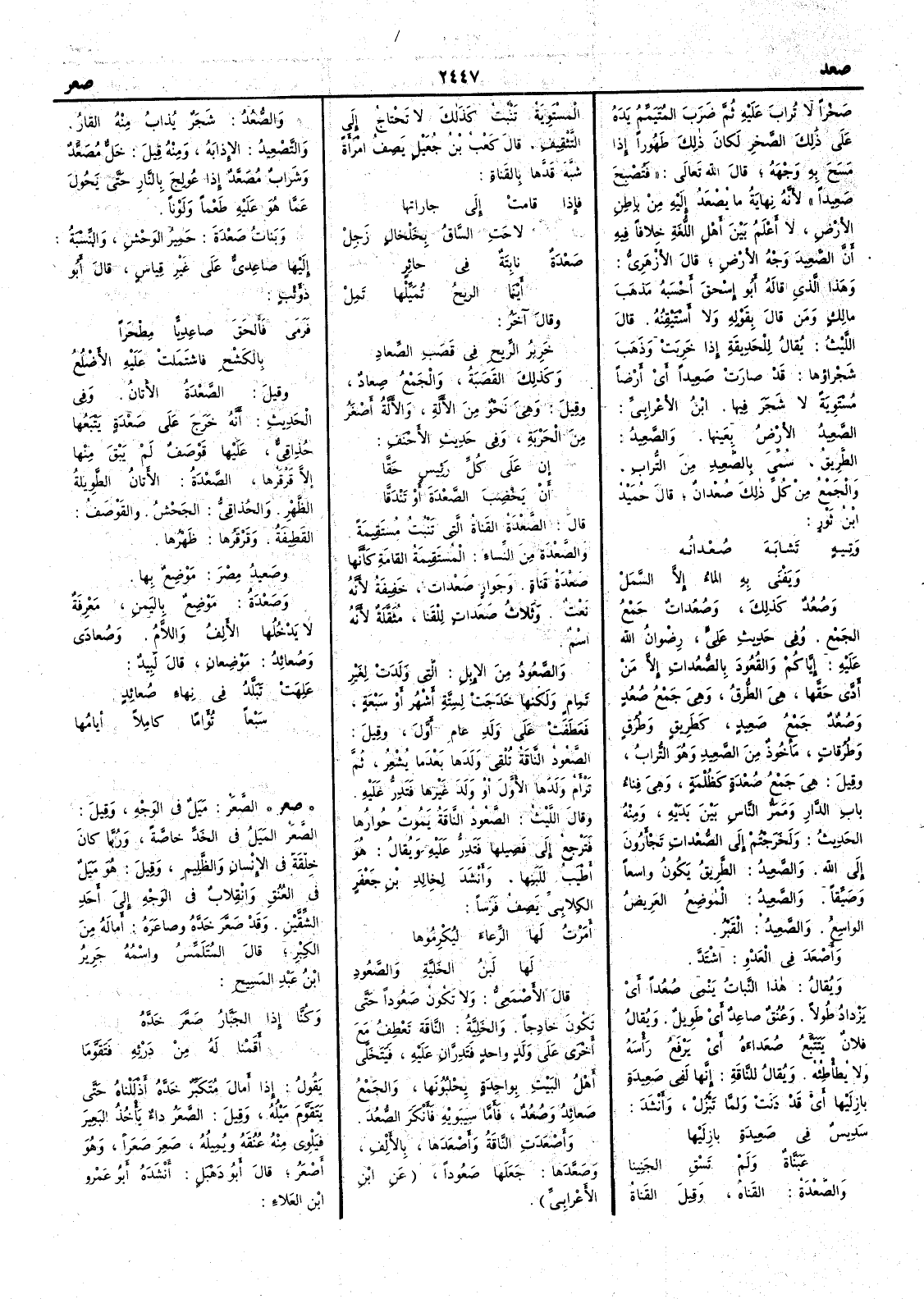 صخراً لا تراب عليه ثم ضرب المتيمم يدَه على ذلك الصخر لكان ذلك طَهُوراً إِذا مسح به وجهه قال الله تعالى فَتُصْبِح صعيداً لأَنه نهاية ما يصعد إِليه من باطن الأَرض لا أَعلم بين أَهل اللغة خلافاً فيه أَن الصعيد وجه الأَرض قال الأَزهري وهذا الذي قاله أَبو إِسحق أَحسَبه مذهَبَ مالك ومن قال بقوله ولا أَسْتَيْقِنُه قال الليث يقال للحَديقَةِ إِذا خَرِبت وذهب شَجْراؤُها قد صارت صعيداً أَي أَرضاً مستوية لا شَجَرَ فيها ابن الأَعرابي الصعيدُ الأَرضُ بعينها والصعيدُ الطريقُ سمي بالصعيد من التراب والجمع من كل ذلك صُعْدانٌ قال حميد بن ثور وتِيهٍ تَشابَهَ صُعْدانُه ويَفْنى بهِ الماءُ إِلاَّ السَّمَلْ وصُعُدٌ كذلك وصُعُداتٌ جمع الجمع وفي حديث علي رضوان الله عليه إِياكم والقُعُودَ بالصُّعُداتِ إِلاَّ مَنْ أَدَّى حَقَّها هي الطُّرُقُ وهي جمع صُعُدٍ وصُعُدٌ جمعُ صَعِيد كطريق وطرُق وطُرُقات مأْخوذ من الصَّعيدِ وهو التراب وقيل هي جمع صُعْدَةٍ كظُلْمة وهي فِناءُ باب الدار ومَمَرُّ الناس بين يديه ومنه الحديث ولَخَرَجْتم إِلى الصُّعْداتِ تَجْأَرُونَ إِلى الله والصَّعِيدُ الطريقُ يكون واسعاً وضَيِّقاً والصَّعيدُ الموضعُ العريضُ الواسعُ والصَّعيدُ القبر وأَصْعَدَ في العَدْو اشْتَدَّ ويقال هذا النبات يَنْمي صُعُداً أَي يزداد طولاً وعُنُقٌ صاعِدٌ أَي طويل ويقال فلان يتتبع صُعَداءَه أَي يرفع رأْسه ولا يُطأْطِئُه ويقال للناقة إِنها لفي صَعِيدَةِ بازِلَيْها أَي قد دنت ولمَّا تَبْزُل وأَنشد سَديسٌ في صَعِيدَةِ بازِلَيْها عَبَنَّاةٌ ولم تَسْقِ الجَنِينا والصَّعْدَةُ القَناة وقيل القناة المستوية تنبت كذلك لا تحتاج إِلى التثقيف قال كعب بن جُعَيْل يصف امرأَةً شَبَّهَ قَدَّها بالقَناة فإِذا قامتْ إِلى جاراتِها لاحَتِ السَّاقُ بِخَلْخالٍ زجِلْ صَعْدَةٌ نابِتَةٌ في حائرٍ أَيْنَما الرِّيحُ تُمَيِّلْها تَمِلْ وقال آخر خَريرُ الرِّيحِ في قَصَبِ الصِّعادِ وكذلك القَصَبَةُ والجمع صِعادٌ وقيل هي نحو من الأَلَّةِ والأَلَّةُ أَصغر من الحَرْبَةِ وفي حديث الأَحنف إِنَّ على كُلِّ رَئِيسٍ حَقَّا أَن يَخْضِبَ الصَّعْدَةَ أَو تَنْدَقَّا قال الصَّعْدةُ القناة التي تنبت مستقيمة والصَّعْدَةُ من النساء المستقيمةُ القامة كأَنها صَعْدَةُ قَناةٍ وجوارٍ صَعْداتٌ خفيفةٌ لأَنه نعت وثلاثُ صَعَداتٍ للقنا مُثَقَّلة لأَنه اسم والصَّعُودُ من الإِبل التي وَلَدَتْ لغير تمام ولكنها خَدَجَتْ لستة أَشهر أَو سبعة فَعَطَفَتْ على ولدِ عامِ أَوَّلَ وقيل الصَّعُود الناقة تُلْقي ولَدها بعدما يُشْعِرُ ثم تَرْأَمُ ولدَها الأَوّل أَو وَلَدَ غيرها فَتَدِرُّ عليه وقال الليث الصَّعُود الناقة يموت حُوارُها فَتَرْجِعُ إِلى فصيلها فَتَدِرُّ عليه ويقال هو أَطيب للبنها وأَنشد لخالد بن جعفر الكلابي يصف فرساً أَمَرْتُ لها الرِّعاءَ ليُكْرِمُوها لها لَبَنُ الخلِيَّةِ والصَّعُودِ قال الأَصمعي ولا تكون صَعُوداً حتى تكون خادِجاً والخَلِيَّةُ الناقة تَعْطِف مع أُخرى على ولد واحد فَتَدِرَّانِ عليه فَيَتَخلى أَهلُ البيت بواحدة يَحْلُبُونها والجمع صَعائد وصُعُدٌ فأَما سيبويه فأَنكر الصُّعُدَ وأَصْعَدَتِ الناقةُ وأَصْعَدَها بالأَلف وصَعَّدَها جعلها صَعُوداً عن ابن الأَعرابي والصُّعُد شجر يُذاب منه القارُ والتَّصْعِيدُ الإِذابة ومنه قيل خلٌّ مُصَعَّدٌ وشرابٌ مُصَعَّدٌ إِذا عُولج بالنار حتى يحول عما هو عليه طعماً ولوناً وبَناتُ صَعْدَةَ حَميرُ الوَحْش والنسبة إِليها صاعِديّ على غير قياس قال أَبو ذؤَيب فَرَمَى فأَلحَق صاعِدِيَّاً مِطْحَراً بالكَشْحِ فاشتملتْ عليه الأَضْلُعُ وقيل الصَّعْدَةُ الأَتان وفي الحديث أَنه خرج على صَعْدَةٍ يَتْبَعُها حُذاقيٌّ عليها قَوْصَفٌ لم يَبْق منها إِلا قَرْقَرُها الصَّعْدَةُ الأَتان الطويلة الظهر والحُذاقِيُّ الجَحْشُ والقَوْصَفُ القَطيفة وقَرْقَرُها ظَهْ