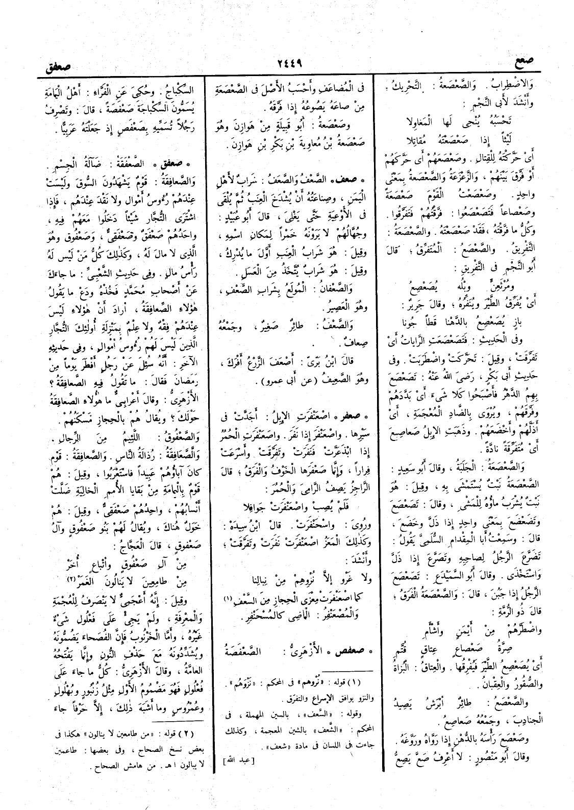 ( صعفص ) الأَزهري الصَّعْفَصةُ السِّكْباجُ وحكي عن الفراء أَهل اليَمامة يسمون السِّكْباجةَ صَعْفَصةً قال وتَصْرف رجلاً تسميه بِصَعْفَص إِذا جعلته عربيّاً( صعفق ) الصَّعْفَقةُ ضَآلةُ الجسم والصَّعافِقةُ قوم يشهدون السُّوقَ وليست عندهم رؤُوس أَموال ولا نَقْدَ عندهم فإِذا اشترى التُّجَّارُ شيئاً دخلوا معهم فيه واحدهم صَعْفَقٌ وصَعْفَقِيّ وصَعْفُوق وهو الذي لا مال له وكذلك كل من ليس له رأْس مال وفي حديث الشعبي ما جاءك عن أَصحاب محمد فخُذْه ودَعْ ما يقول هؤلاء الصَّعافِقةُ أَراد أَن هؤلاء ليس عندهم فِقْهٌ ولا علم بمنزلة أُولئك التجار الذين ليس لهم رؤوس أَموال وفي حديثه الآخر أَنه سئل عن رجل أَفطر يوماً من رمضانَ فقال ما تقول فيه الصَّعافِقةُ ؟ الأَزهري وقال أَعرابي ما هؤلاء الصَّعافِقة حوْلَك ؟ ويقال هم بالحجاز مسكنهم والصَّعْفُوق اللئيمُ من الرجال والصَّعافِقةُ رُذالةُ الناس والصَّعافِقةُ قومٌ كان آباؤهم عَبيداً فاسْتَعْرَبُوا وقيل هم قوم باليمامة من بقايا الأُمَم الخالية ضلّت أَنسابهم واحدهم صَعْفَقِيّ وقيل هم خَوَلٌ هناك ويقال لهم بنو صَعْفوق وآل صَعْفوق قال العجاج من آل صَعْفُوق وأَتْباعٍ أُخَرْ من طامِعِين لا يَنالون الغَمَرْ