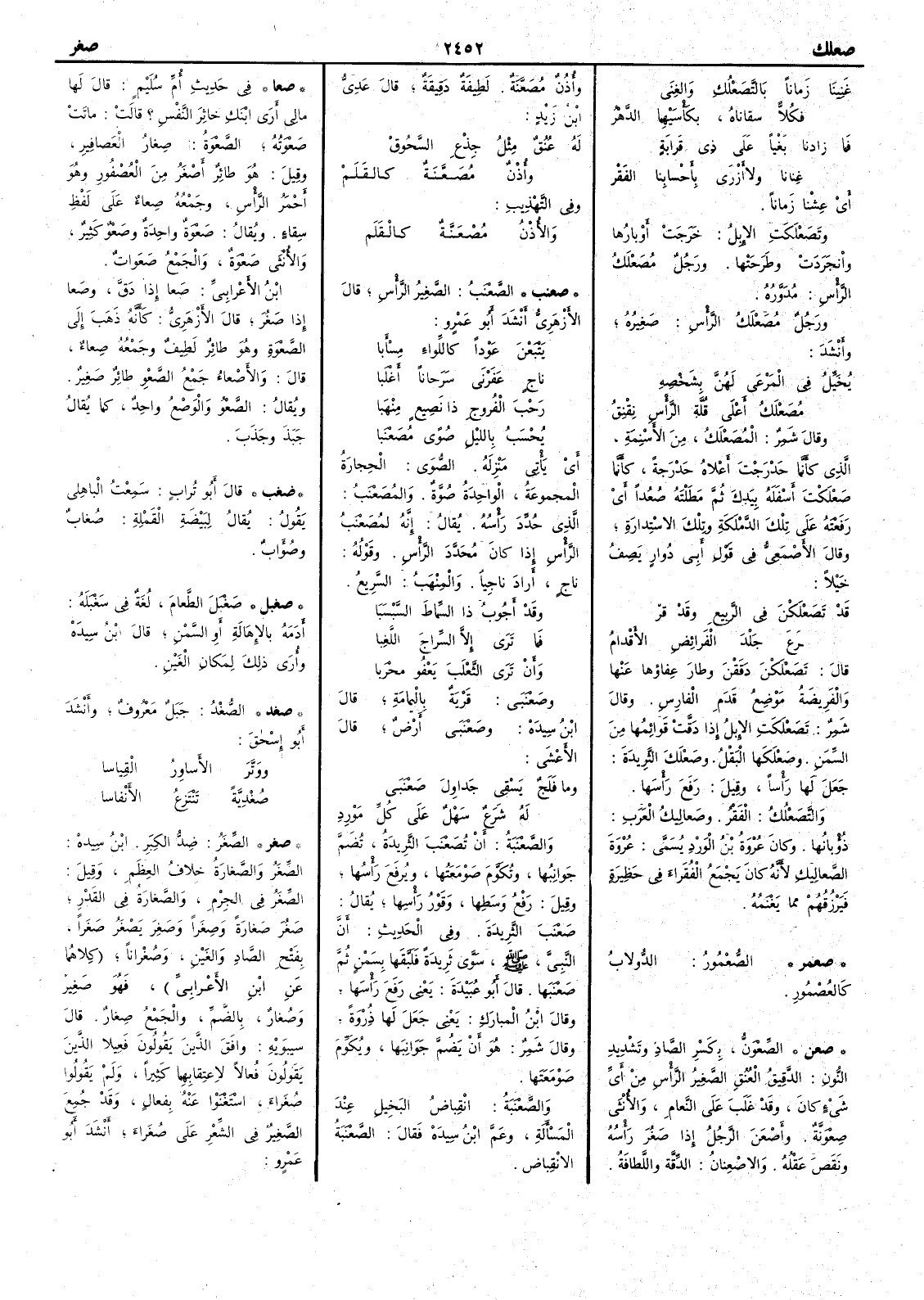 ( صعمر ) الصُّعْمُور الدُّولاب كالعُصْمُور ( صعن ) الصَّعْوَنُّ بكسر الصاد وتشديد النون الدَّقِيقُ العُنق الصغير الرأَس من أَيّ شيء كان وقد غلب على النّعام والأُنثى صِعْوَنَّة وأَصْعَنَ الرجلُ إذا صَغُر رأْسُه ونَقَصَ عقله والاصْعِنانُ الدِّقَّة واللَّطافة وأُذُنٌ مُصَعَّنَة لطيفة دَقيقة قال عَدي بن زيد له عُنُقٌ مثلُ جِذْعِ السَّحُوق وأُذْنٌ مُصَعَّنَةٌ كالقَلَمْ وفي التهذيب والأُذْنُ مُصْعَنَّةٌ كالقَلَمْ( صعنب ) الصَّعْنَبُ الصغير الرأْس قال الأَزهري أَنشد أَبو عمرو