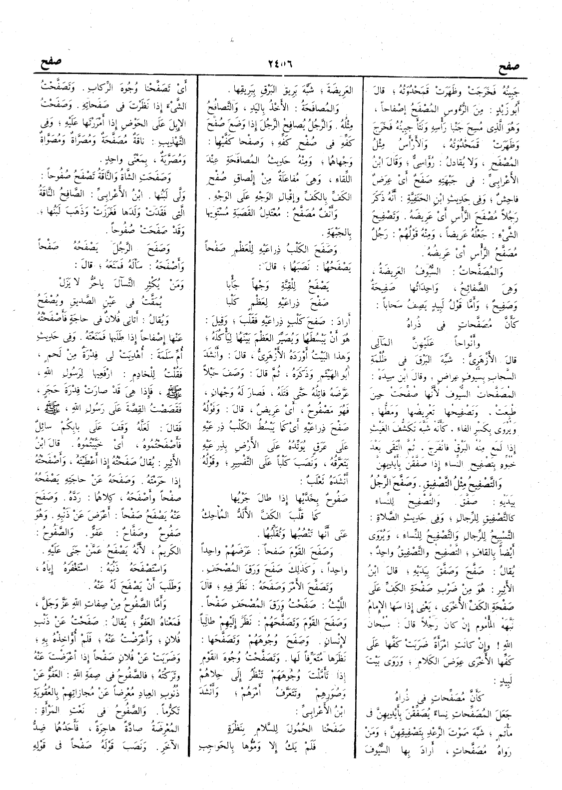 جبينه فخرجت وظهرت قَمَحْدُوَتُه قال أَبو زيد من الرؤوس المُصْفَحُ إِصْفاحاً وهو الذي مُسِحَ جنبا رأْسه ونَتَأَ جبينه فخرج وظهرت قَمَحْدُوَتُه والأَرْأَسُ مثلُ المُصْفَحِ ولا يقال رُؤَاسِيّ وقال ابن الأَعرابي في جبهته صَفَحٌ أَي عِرَضٌ فاحش وفي حديث ابن الحَنَفِيَّة أَنه ذكر رجلاً مُصْفَحَ الرأْس أَي عريضه وتَصْفِيحُ الشيء جَعْلُه عريضاً ومنه قولهم رجل مُصَفَّحُ الرأْس أَي عريضها والمُصَفَّحاتُ السيوف العريضة وهي الصَّفائح واحدتها صَفِيحةٌ وصَفيحٌ وأَما قول لبيد يصف سحاباً كأَنَّ مُصَفَّحاتٍ في ذُراهُ وأَنْواحاً عليهنَّ المَآلي قال الأَزهري شبَّه البرق في ظلمة السحاب بسيوفٍ عِراضٍ وقال ابن سيده المُصَفَّحاتُ السيوف لأَنها صُفِّحَتْ حين طُبِعَتْ وتَصْفِيحها تعريضها ومَطُّها ويروى بكسر الفاء كأَنه شبَّه تَكَشُّفَ الغيث إِذا لمَعَ منه البَرْق فانفرج ثم التقى بعد خُبُوِّه بتصفيح النساء إِذا صَفَّقْنَ بأَيديهن والتَّصفيح مثل التصفيق وصَفَّحَ الرجلُ بيديه صَفَّق والتَّصْفيح للنساء كالتصفيق للرجال وفي حديث الصلاة التسبيح للرجال والتصفيح للنساء ويروى أَيضاً بالقاف التصفيح والتصفيق واحد يقال صَفَّحَ وصَفَّقَ بيديه قال ابن الأَثير هو من ضَرْب صَفْحةِ الكفِّ على صفحة الكف الأُخرى يعني إِذا سها الإِمام نبهه المأْموم إِن كان رجلاً قال سبحان الله وإِن كانت امرأَة ضربت كفها على كفها الأُخرى عِوَضَ الكلام وروى بيت لبيد كأَنَّ مُصَفِّحاتٍ في ذُراهُ جعل المُصَفِّحات نساءً يُصَفِّقْن بأَيديهن في مأْتَمٍ شَبَّه صوتَ الرعد بتصفيقهن ومَن رواه مُصَفَّحاتٍ أَراد بها السيوف العريضة شبه بَرِيقَ البَرْقِ ببريقها والمُصافَحةُ الأَخذ باليد والتصافُحُ مثله والرجل يُصافِحُ الرجلَ إِذا وضع صُفْحَ كفه في صُفْح كفه وصُفْحا كفيهما وَجْهاهُما ومنه حديث المُصافَحَة عند اللِّقاء وهي مُفاعَلة من إِلصاق صُفْح الكف بالكف وإِقبال الوجه على الوجه وأَنْفٌ مُصَفَّحٌ معتدل القَصَبة مُسْتَوِيها بالجَبْهة وصَفَحَ الكلبُ ذراعيه للعظم صَفْحاً يَصْفَحهما نصبهما قال يَصْفَحُ للقِنَّةِ وَجْهاً جَأْبا صَفْحَ ذِراعَيْهِ لعَظْمٍ كَلْبا أَراد صَفْحَ كَلْبٍ ذراعيه فَقَلَبَ وقيل هو أَن يبسطهما ويُصَيِّرَ العظم بينهما ليأْكله وهذا البيت أَورده الأَزهري قال وأَنشد أَبو الهيثم وذكره ثم قال وصف حَبْلاً عَرَّضه فاتله حتى فتله فصار له وجهان فهو مَصْفُوح أَي عريض قال وقوله صَفْحَ ذراعيه أَي كما يَبْسُط الكلبُ ذراعيه على عَرَقٍ يُوَتِّدُه على الأَرض بذراعيه يَتَعَرَّقه ونصب كلباً على التفسير وقوله أَنشده ثعلب صَفُوحٌ بخَدَّيْها إِذا طالَ جَرْيُها كما قَلَّبَ الكَفَّ الأَلَدُّ المُماحِكُ عنى أَنها تنصبهما وتُقَلِّبهما وصَفَحَ القَومَ صَفْحاً عَرَضَهم واحداً واحداً وكذلك صَفَحَ وَرَقَ المصحف وتَصَفَّحَ الأَمرَ وصَفَحَه نظر فيه قال الليث صَفَحْت وَرَقَ المصحف صَفْحاً وصَفَحَ القومَ وتَصَفَّحَهم نظر إِليهم طالباً لإِنسان وصَفَحَ وُجُوهَهم وتَصَفَّحَها نظرها مُتَعَرِّفاً لها وتَصَفَّحْتُ وُجوهَ القوم إِذا تأَمَّلْتَ وجوههم تنظر إِلى حِلاهم وصُوَرهم وتَتَعَرَّفُ أَمرهم وأَنشد ابن الأَعرابي صَفَحْنا الحُمُولَ للسَّلامِ بنَظْرَةٍ فلم يَكُ إِلاَّ وَمْؤُها بالحَواجِبِ أَي تَصَفَّحْنا وجوه الرِّكاب وتَصَفَّحْت الشيء إِذا نظرت في صَفَحاته وصَفَحْتُ الإِبلَ على الحوضِ إِذا أَمررتها عليه وفي التهذيب ناقة مُصَفَّحة ومُصَرّاة ومُصَوّاة ومُصَرَّبَةٌ بمعنى واحد وصَفَحَتِ الشاةُ والناقة تَصْفَحُ صُفُوحاً وَلَّى لَبَنُها ابن الأَعرابي الصافح الناقة التي فَقَدَتْ وَلدَها فَغَرَزَتْ وذهب لبنها وقد صَفَحَتْ صُفُوحاً وصَفَح الرجلَ يَصْفَحُهُ صَفْحاً وأَصْفَحَه سأَله فمنعه قال ومن يُكْثِرِ التَّسْآلَ يا حُرّ لا يَزَلْ يُمَقَّتُ في عَينِ الصديقِ ويُصْفَحُ ويقال أَتان