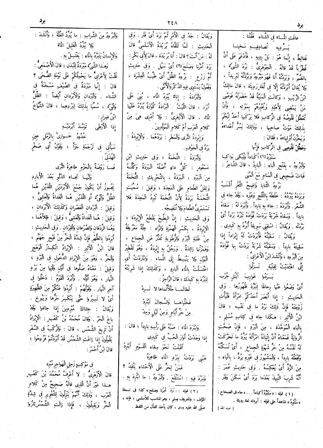 ( * قوله « برد أمرنا وصلح » كذا في نسخة المؤلف والمعروف وسلم وهو المناسب للأسلمي فانه صلى الله عليه وسلم كان يأخذ الفأل من اللفظ ) أَي سهل وفي حديث أُم زرع بَرُودُ الظل أَي طيب العشرة وفعول يستوي فيه الذكر والأُنثى والبَرَّادة إِناء يُبْرِد الماء بني على أَبْرَد قال الليث البَرَّادةُ كوارَةٌ يُبَرَّد عليها الماء قال الأَزهري ولا أَدري هي من كلام العرب أَم كلام المولدين وإِبْرِدَةُ الثرى والمطر بَرْدُهما والإِبْرِدَةُ بَرْدٌ في الجوف والبَرَدَةُ التخمة وفي حديث ابن مسعود كل داء أَصله البَرَدة وكله من البَرْد البَرَدة بالتحريك التخمة وثقل الطعام على المعدة وقيل سميت التخمةُ بَرَدَةً لأَن التخمة تُبْرِدُ المعدة فلا تستمرئ الطعامَ ولا تُنْضِجُه وفي الحديث إِن البطيخ يقطع الإِبردة الإِبردة بكسر الهمزة والراء علة معروفة من غلبة البَرْد والرطوبة تُفَتِّر عن الجماع وهمزتها زائدة ورجل به إِبْرِدَةٌ وهو تقطِير البول ولا ينبسط إِلى النساء وابْتَرَدْتُ أَي اغتسلت بالماء البارد وكذلك إِذا شربته لتَبْرُدَ به كبدك قال الراجز لَطالَما حَلأْتُماها لا تَرِدْ فَخَلِّياها والسِّجالَ تَبْتَرِدْ مِنْ حَرِّ أَيامٍ ومِنْ لَيْلٍ وَمِدْ وابْتَرَد الماءَ صَبَّه على رأَسه بارداً قال إِذا وجَدْتُ أُوَارَ الحُبِّ في كَبِدي أَقْبَلْتُ نَحْوَ سِقاء القوم أَبْتَرِدُ هَبْنِي بَرَدْتُ بِبَرْدِ الماءِ ظاهرَهُ فمَنْ لِحَرٍّ على الأَحْشاءِ يَتَّقِدُ ؟ وتَبَرَّدَ فيه استنقع والبَرُودُ ما ابْتُرِدَ به والبَرُودُ من الشراب ما يُبَرِّدُ الغُلَّةَ وأَنشد ولا يبرِّد الغليلَ الماءُ والإِنسان يتبرّد بالماء يغتسل به وهذا الشيء مَبْرَدَةٌ للبدن قال الأَصمعي قلت لأَعرابي ما يحملكم على نومة الضحى ؟ قال إِنها مَبْرَدَةٌ في الصيف مَسْخَنَةٌ في الشتاء والبَرْدانِ والأَبرَدانِ أَيضاً الظل والفيء سميا بذلك لبردهما قال الشماخ بن ضرار إِذا الأَرْطَى تَوَسَّدَ أَبْرَدَيْهِ خُدودُ جَوازِئٍ بالرملِ عِينِ سيأْتي في ترجمة جزأَ