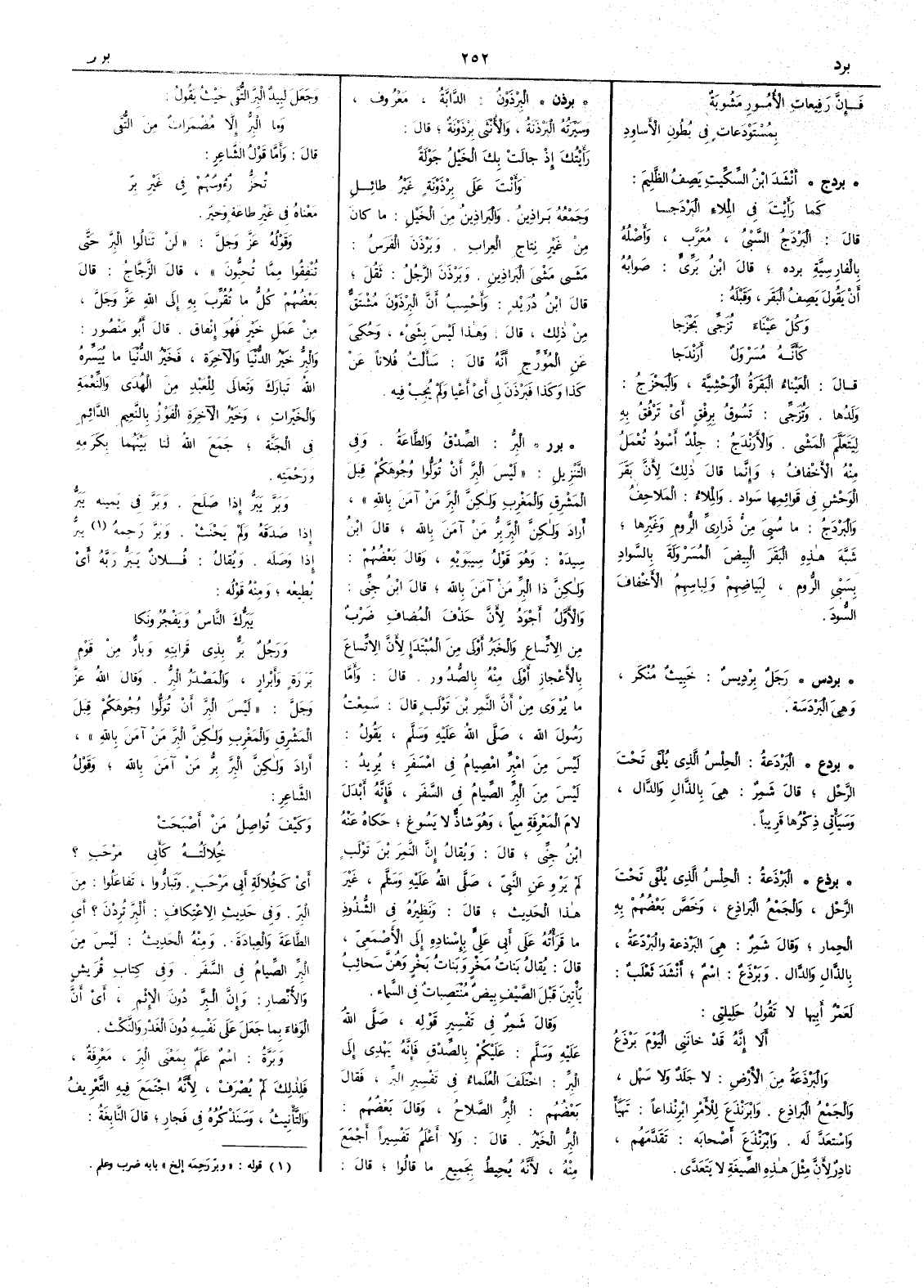 ( برر ) البِرُّ الصِّدْقُ والطاعةُ وفي التنزيل ليس البِرَّ أَنْ تُوَلُّوا وجُوهَكُمْ قِبَلَ المَشْرِقِ والمَغْرِبِ ولكنْ البِرَّ مَنْ آمنَ باللهِ أَراد ولكنَّ البِرَّ بِرُّ مَنْ آمن بالله قال ابن سيده وهو قول سيبويه وقال بعضهم ولكنَّ ذا الْبِرّ من آمن بالله قال ابن جني والأَول أَجود لأَن حذف المضاف ضَرْبٌ من الاتساع والخبر أَولى من المبتدإ لأَن الاتساع بالأَعجاز أَولى منه بالصدور قال وأَما ما يروى من أَن النَّمِرَ بنَ تَوْلَب قال سمعت رسول الله صلى الله عليه وسلم يقول ليس من امْبِرِّ امْصِيامُ في امْسَفَرِ يريد ليس من البر الصيام في السفر فإِنه أَبدل لام المعرفة ميماً وهو شاذ لا يسوغ حكاه عنه ابن جني قال ويقال إِن النمر بن تولب لم يرو عن النبي صلى الله عليه وسلم غير هذا الحديث قال ونظيره في الشذوذ ما قرأْته على أَبي عليّ بإِسناده إِلى الأَصمعي قال يقال بَناتُ مَخْرٍ وبَناتُ بَخْرٍ وهن سحائب يأْتين قَبْلَ الصيف بيضٌ مُنْتَصِباتٌ في السماء وقال شمر في تفسير قوله صلى الله عليه وسلم عليكم بالصِّدْق فإِنه يَهْدي إِلى البِرِّ اختلف العلماء في تفسير البر فقال بعضهم البر الصلاح وقال بعضهم البر الخير قال ولا أَعلم تفسيراً أَجمع منه لأَنه يحيط بجميع ما قالوا قال وجعل لبيدٌ البِرَّ التُّقى حيث يقول وما البِرُّ إِلا مُضْمَراتٌ مِنَ التُّقى قال وأَما قول الشاعر تُحَزُّ رؤُوسهم في غيرِ بِرّ معناه في غير طاعة وخير وقوله عز وجل لَنْ تنالوا البِرَّ حتى تُنْفِقُوا مما تُحِبُّونَ قال الزجاج قال بعضهم كلُّ ما تقرّب به إِلى الله عز وجل من عمل خير فهو إِنفاق قال أَبو منصور والبِرُّ خير الدنيا والآخرة فخير الدنيا ما ييسره الله تبارك وتعالى للعبد من الهُدى والنِّعْمَةِ والخيراتِ وخَيْرُ الآخِرَةِ الفَوْزُ بالنعيم الدائم في الجنة جمع الله لنا بينهما بكرمه ورحمته وبَرَّ يَبَرُّ إِذا صَلَحَ وبَرَّ في يمينه يَبَرُّ إِذا صدقه ولم يَحْنَثْ وبَرَّ رَحِمَهُ