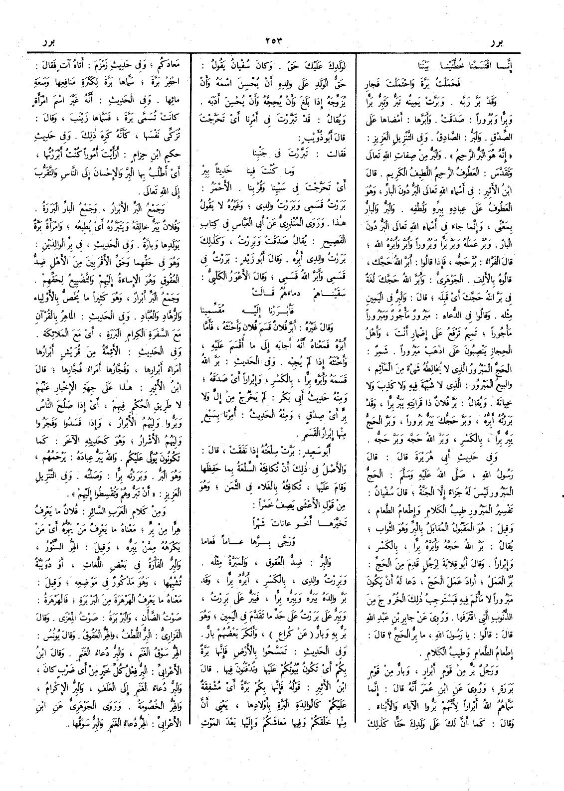 إِنَّا اقْتَسَمْنا خُطَّتَيْنا بَيْنَنا فَحَمَلْتُ بَرَّةَ واحْتَمَلْتَ فَجارِ وقد بَرَّ رَبَّه وبَرَّتْ يمينُه تَبَرُّ وتَبِرُّ بَرّاً وبِرّاً وبُرُوراً صَدَقَتْ وأَبَرَّها أَمضاها على الصِّدْقِ والبَرُّ الصادقُ وفي التنزيل العزيز إِنه هو البَرُّ الرحيمُ والبَرُّ من صفات الله تعالى وتقدس العَطُوفُ الرحيم اللطيف الكريم قال ابن الأَثير في أَسماء الله تعالى البَرُّ دون البارِّ وهو العَطُوف على عباده بِبِرَّهِ ولطفه والبَرُّ والبارُّ بمعنًى وإِنما جاء في أَسماء الله تعالى البَرُّ دون البارّ وبُرَّ عملُه وبَرَّ بَرّاً وبُرُوراً وأَبَرَّ وأَبَرَّه الله قال الفراء بُرَّ حَجُّه فإِذا قالوا أَبَرَّ الله حَجَّك قالوه بالأَلف الجوهري وأَبَرَّ اللهُ حَجَّك لغة في بَرَّ اللهُ حَجَّك أَي قَبِلَه قال والبِرُّ في اليمين مثلُه وقالوا في الدعاء مَبْرُورٌ مَأْجُورٌ ومَبرُوراً مَأْجوراً تميمٌ ترفع على إِضمار أَنتَ وأَهلُ الحجاز ينصبون على اذْهَبْ مَبْرُوراً شمر الحج المَبْرُورُ الذي لا يخالطه شيء من المآثم والبيعُ المبرورُ الذي لا شُبهة فيه ولا كذب ولا خيانة ويقال بَرَّ فلانٌ ذا قرابته يَبَرُّ بِرّاً وقد برَرْتُه أَبِرُّه وبَرَّ حَجُّكَ يَبَرُّ بُرُوراً وبَرَّ الحجُّ يَبِرُّ بِرّاً بالكسر وبَرَّ اللهُ حَجَّهُ وبَرَّ حَجُّه وفي حديث أَبي هريرة قال قال رسولُ الله صلى الله عليه وسلم الحجُّ المبرورُ ليس له جزاءٌ إِلا الجنةُ قال سفيان تفسير المبرور طِيبُ الكلام وإِطعام الطعام وقيل هو المقبولُ المقابَلُ بالبرِّ وهو الثواب يقال بَرَّ اللهُ حَجَّه وأَبَرَّهُ بِرّاً بالكسر وإِبْرَاراً وقال أَبو قِلابَةَ لرجل قَدِمَ من الحج بُرَّ العملُ أَرادَ عملَ الحج دعا له أَن يكون مَبْرُوراً لا مَأْثَمَ فيه فيستوجب ذلك الخروجَ من الذنوب التي اقْتَرَفَها وروي عن جابر بن عبدالله قال قالوا يا رسول الله ما بِرُّ الحجِّ ؟ قال إِطعامُ الطعام وطِيبُ الكلامِ ورجل بَرٌّ من قوم أَبرارٍ وبارٌّ من قوم بَرَرَةٍ وروي عن ابن عمر أَنه قال إِنما سماهم الله أَبْراراً لأَنهم بَرُّوا الآباءَ والأَبناءَ وقال كما أَن لك على ولدك حقّاً كذلك لولدك عليك حق وكان سفيان يقول حقُّ الولدِ على والده أَن يحسن اسمه وأَن يزوّجه إِذا بلغ وأَن يُحِجَّه وأَن يحسن أَدبه ويقال قد تَبَرَّرْتَ في أَمرنا أَي تَحَرَّجْتَ قال أَبو ذؤيب فقالتْ تَبَرَّرْتَ في جَنْبِنا وما كنتَ فينا حَدِيثاً بِبِرْ أَي تَحَرَّجْتَ في سَبْيِنا وقُرْبِنا الأَحمَر بَرَرْتُ قسَمي وبَرَرْتُ والدي وغيرُه لا يقول هذا وروي المنذري عن أَبي العباس في كتاب الفصيح يقال صَدَقْتُ وبَرِرْتُ وكذلك بَرَرْتُ والدي أَبِرُّه وقال أَبو زيد بَرَرْتُ في قسَمِي وأَبَرَّ اللهُ قَسَمِي وقال الأَعور الكلبي سَقَيْناهم دِماءَهُمُ فَسالَتْ فأَبْرَرْنَا إِلَيْه مُقْسِمِينا وقال غيره أَبَرَّ فلانٌ قَسَمَ فلان وأَحْنَثَهُ فأَما أَبَرَّه فمعناه أَنه أَجابه إِلى ما أَقسم عليه وأَحنثه إِذا لم يجبه وفي الحديث بَرَّ اللهُ قَسَمَه وأَبَرَّه بِرّاً بالكسر وإِبراراً أَي صدقه ومنه حديث أَبي بكر لم يَخْرُجْ من إِلٍّ ولا بِرٍّ أَي صِدْقٍ ومنه الحديث أَبو إِسحق أُمِرْنا بِسَبْعٍ منها إِبرارُ القَسَمِ أَبو سعيد بَرَّتْ سِلْعَتُه إِذا نَفَقَتْ قال والأَصل في ذلك أَن تُكافئه السِّلْعَةُ بما حَفِظها وقام عليها تكافئه بالغلاء في الثمن وهو من قول الأَعشى يصف خمراً تَخَيَّرَها أَخو عاناتَ شَهْراً ورَجَى بِرَّها عاماً فعاما والبِرُّ ضِدُّ العُقُوقُ والمَبَرَّةُ مثله وبَرِرْتُ والدي بالكسر أَبَرُّهُ بِرّاً وقد بَرَّ والدَه يَبَرُّه ويَبِرُّه بِرّاً فَيَبَرُّ على بَرِرْتُ ويَبِرُّ على بَرَرْتُ على حَدِّ ما تقدَّم في اليمين وهو بَرٌّ به وبارٌّ عن كراع وأَنكر بعضهم بارٌّ وفي الحديث تَمَسَّحُوا بالأَرضِ فإِنها بَرَّةٌ بكم أَي تكون بيوتكم عليها وتُدْفَنُون