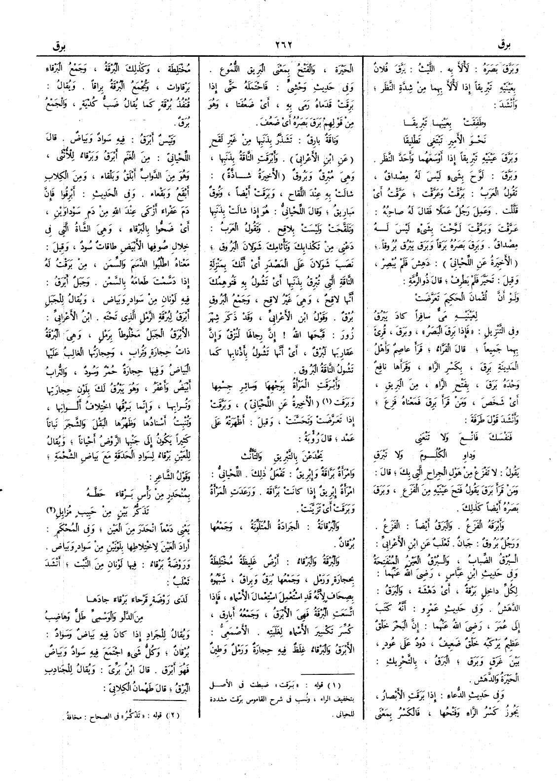 ( * قوله « الاخيرة إلخ » ضبطت في الأصل بتخفيف الراء ونسب في شرح القاموس برّقت مشددة للحياني ) عن اللحياني وبرَّقَت إذا تعرَّضت وتحسَّنت وقيل أَظْهرته على عَمْد قال رؤبة يَخْدَعْنَ بالتبْريق والتأَنُّث وامرأَة برَّاقة وإبْريق تفعل ذلك اللحياني امرأَة إبريق إذا كانت برَّاقة ورعَدت المرأَة وبرَقَت أَي تزيَّنت والبُرْقانةُ الجَرادة المتلوّنة وجمعها بُرْقانٌ والبُرْقةُ والبَرْقاء أَرض غليظة مختلطة بحجارة ورمل وجمعها بُرَقٌ وبِراقٌ شبهوه بِصِحاف لأَنه قد استعمل استعمال الأَسماء فإذا اتسعت البُرقة فهي الأَبْرَقُ وجمعه أَبارق كسِّر تكسير الأَسماء لغلبته الأَصمعي الأَبْرقُ والبَرْقاء غِلَظ فيه حجارة ورمل وطين مختلطة وكذلك البُرْقة وجمع البَرقاء بَرْقاوات وتجمع البُرقة بِراقاً ويقال قُنْفُذُ بُرْقةٍ كما يقال ضَبُّ كُدْية والجمع بُرَقٌ وتَيْسٌ أَبرقُ فيه سواد وبياض قال اللحياني من الغنم أَبرق وبَرقاء للأُنثى وهو من الدوابّ أَبلَق وبَلْقاء ومن الكلاب أَبقَع وبَقْعاء وفي الحديث أَبْرِقُوا فإنَّ دمَ عَفْراء أَزكى عند الله من دم سَوْداوين أَي ضَحُّوا بالبرقاء وهي الشاة التي في خِلال صوفها الأَبيض طاقات سود وقيل معناه اطلُبوا الدَّسَمَ والسِّمَن من بَرَقْت له إذا دسَّمْتَ طعامه بالسمْن وجبَل أَبرقُ فيه لونانِ من سواد وبياض ويقال للجبَل أَبرقُ لبُرْقة الرمل الذي تحته ابن الأَعرابي الأَبرقُ الجبل مخلوطاً برمل وهي البُرْقةُ ذاتُ حجارة وتراب وحجارتها الغالب عليها البياض وفيها حجارة حُمر وسود والترابُ أَبيض وأَعْفر وهو يَبْرُقُ لك بلوْن حجارتها وترابها وإنما بَرْقُها اختلافُ ألوانها وتُنْبِت أَسنادُها وظهرُها البقْلَ والشجر نباتاً كثيراً يكون إلى جنبها الرَّوضُ أحياناً ويقال للعين بَرْقاء لسواد الحَدقة مع بياض الشحْمة وقول الشاعر بمُنْحَدِرٍ من رأْسِ بَرْقاءَ حَطَّه تذَكُّرُ بَيْنٍ من حَبِيبٍ مُزايِلِ