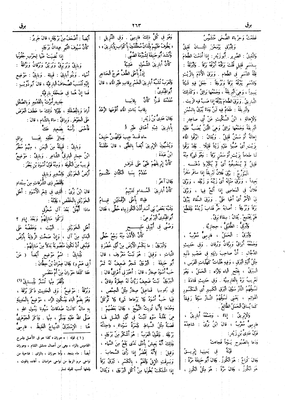 قَطَعْت وحِرْباء الضُّحى مُتَشَوِّسٌ ولِلْبُرْقِ يَرْمَحْنَ المِتانَ نَقِيقُ والنَّقِيق الصَّرِير أبو زيد إذا أَدَمْتَ الطعام بدَسَم قليل قلت بَرَقْتُه أَبْرُقُه بَرْقاً والبُرْقةُ قِلَّة الدسَم في الطعام وبَرَقَ الأُدْمَ بالزيت والدسَم يَبْرُقُه بَرْقاً وبُروقاً جعل فيه شيئاً يسيراً وهي البَريقة وجمعها بَرائقُ وكذلك التبارِيقُ وبرَق الطعامَ يبرُقه إذا صب فيه الزيت والبَريقةُ طعام فيه لبن وماء يُبْرَقُ بالسمْن والإهالةِ ابن السكيت عن أَبي صاعد البَرِيقةُ وجمعها بَرائقُ وهي اللبن يُصَبُّ عليه إهالةٌ أو سمن قليل ويقال ابْرُقوا الماء بزيت أي صبُّوا عليه زيتاً قليلاً وقد بَرَقُوا لنا طعاماً بزيت أو سمْن برْقاً وهو شيء منه قليل لم يُسَغْسِغُوه أَي لم يُكثروا دُهْنه المُؤرِّج بَرَّق فلان تبريقاً إذا سافر سفراً بعيداً وبَرَّقَ منزله أي زَيَّنه وزَوَّقَه وبرَّقَ فلان في المعاصي إذا أَلَحَّ فيها وبَرَّق لي الأَمْرُ أي أعْيا علَيَّ وبَرَق السِّقاءُ يَبْرُق بَرْقاً وبُروقاً أصابه حرٌّ فذابَ زُبْده وتقطَّع فلم يجتمع يقال سِقاء بَرِقٌ والبُرَقِيُّ الطُّفَيْلِيُّ حجازيَّة والبَرَقُ الحَمَلُ فارسيّ معرّب وجمعه أبْراقٌ وبِرْقانٌ وبُرقان وفي حديث الدجال أن صاحِبَ رايتِه في عَجْب ذَنبه مثل أَلْيةِ البَرَقِ وفيه هُلْباتٌ كهُلْبات الفرس البرق بفتح الباء والراء الحمَل وهو تعريب بَرَهْ بالفارسية وفي حديث قتادة تسُوقُهم النارُ سَوقَ البَرَقِ الكَسِير أي المكسور القَوائم يعني تسوقهم النار سَوْقاً رَفِيقاً كما يُساق الحَمَل الظالع والإبْرِيقُ إناء وجمعه أبارِيقُ فارسي معرب قال ابن بري شاهده قول عديّ بن زيد ودَعا بالصَّبُوحِ يوماً فجاءَتْ قَيْنةٌ في يَمينِها إبْرِيقُ وقال كراع هو الكُوز وقال أبو حنيفة مرة هو الكوز وقال مرة هو مثل الكوز وهو في كل ذلك فارسي وفي التنزيل يَطُوف عليهم وِلدان مُخلَّدون بأَكْواب وأَبارِيقَ وأَنشد أبو حنيفة لشُبْرُمةَ الضَّبِّي كأَنَّ أَبارِيقَ الشَّمُولِ عَشِيّةً إوَزٌّ بأَعْلى الطَّفِّ عُوجُ الحناجِرِ والعرب تشبه أبارِيقَ الخمر برقاب طير الماء قال أبو الهِنْدِيّ مُفَدَّمة قَزّاً كأنَّ رِقابَها رِقابُ بناتِ الماء أَفْزَعَها الرَّعْد وقال عدي بن زيد بأَبارِيقَ شِبْهِ أَعْناقِ طَيْرِ ال ماءِ قد جِيبَ فوْقَهُنَّ حَنِيفُ ويشبهون الإبْرِيق أيضاً بالظبي قال عَلْقَمةُ بن عَبْدة كأَنَّ إبْرِيقَهم ظبيٌ على شَرَفٍ مُفَدَّمٌ بِسَبا الكَتّانِ مَلْثُومُ وقال آخر كأنَّ أبارِيقَ المُدامِ لدَيْهِمُ ظِباء بأعْلى الرَّقْمَتَيْنِ قِيامُ وشبّه بعضُ بني أسد أُذن الكُوز بياء حطِّي فقال أبو الهندي اليَرْبوعِيّ وصُبِّي في أُبَيْرِقٍ مَلِيحٍ كأنَّ الأُذْن منه رَجْعُ حُطِّي والبَرْوَقُ ما يكْسُو الأَرض من أَوّل خُضْرة النبات وقيل هو نبت معروف قال أبو حنيفة البَرْوَقُ شجر ضعيف له ثمر حبٌّ أسود صغار قال أَخبرني أَعرابي قال البَرْوَقُ نبت ضعيف رَيّانُ له خِطَرةٌ دِقاقٌ في رُؤوسِها قَماعِيلُ صِغار مثل الحِمَّص فيها حبّ أسود ولا يرعاها شيء ولا تؤكل وحدها لأَنها تُورِث التَّهَبُّجَ وقال بعضهم هي بقلة سَوْء تَنْبُت في أوّل البقل لها قَصبة مثل السِّياط وثمرة سَوْداء واحدته بَرْوَقة وتقول العرب هو أشكَرُ من بَرْوقٍ وذلك أنه يَعِيشُ بأدْنى ندَّى يقع من السماء وقيل لأَنه يخضرّ إذا رأى السحاب وبَرِقَت الإبل والغنم بالكسر تَبْرَق بَرَقاً إذا اشْتَكت بُطونها من أكل البَرْوَق ويقال أيضاً أضْعفُ من بَرْوقةٍ قال جرير كأَنَّ سُيوفَ التَّيْمِ عيدانُ بَرْوَقٍ إذا نُضِيَت عنها لحَرْبٍ جُفُونُها وبارِقٌ وبُرَيْرِقٌ وبُرَيْقٌ وبُرْقان وبَرّاقة أَسماء وبنو أبارِقَ قبيلة وبارِقٌ موضع إليه تُنسب الصِّحافُ البارقية قال أبو ذؤيب فما إنْ هُما في صَحْفةٍ بارِقِيّةٍ جَديدٍ أُمِرَّتْ بالقَدُومِ وبالصَّقْلِ أَراد وبالمِصْقلة ولولا ذلك ما عطَف ال