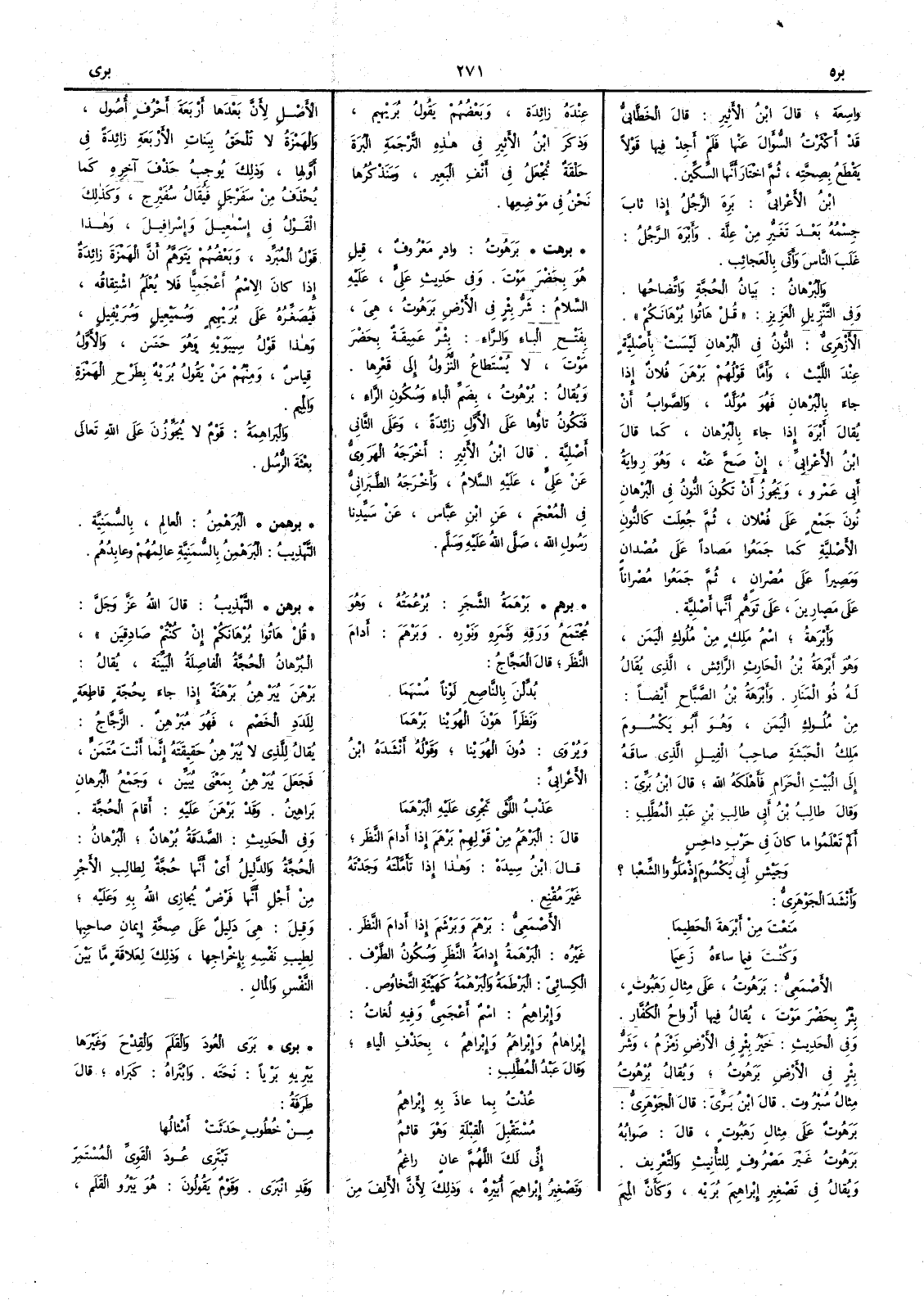 ( برهم ) بَرْهَمةُ الشجَرِ بُرْعُمَتُهُ وهو مُجْتَمَعُ ورَقه وثَمره ونَوْره وبَرْهَمَ أَدام النظَر قال العجاج بُدَّلْنَ بالنّاصعِ لَوْناً مُسْهَما ونَظَراً هَوْنَ الهُوَيْنا بَرْهَما ويروى دون الهُوَيْنا وقوله أَنشده ابن الأَعرابي عَذْب اللِّثى تَجْرى عليه البرْهَما قال البَرْهَمُ من قولهم بَرْهَمَ إذا أَدام النظرَ قال ابن سيده وهذا إذا تأَمَّلْته وجَدْته غير مُقْنِع الأَصمعي بَرْهَمَ وبَرْشَم إذا أَدام النظر غيرهُ البَرْهَمةُ إدامةُ النظَر وسكون الطَّرْف الكسائي البَرْطَمةُ والبَرْهَمَةُ كهيئة التَّخاوُص وإبراهيم اسم أَعجمي وفيه لغات إبْراهامُ وإبْراهَم وإبْراهِمُ بحذف الياء وقال عبد المطلب عُذْتُ بما عاذَ به إبْراهِمُ مُسْتَقْبِلَ القِبْلةِ وهْو قائمُ إني لك اللَّهمَّ عانٍ راغِمُ وتصغيرُ إبراهيم أُبَيْرِةٌ وذلك لأَن الأَلف من الأَصل لأن بعدَها أَربعة أَحرف أُصول والهمزة لا تُلْحق ببَنات الأَربعة زائدة في أَوَّلها وذلك يُوجِب حَذف آخره كما يُحذف من سَفَرْجَل فيقال سُفَيْرج وكذلك القولُ في إسمعيل وإسرافيل وهذا قولُ المبرّد وبعضُهم يتوهَّم أن الهمزة زائدة إذا كان الاسم أعْجميّاً فلا يُعْلَم اشتِقاقُه فيصغِّره على بُرَيْهِيمٍ وسُمَيْعيلٍ وسُرَيْفيلٍ وهذا قول سيبويه وهو حسن والأَوَّل قِياسٌ ومنهم مَن يقول بُرَيْهٌ بطَرْح الهمزة والميم والبَراهِمةُ قوم لا يُجَوِّزُونَ على الله تعالى بِعْثةَ الرسل
