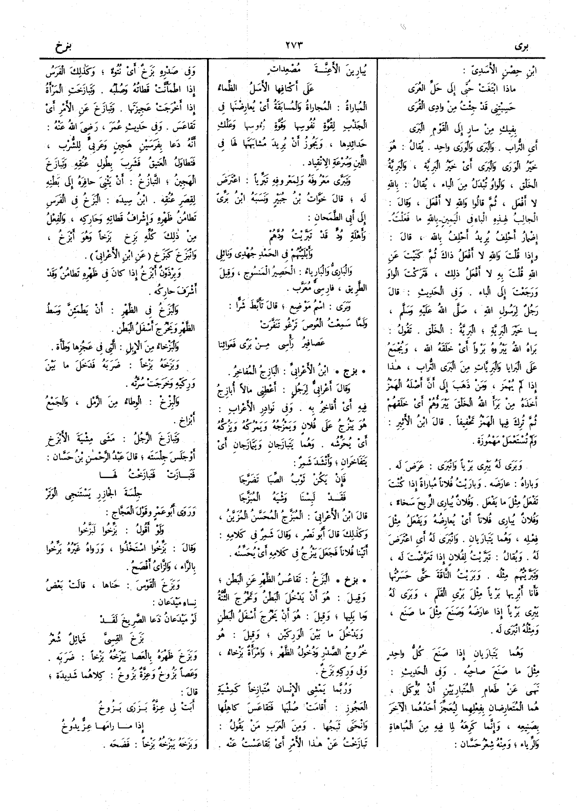 ابن حِصْنٍ الأَسَدِيّ : ماذا ابْتَغَتْ حُبَّى إِلى حَلِّ العُرى حَسِبْتِني قد جِئْتُ من وادِي القُرَى بِفيك من سارٍ إِلى القومِ البَرَى أَي التراب . و البَرَى والوَرَى واحد . يقال : هو خير الوَرَى و البَرَى أَي خير البَرِيَّة و البَرِيَّةُ الخَلْق والواو تبدل من الباء يقال : با لا أَفعل ثم قالوا وا لا أَفعل وقال : الجالب لهذه الباء في اليمين با ما فعلت إِضمار أَحلف يريد أَحلف با قال : وإِذا قلت وا لا أَفعل ذاك ثم كَنَيْتَ عن الله قلت به لا أَفعل ذلك فتركتَ الواو ورجعتَ إِلى الباء . وفي الحديث : قال رجل لرسول الله يا خَيْرَ البَرِيَّةِ البَرِيَّةُ : الخلق . تقول : بَراهُ الله يَبْرُوه بَرْواً أَي خلقه الله ويُجْمَعُ على البَرايا و البَرِيَّات من البَرَى التراب هذا إِذا لم يهمز ومن ذهب إِلى أَن أَصله الهمز أَخذه من بَرَأَ الله الخلق يَبْرَؤُهم أَي خَلَقهم ثم تركَ فيها الهمز تخفيفاً . قال ابن الأَثير : ولم تستعمل مهموزة . و بَرَى له يَبْرِي بَرْياً و انْبَرَى عَرَضَ له . و باراه : عارَضَه . و بارَيْتُ فلاناً مُباراة إِذا كنت تفعل مثل ما فعله . وفلان يُباري الريحَ سَخاءً وفلان يُباري فلاناً أَي يعارضه ويفعل مثل فعله وهما يَتَبارَيانِ . و انْبَرَى له أَي اعتَرَض له . ويقال : تَبَرَّيْتُ لفلان إِذا تعرّضت له و تَبَرَّيْتُهم مثله . و بَرَيْتُ الناقةَ حتى حَسَرْتُها فأَنا أَبْرِيها بَرْياً مثل بَرْي القلم و بَرَى له يَبْرِي بَرْياً إِذا عارضه وصَنع مثل ما صنع ومثله انْبَرَى له . وهما يتباريان إِذا صنع كل واحد مثل ما صنع صاحبه . وفي الحديث : نهى عن طعام المُتَبارِيَيْنِ أَن يؤكل هما المتعارضان بفعلهما ليُعَجِّزَ أَحدُهما الآخَر بصنيعه وإِنما كرهه لما فيه من المباهاة والرياء ومنه شعر حسان : يُبارِينَ الأَعِنَّةَ مُصْعِداتٍ على أَكْتافِها الأَسَلُ الظِّماءُ المُباراة : المُجاراة والمسابقة أَي يُعارِضْنَها في الجَذْب لقوة نفوسها وقوة رؤوسها وعَلْكِ حَدائدها ويجوز أَن يريد مُشابَهَتَها لها في اللِّين وسُرعة الانقياد . و تَبَرَّى معروفه ولِمَعْروفهٍ تَبَرِّياً : اعترض له قال خَوَّاتُ بن جُبَير ونسبه ابن بري إِلى أَبي الطَّمَحان : وأَهْلَةِ وُدَ قد تَبَرَّيْتُ وُدَّهُمْ وأَبْلَيْتُهم في الحَمْدِ جُهْدِي ونائِلي و البارِي و البَارِياءُ : الحصير المنسوج وقيل الطريق فارسي معرّب . و بَرَى : اسم موضع قال تأَبط شرّاً : ولَمَّا سَمِعْتُ العُوصَ تَرْغُو تَنَفَّرَتْ عَصافيرُ رأْسِي من بَرىً فعَوائنا