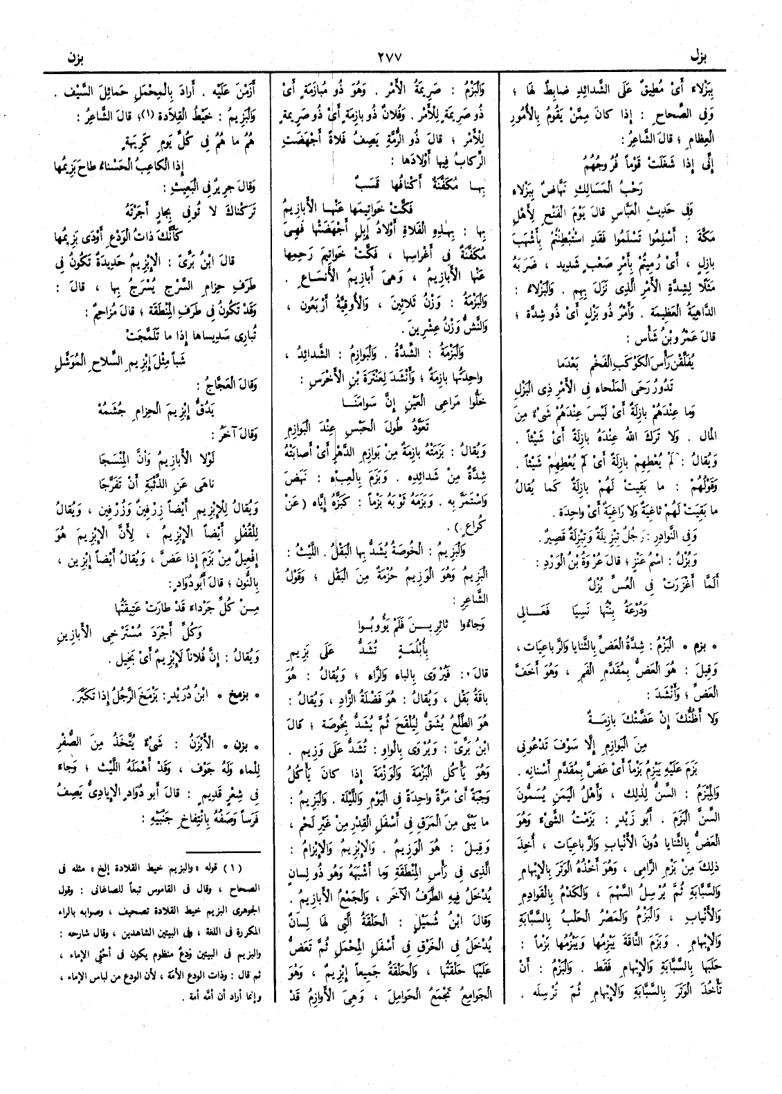( * قوله « والبزيم خيط القلادة إلخ » مثله في الصحاح وقال في القاموس تبعاً للصاغاني وقول الجوهري البزيم خيط القلادة تصحيف وصوابه بالراء المكررة في اللغة وفي البيتين الشاهدين وقال شارحه والبريم في البيتين ودع منظوم يكون في أحقي الإماء ثم قال وذات الودع الأمة لأن الودع من لباس الإماء وإنما أراد أن أمة أمة ) قال الشاعر هُمُ ما هُمُ في كل يَومِ كَريهة إذا الكاعِبُ الحَسْناء طاحَ بَزيمُها وقال جرير في البَعِيث تَركناك لا تُوفي بِجارٍ أَجَرْتَهُ كأَنَّك ذاتُ الوَدْعِ أَوْدى بَزيمُها قال ابن بري الإِبْزيمُ حديدةٌ تكون في طرَف حزام السرْج يَسْرَج بها قال وقد تكون في طَرف المِنْطَقة قال مُزاحِم تُباري سَديساها إذا ما تَلَمَّجَت شَباً مِثل إِبْزيمِ السلاح المُوشَّلِ وقال العجاج يَدُقُّ إبْزيمَ الحِزام جُشَمُهْ وقال آخر لولا الأبازيمُ وانَّ المِنْسَجا ناهى عنِ الذِّئْبَةِ أَن تَفَرَّجا ويقال للإبْزيمِ أَيضاً زِرْفين وزُرْفين ويقال للقُفْل أَيضاً الإبْزيم لأَن الإبْزِيم هو إِفْعِيل من بزَم إذا عضَّ ويقال أَيضاً إِبْزين بالنون قال أَبو دواد من كُلِّ جَرْداء قد طارتْ عَتِيقَتُها وكُلِّ أَجْرَد مُسْتَرْخي الأَبازِينِ ويقال إنَّ فلاناً لإبْزيمٌ أَي بَخِيل